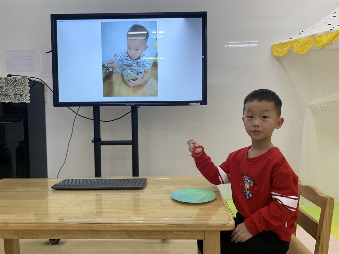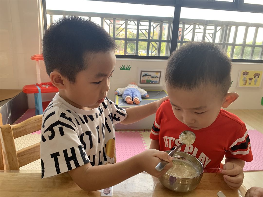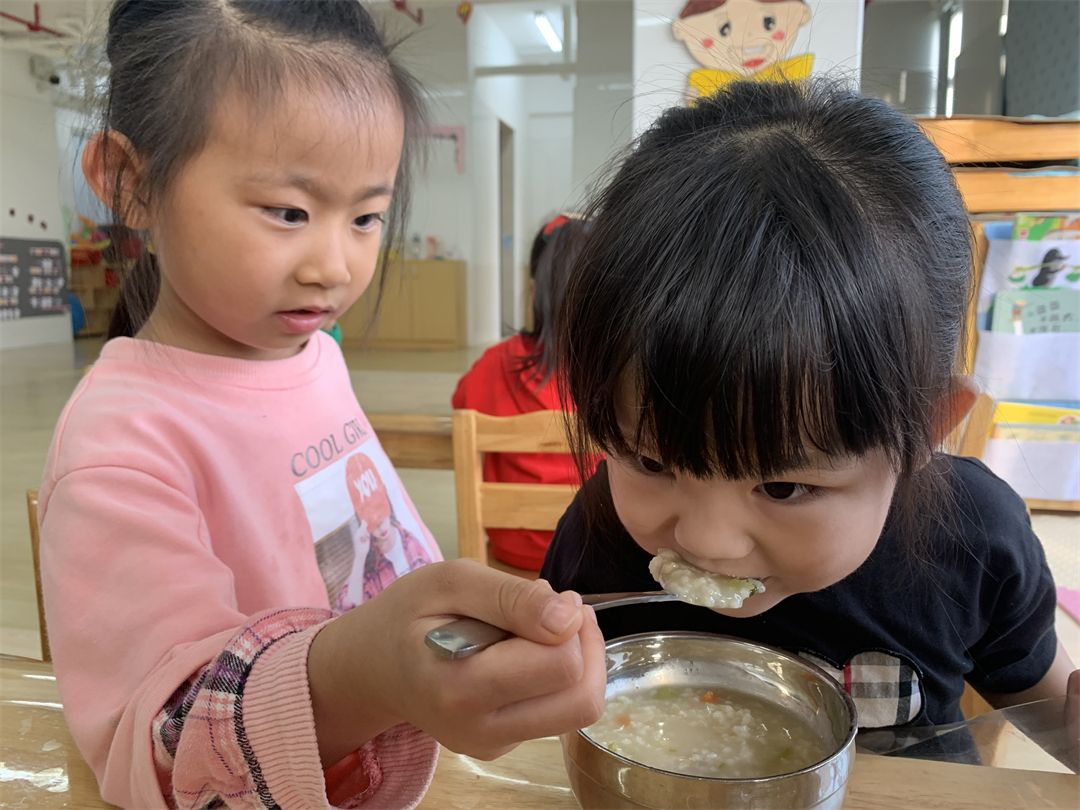 我耐心地帮助弟弟妹妹吃饭,鼓励他不要担心,一定很快就会适应幼儿园生活了!