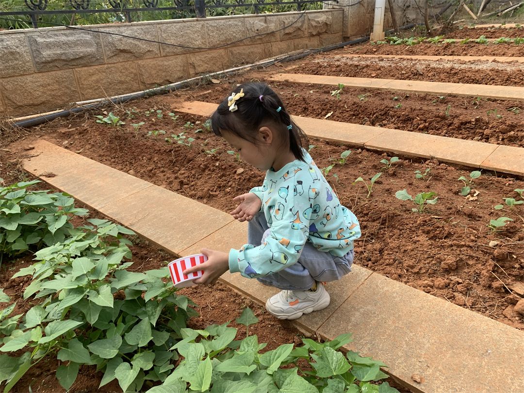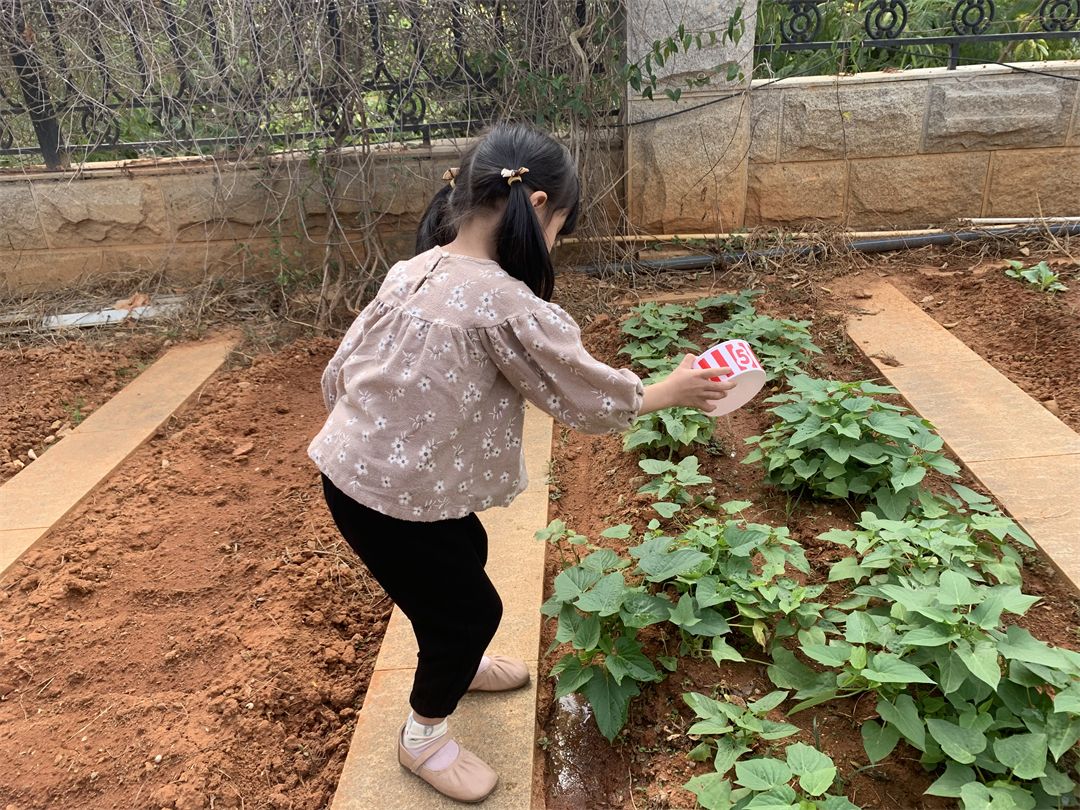 最令人快乐的是每天早上来幼儿园时,我们可以帮忙照顾小菜地了,看着被自己照顾的菜苗慢慢地长大,真是让人满足呀!