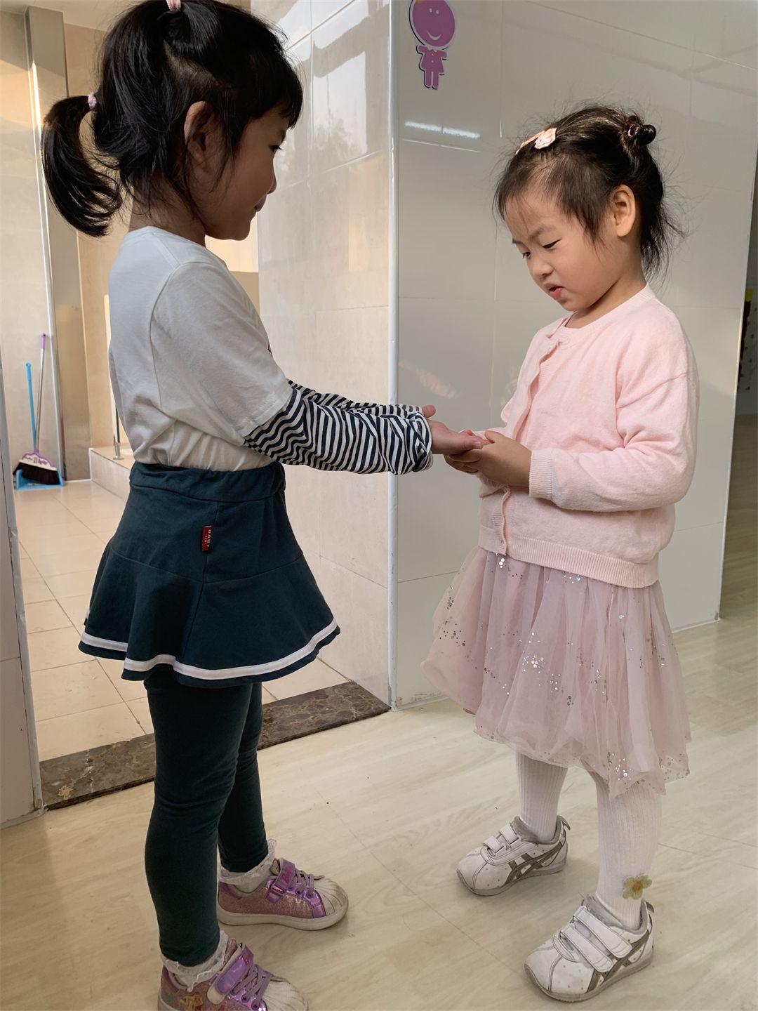 我们还当小老师了呢,在洗手间帮忙检查小朋友的小手有没有洗干净。