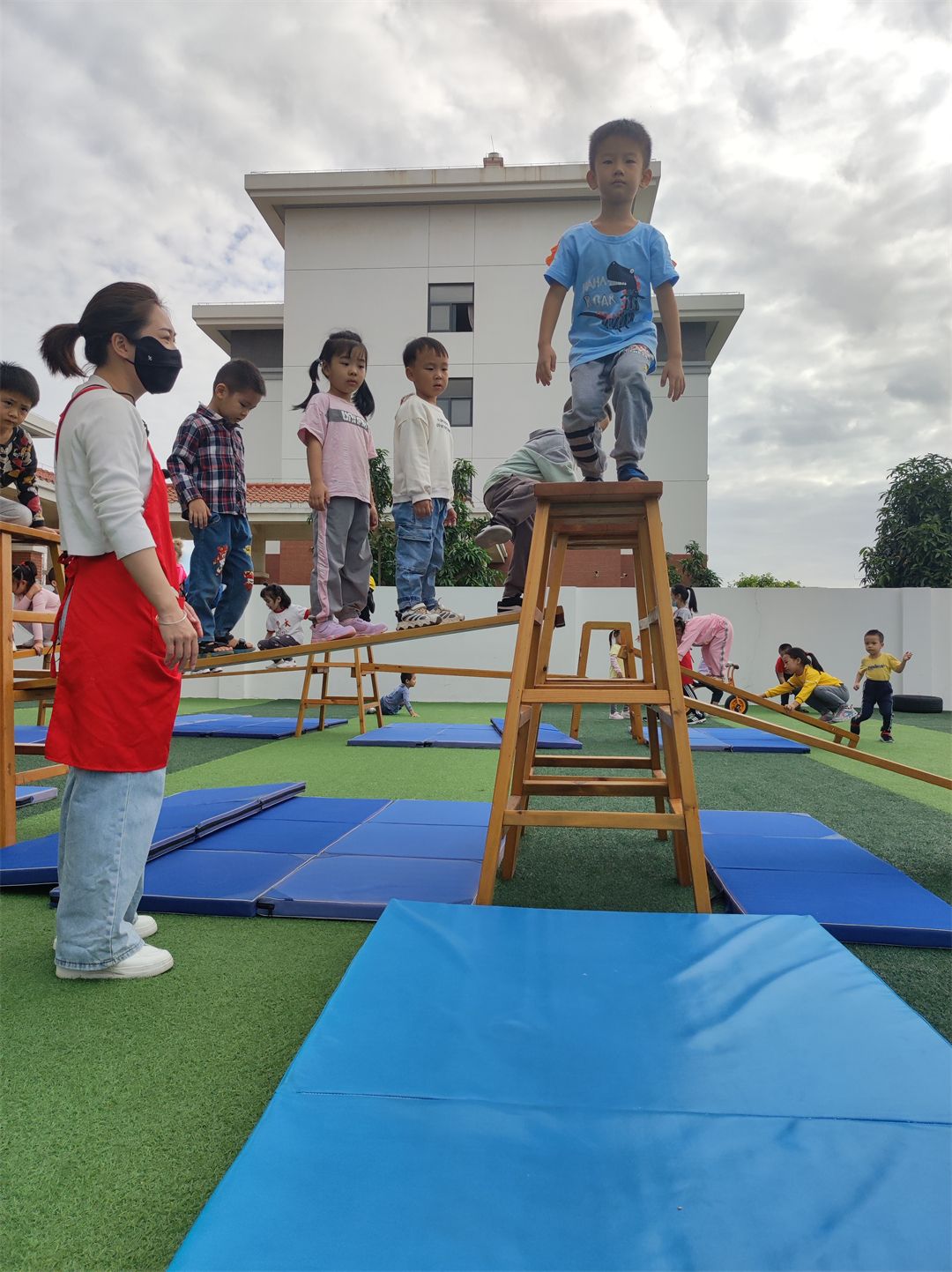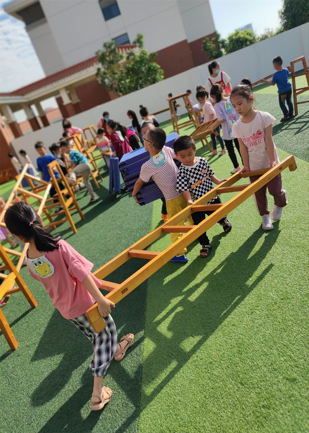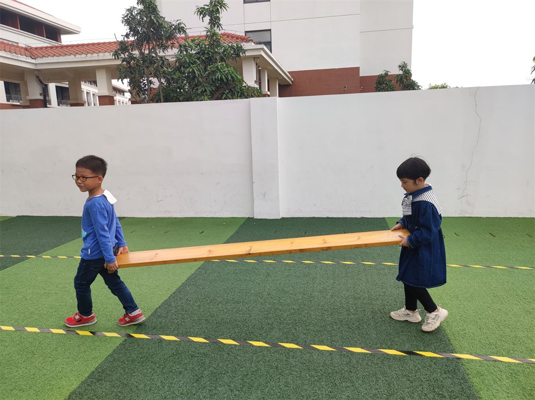 在老师的带领下,孩子们互帮互助,在合作中,孩子们把手中的木梯、木架、木板成了探索的工具,变“小山”,变“独木桥”,变“滑滑梯”,根据自己的想法和意愿开展自主自由的安吉游戏。瞧,他们玩得多开心呀!