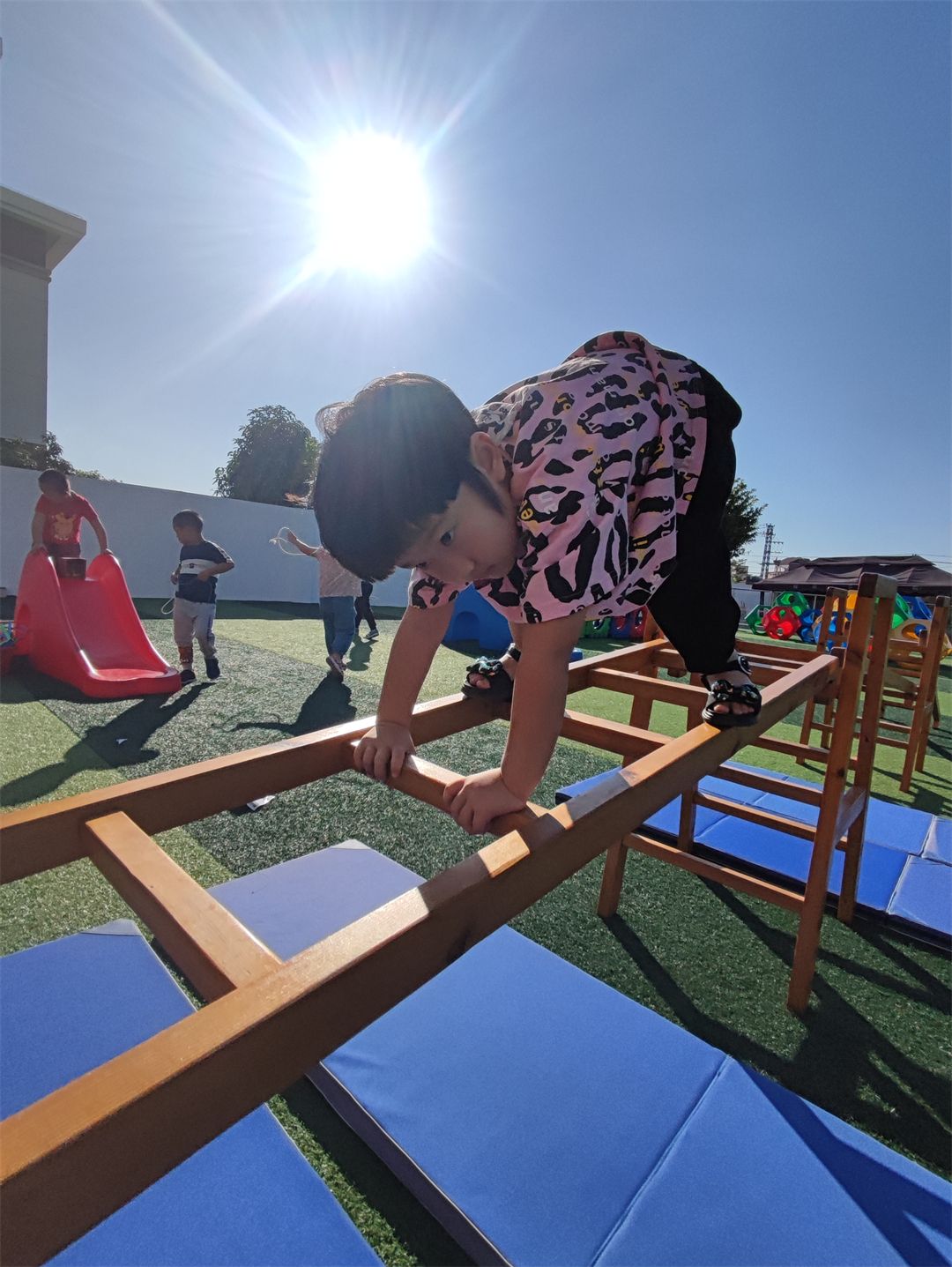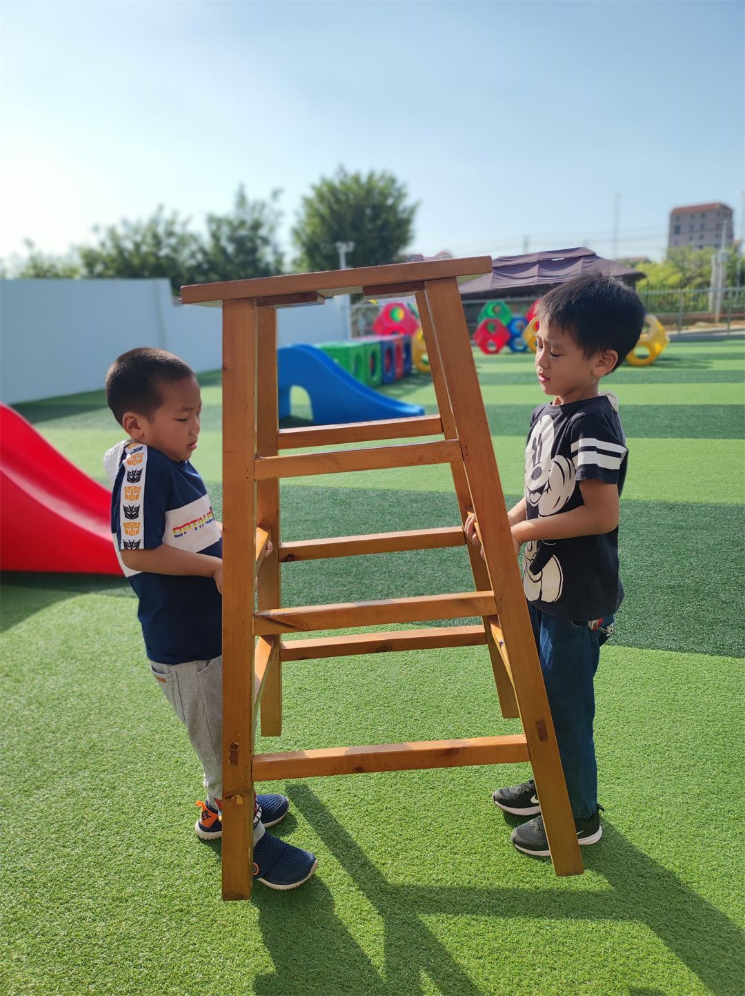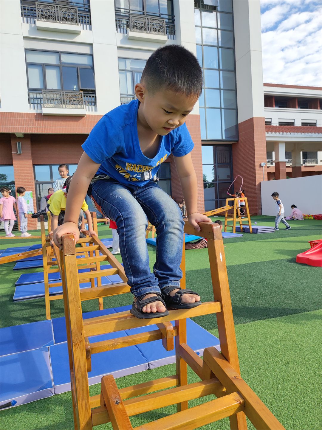 在老师的带领下,孩子们互帮互助,在合作中,孩子们把手中的木梯、木架、木板成了探索的工具,变“小山”,变“独木桥”,变“滑滑梯”,根据自己的想法和意愿开展自主自由的安吉游戏。瞧,他们玩得多开心呀!