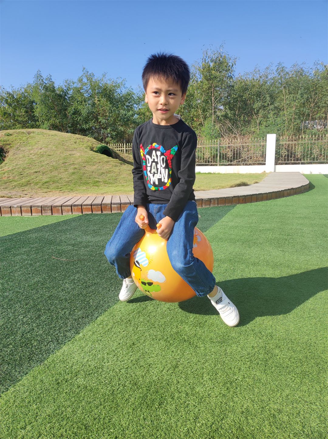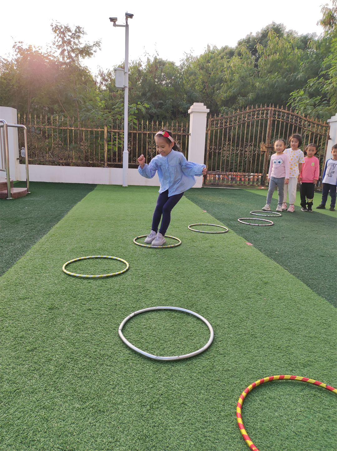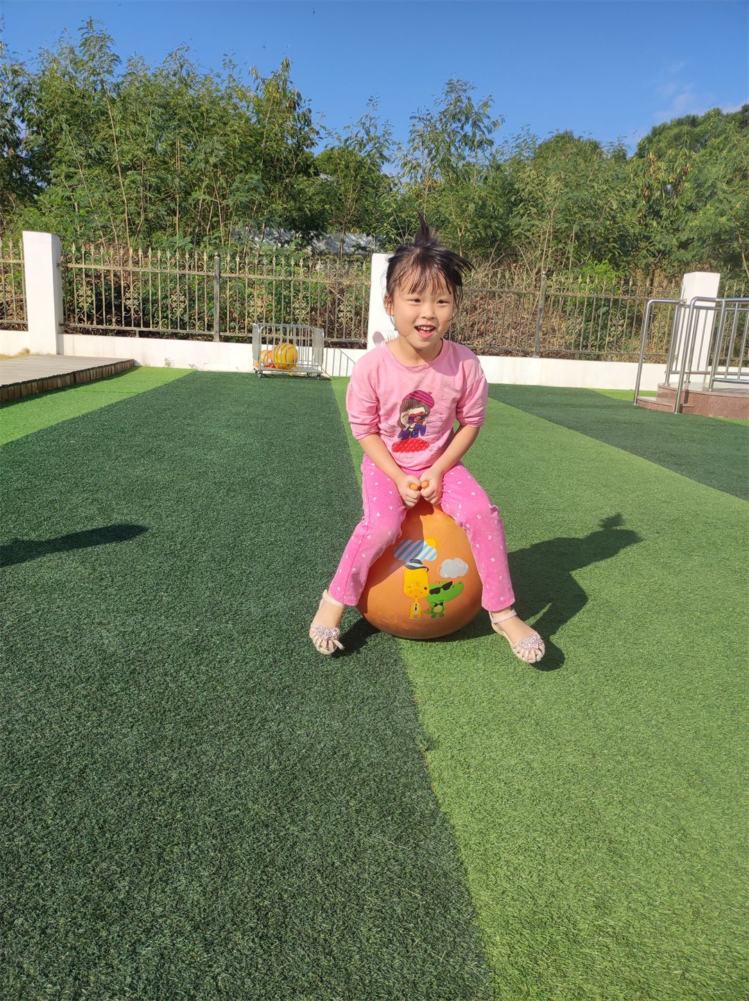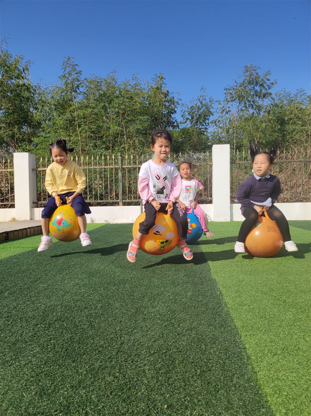 “加油,加油!”沿着加油的呐喊声望去,原来是孩子们在比赛跳羊角球。