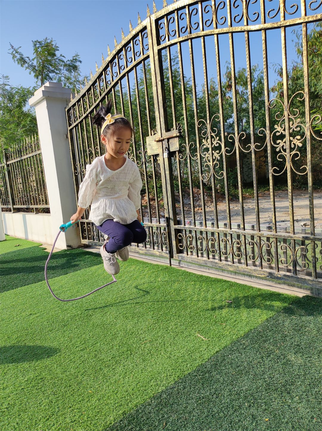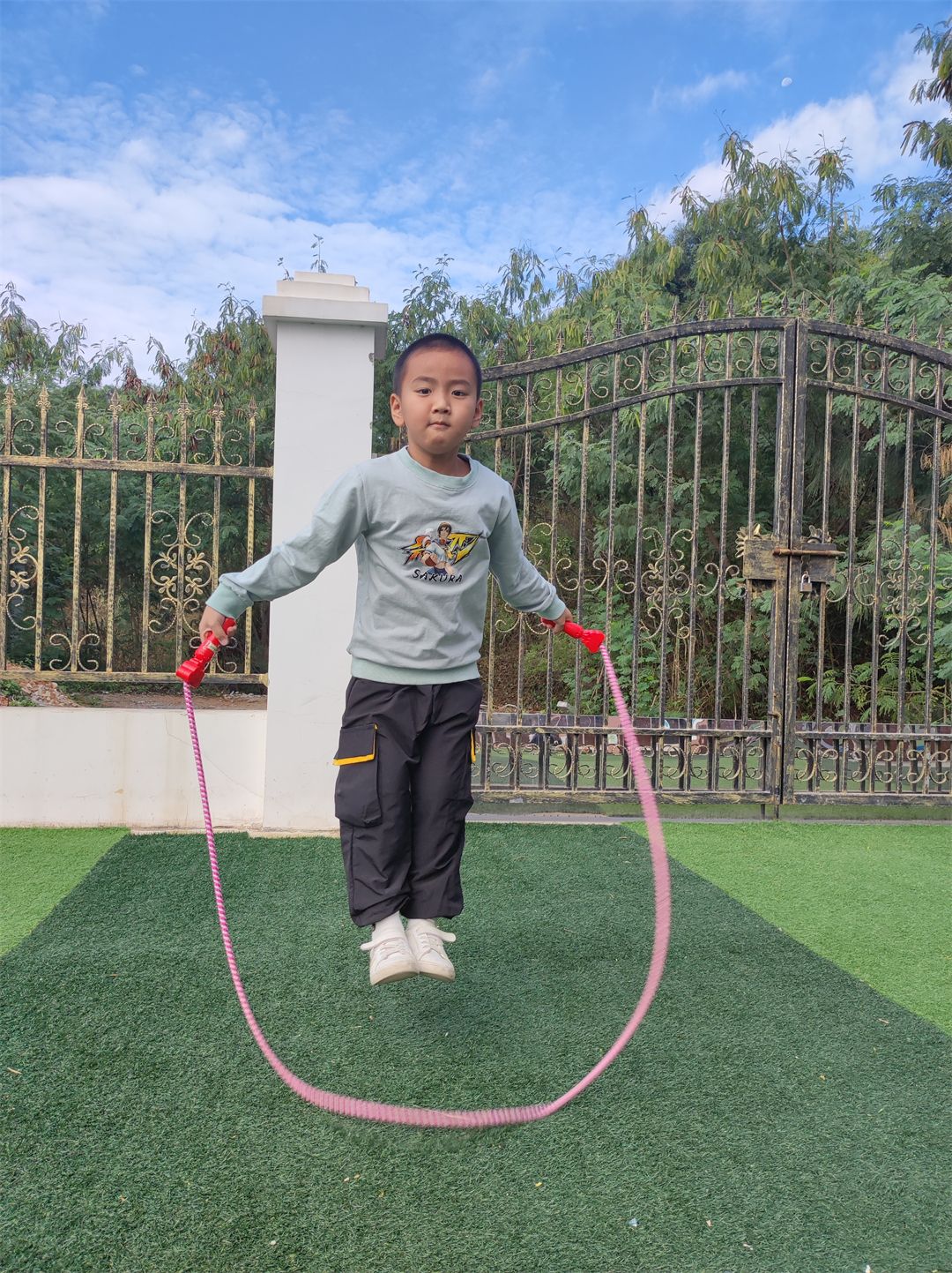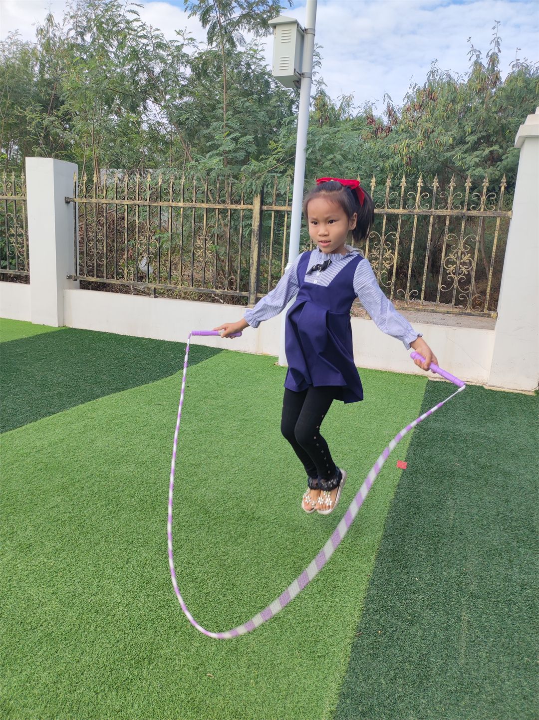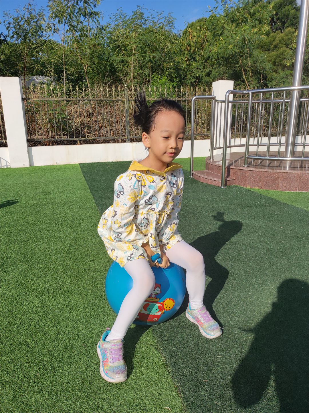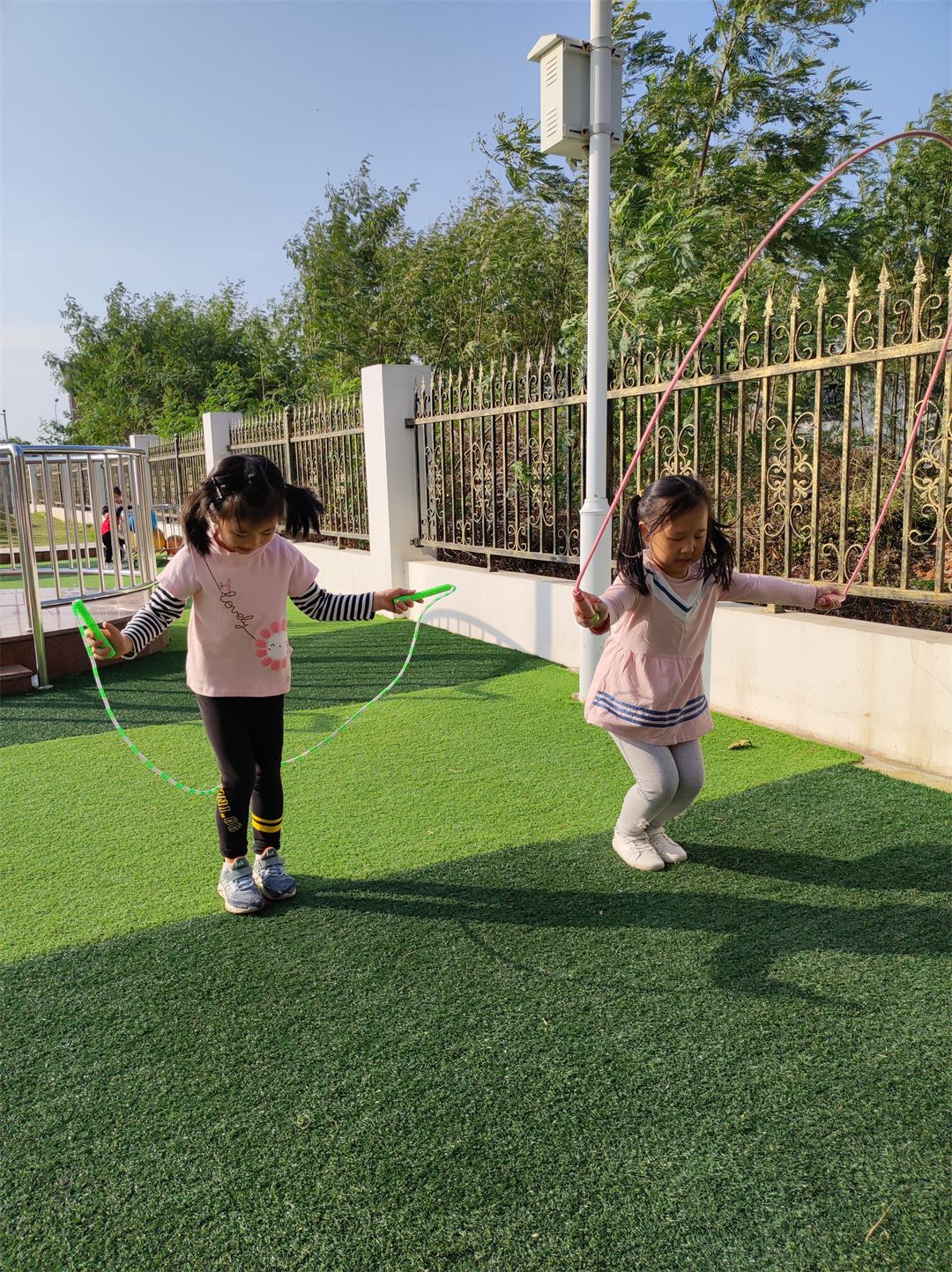 “加油,加油!”沿着加油的呐喊声望去,原来是孩子们在比赛跳羊角球。