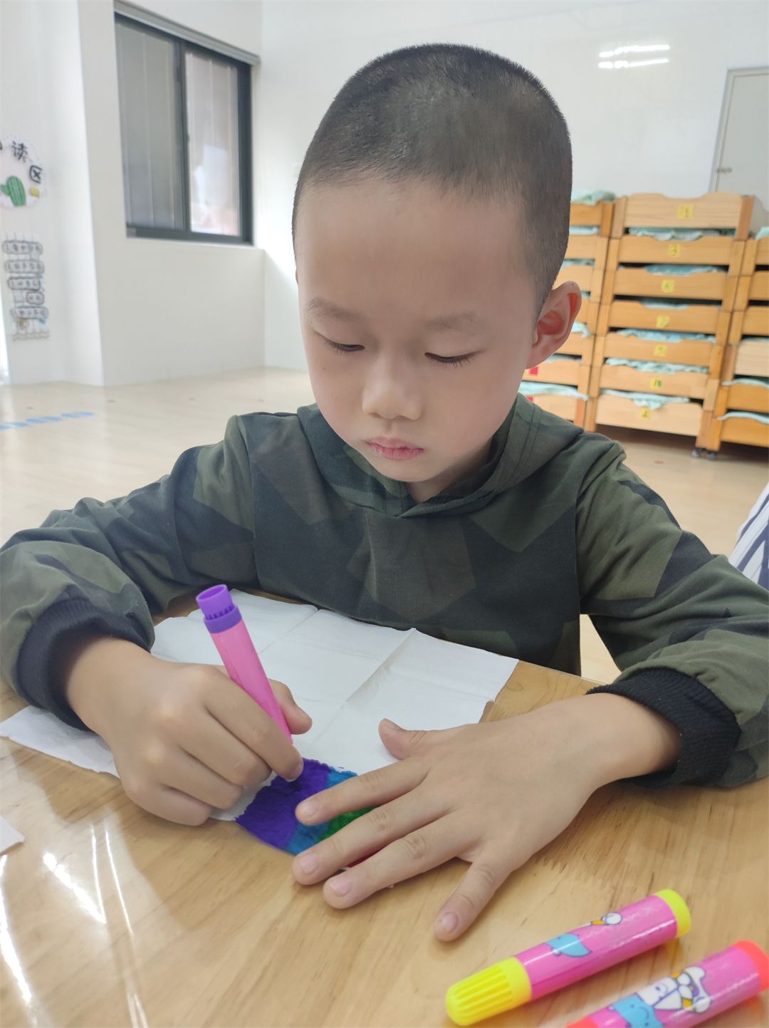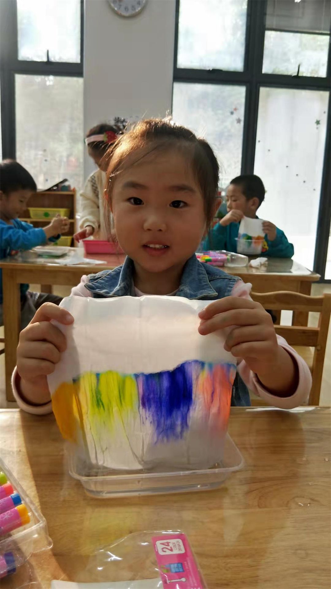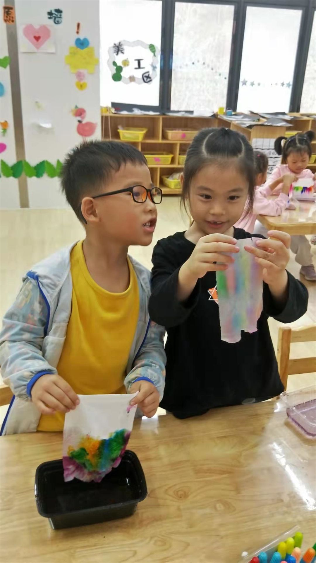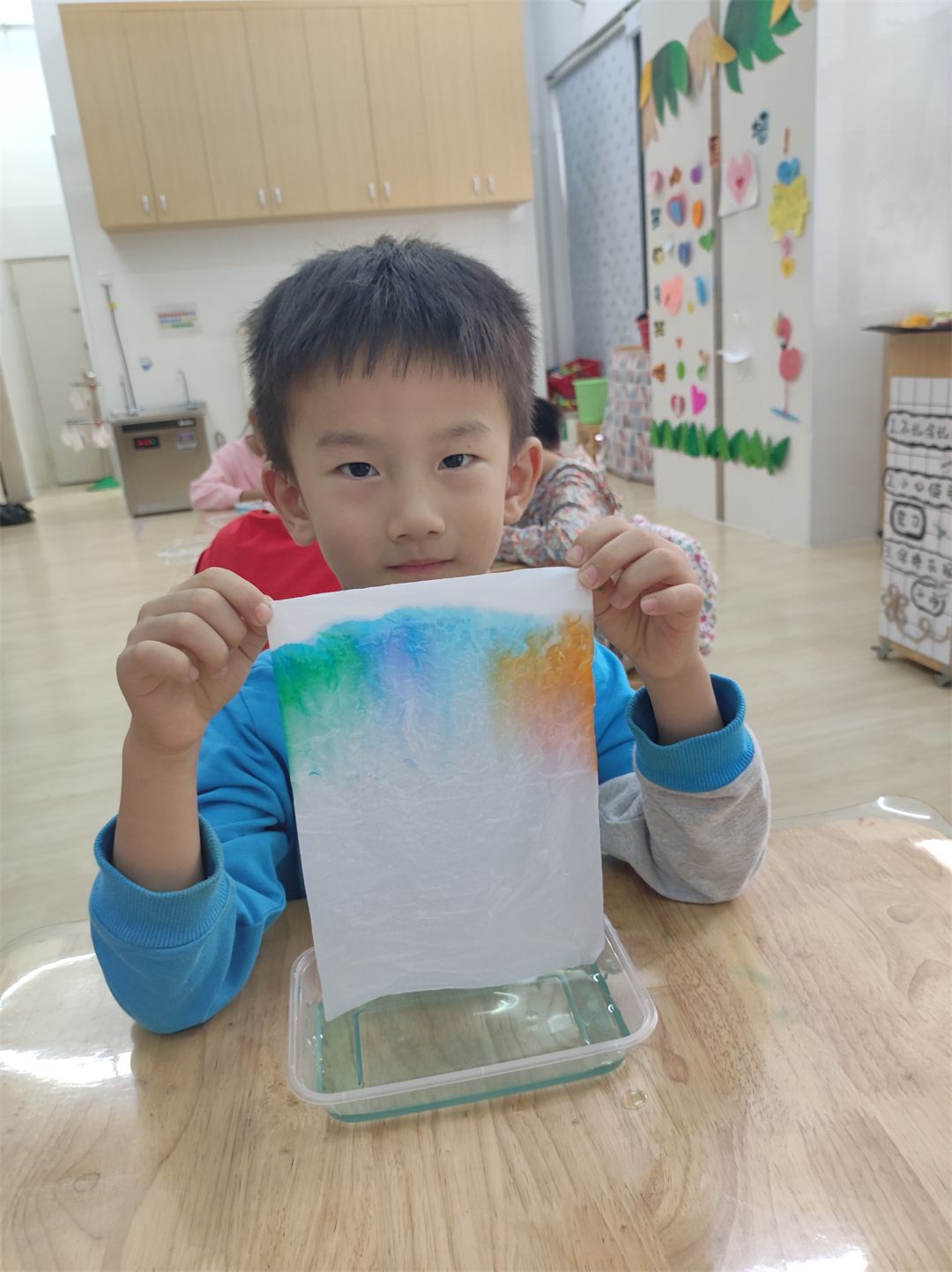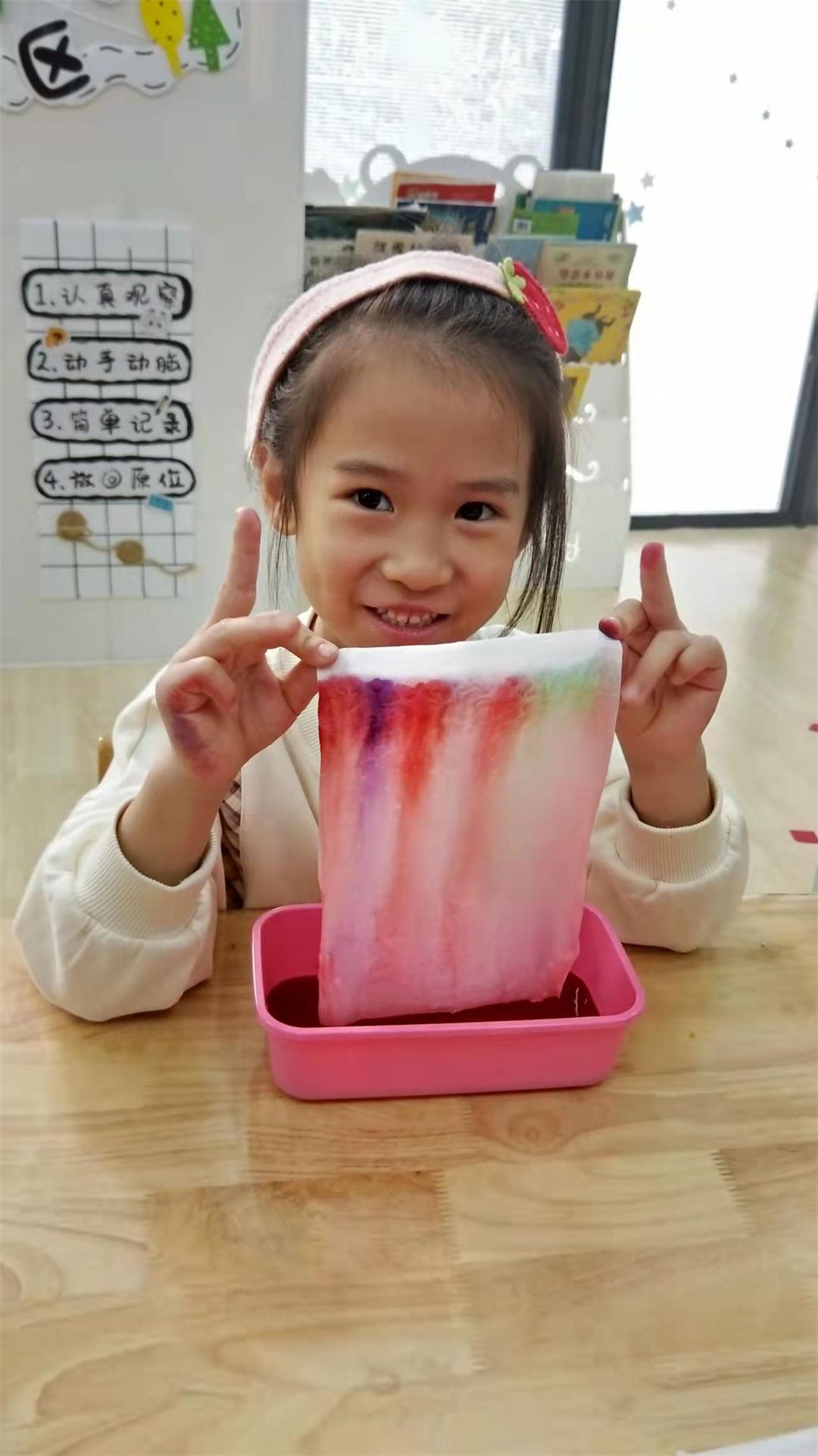 接着,孩子们小心翼翼的拿起涂好颜色的餐巾纸,将有颜色的一面轻轻的接触清水,让餐巾纸充分吸收水分。当有涂有颜料的餐巾纸遇上清水后,会发生什么变化呢?一起来见证奇迹吧。