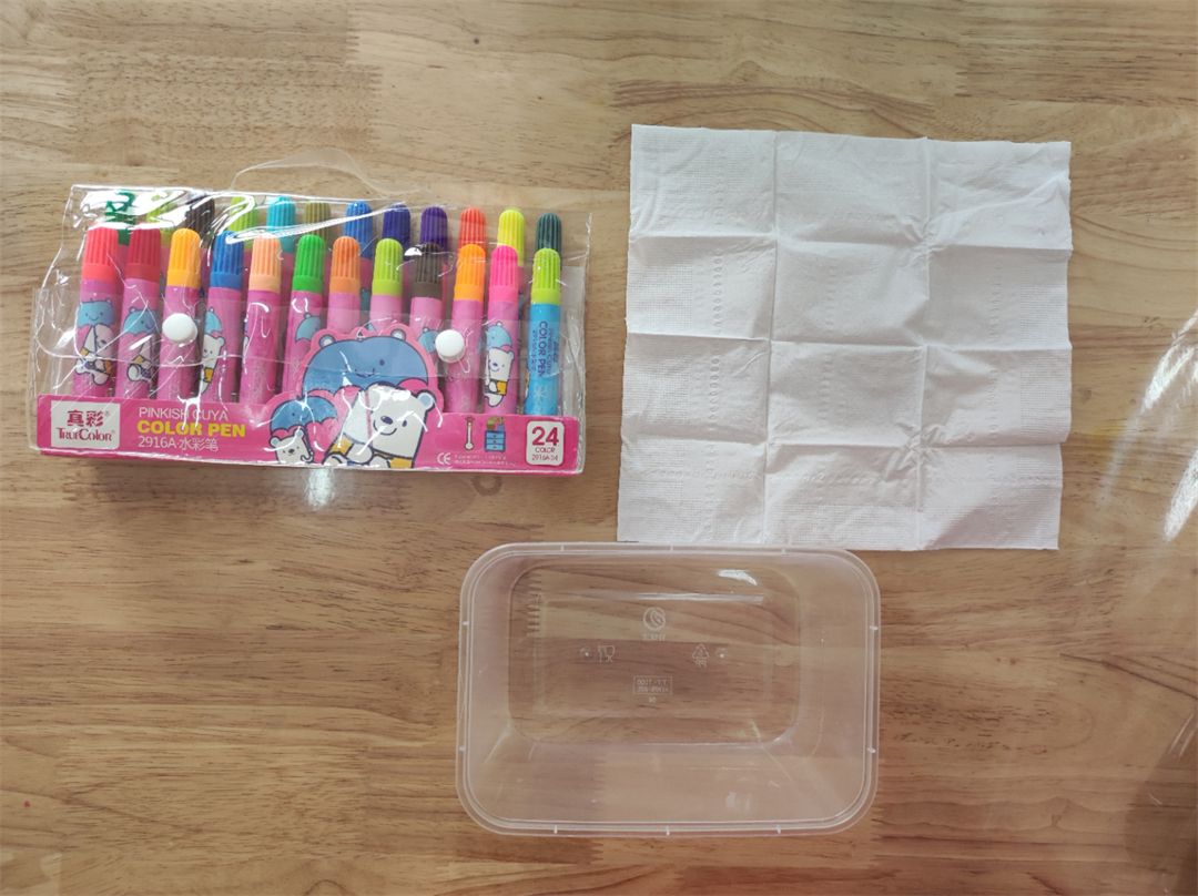 需要的材料:一张餐巾纸、彩笔、装着清水的器皿。