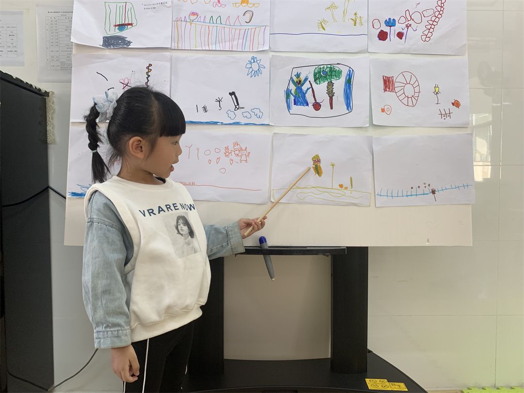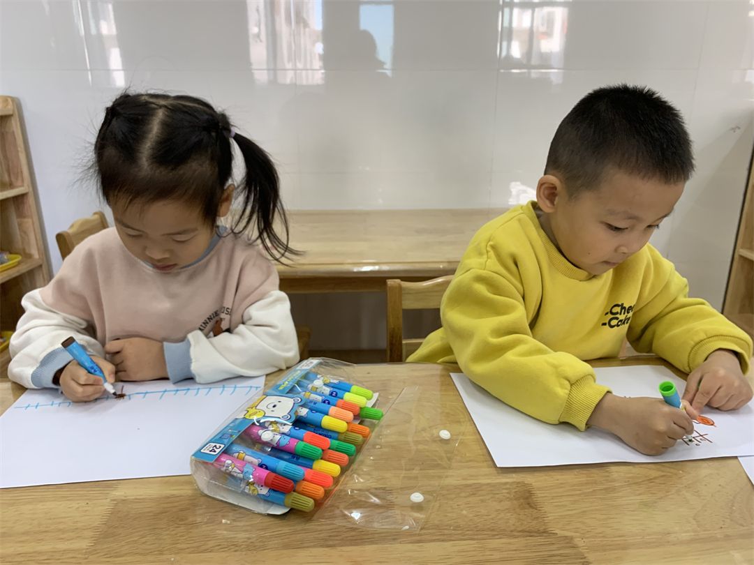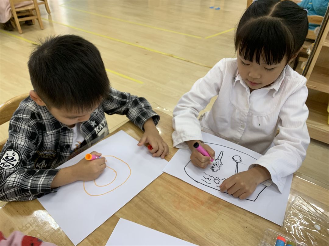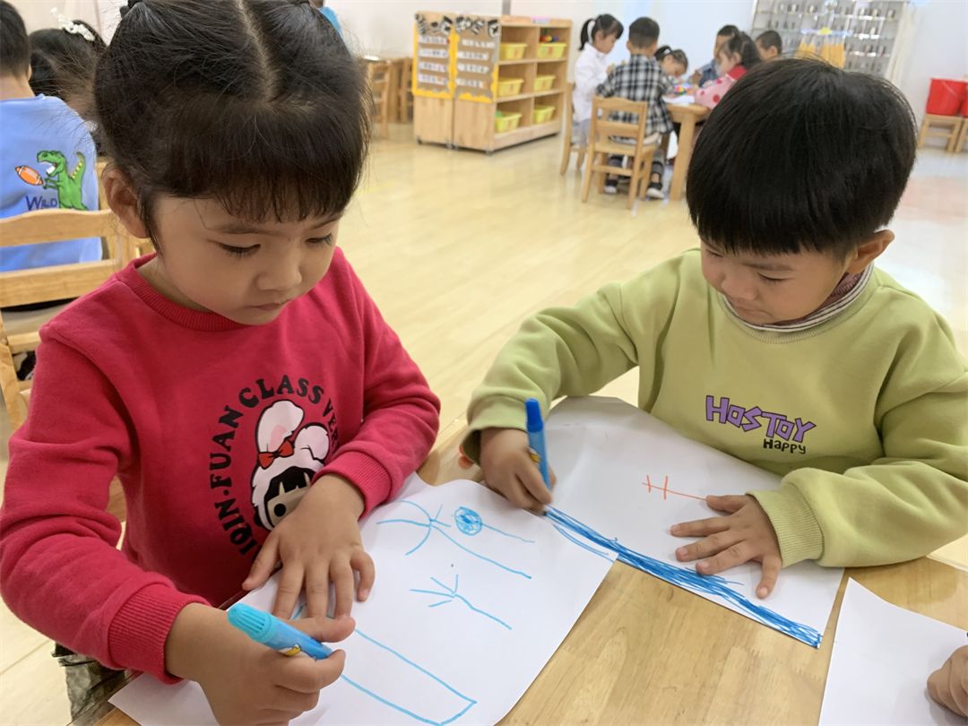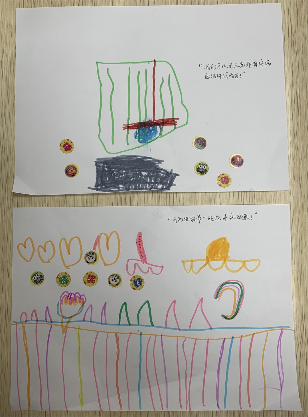 我们惦记着落在栏杆外的海绵球,吃完点心后,我们将自己想到的办法用绘画的方式记下来。
