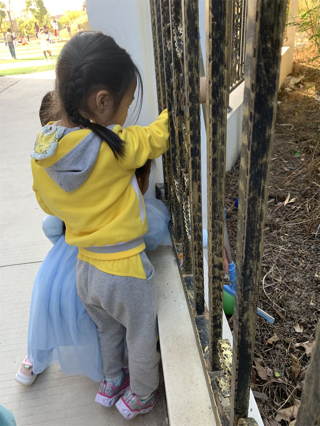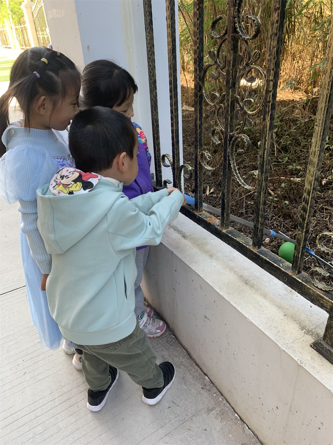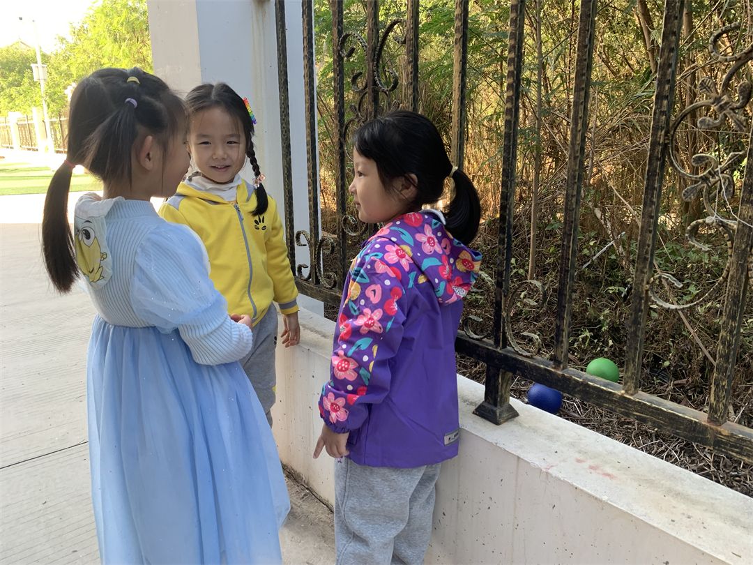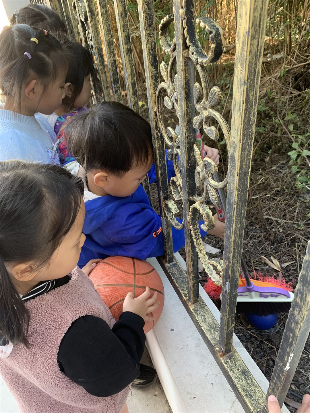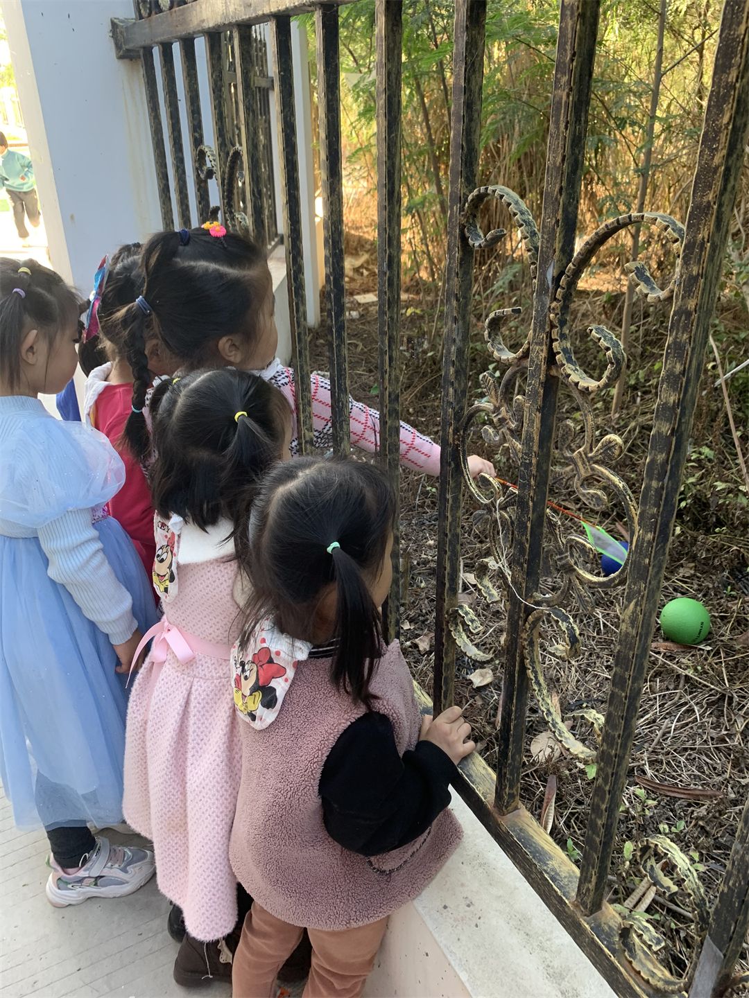 我们在户外活动玩得正开心时,突然,阳阳的海绵球掉到栏杆外面了,这可怎么办呀?我们伸出小手试探能不能够到球,然后围在栏杆前讨论了起来……