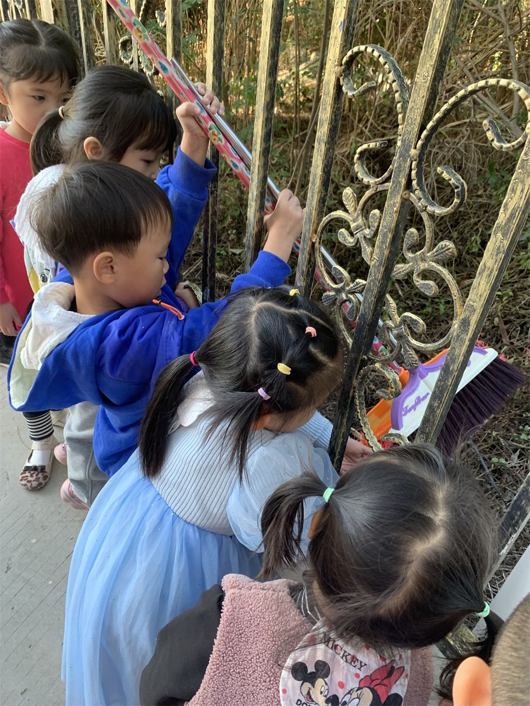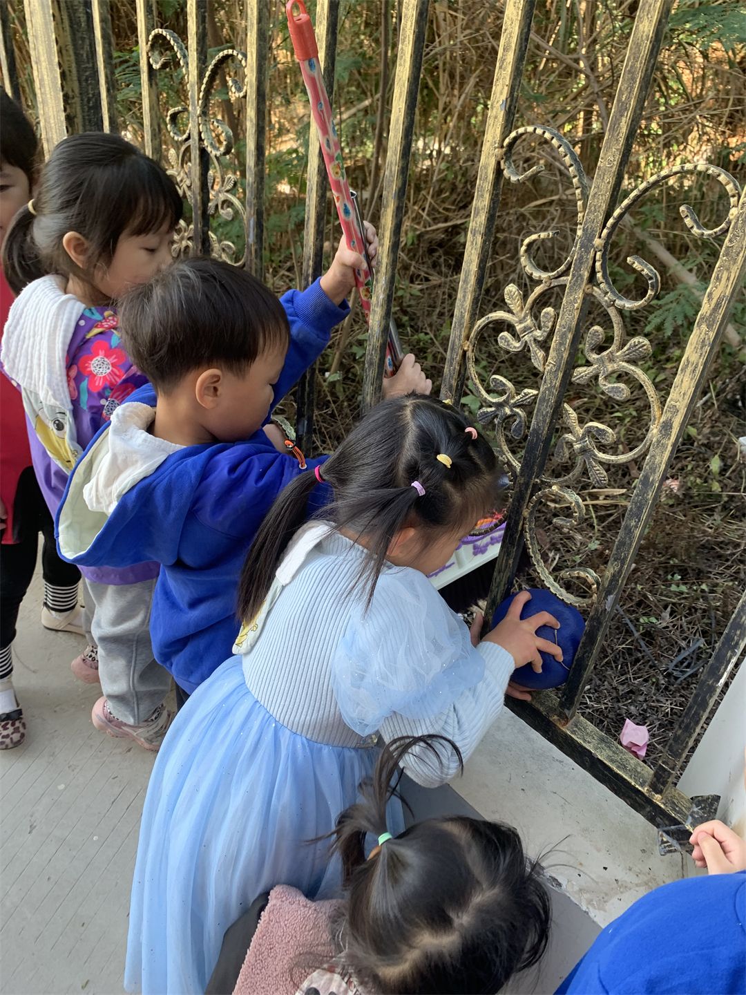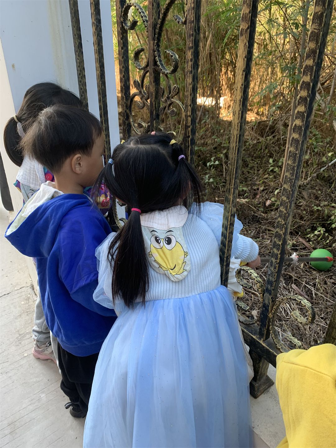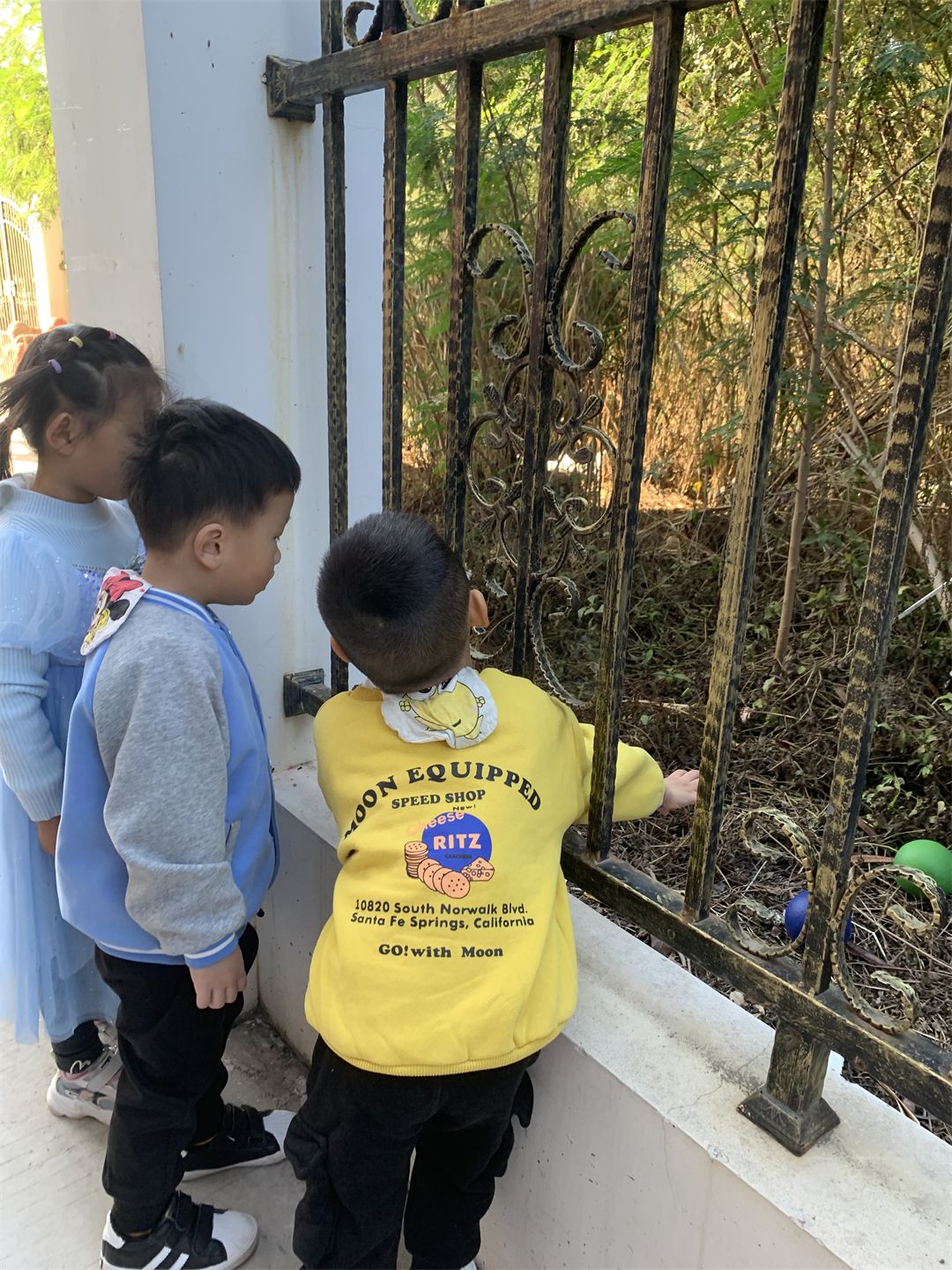我们在户外活动玩得正开心时,突然,阳阳的海绵球掉到栏杆外面了,这可怎么办呀?我们伸出小手试探能不能够到球,然后围在栏杆前讨论了起来……