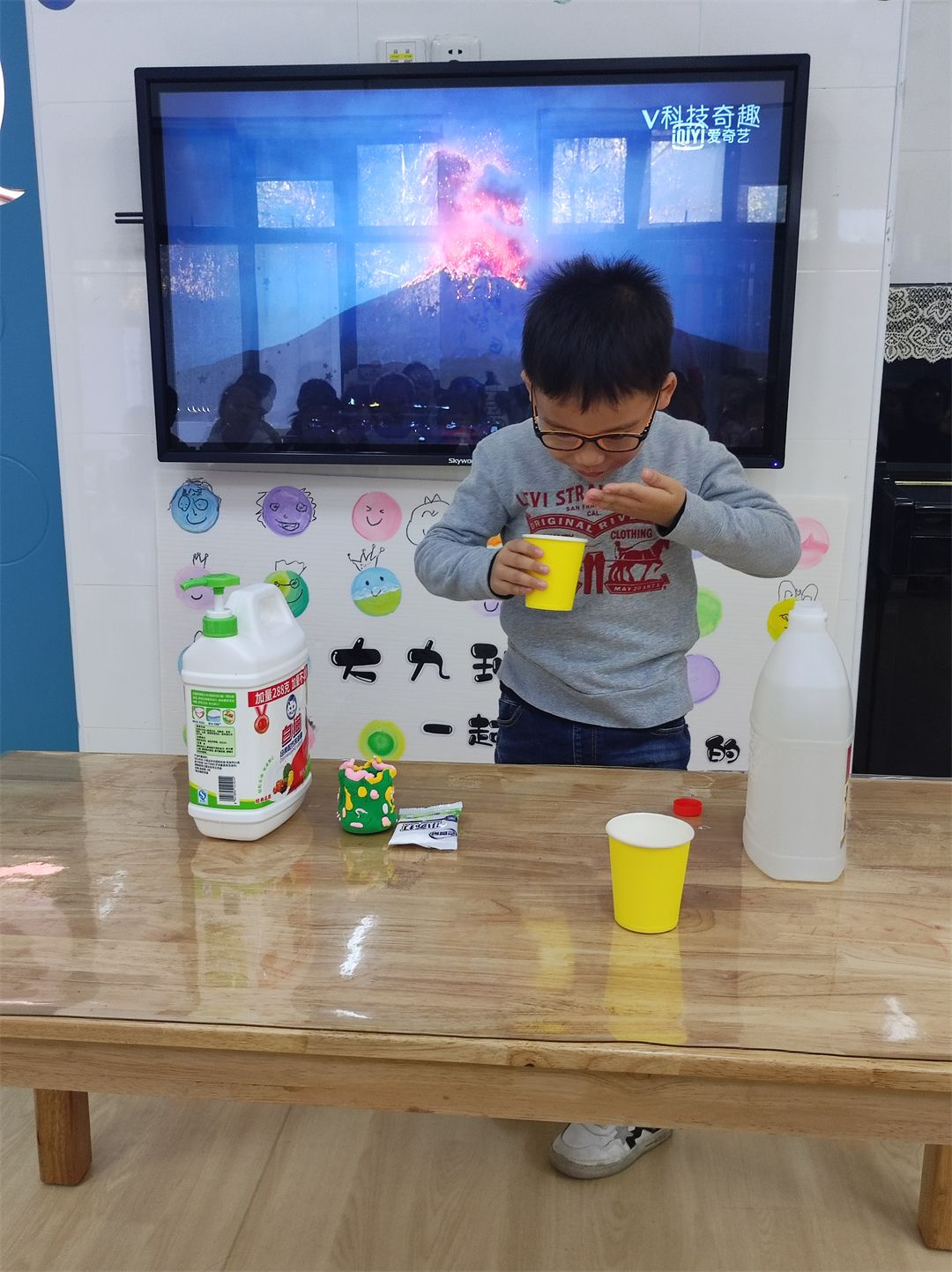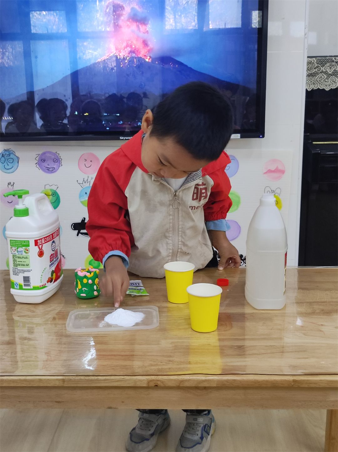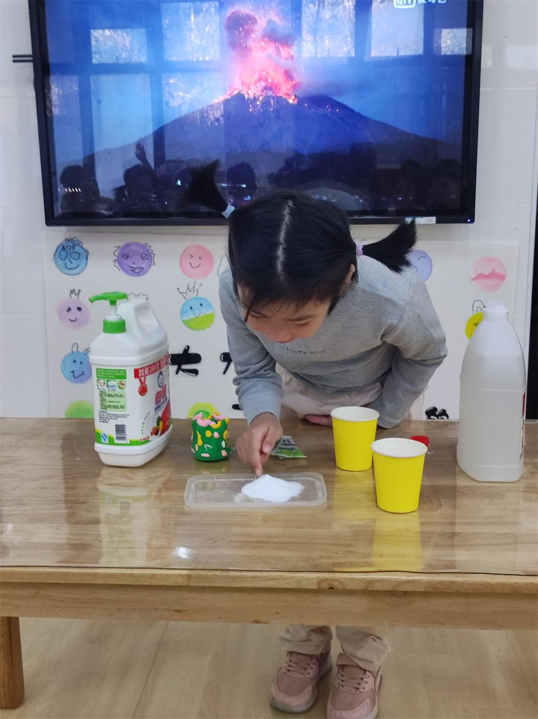 老师先用可爱的动画,幽默的语言将火山爆发的原理进行了讲解。听完老师的分享,小朋友们便蠢蠢欲动起来。