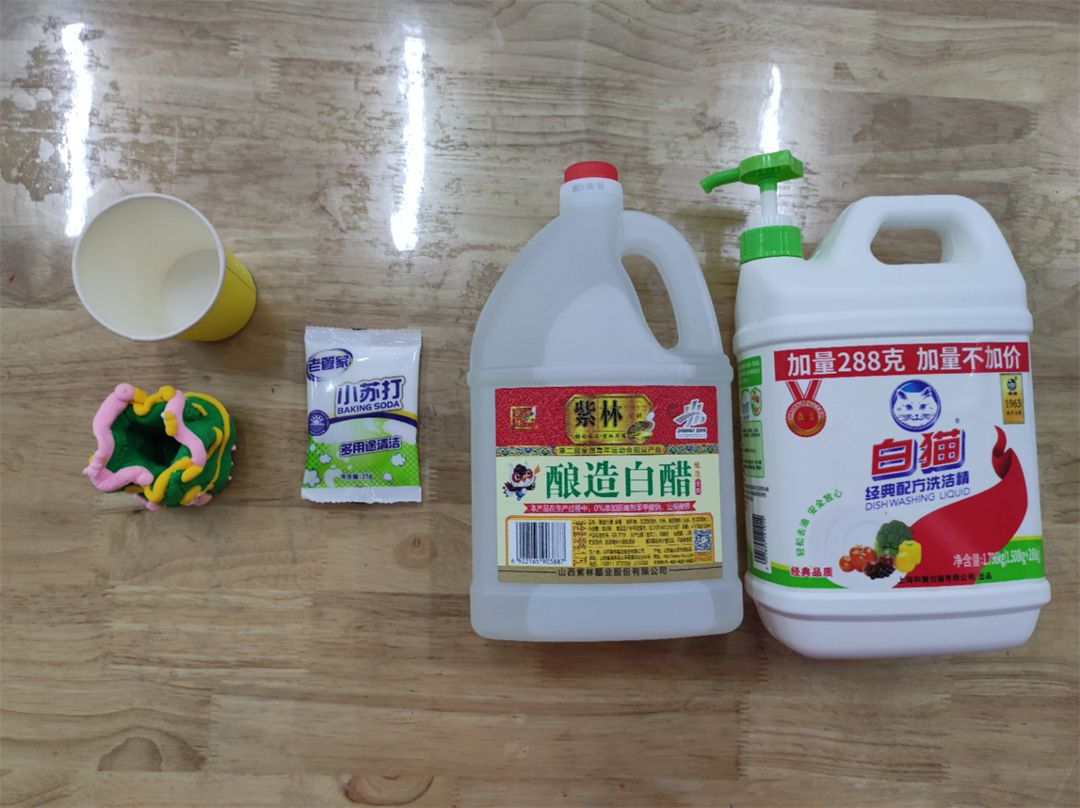 需要的材料:火山壳、一杯性杯子、洗洁精、小苏打、白醋。