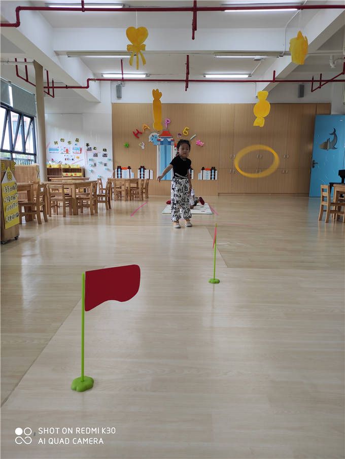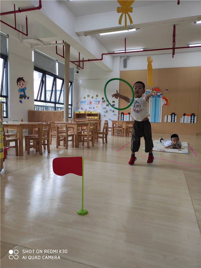经历了层层的难关,孩子们还要用圈圈套下用积木摆设的“战旗”,方可获得游戏通关的奖励贴。