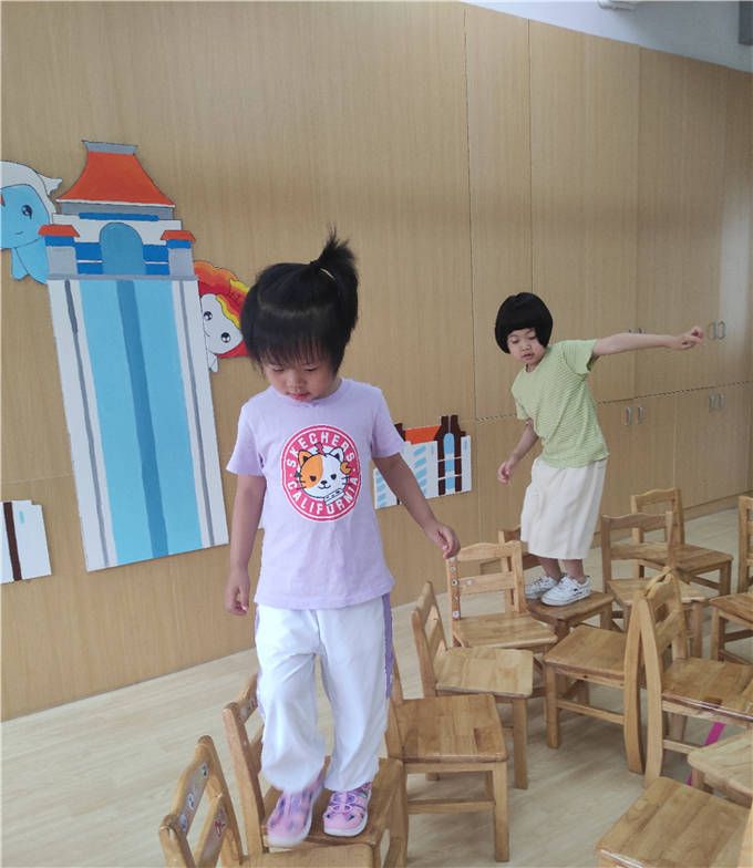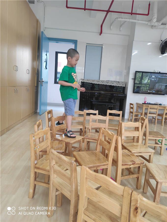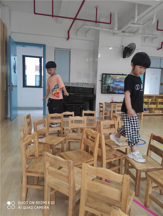 孩子们把椅子当作跨栏,椅子的摆设不再是单一的直线,对此,黄涵这样说:“我们觉得迷宫跨栏更好玩、更有挑战性,所以,我们对原来的设计进行了调整。”