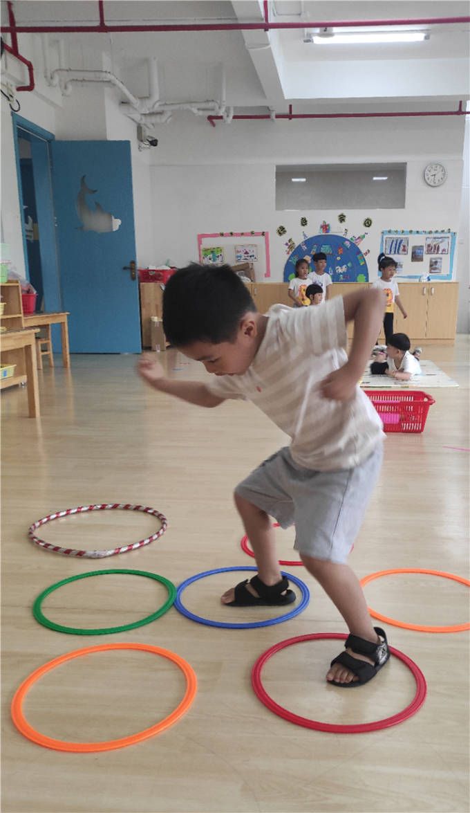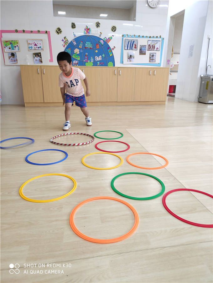 孩子们把圈圈当作一个个的泥坑,他们鼓足了勇气跳过泥坑。