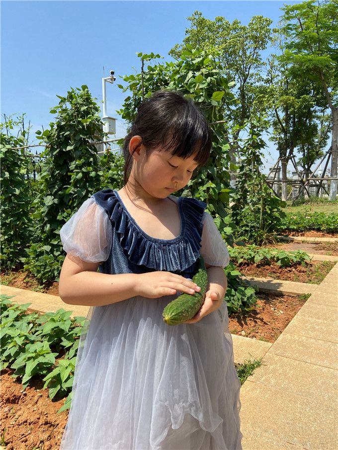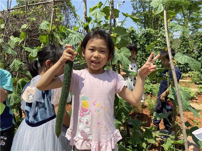 采摘开始,孩子们小心翼翼地将黄瓜摘下,握在手里惊呼:“好刺啊!”只见大家研究起来,黄瓜上布满了紧密又细软的小刺,“你看黄瓜有的长有的短有的粗有的细呢。”“我都闻到黄瓜的香味了。”孩子们们兴奋地感受着手里这个新鲜奇特却“扎手”的蔬菜,不禁嘴馋起来。