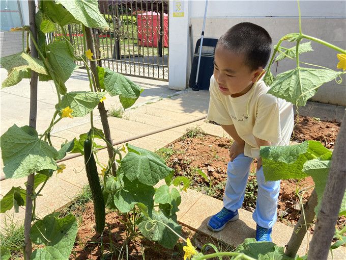 经历了春的播种,夏的呵护,大九班的黄瓜终于长出果实啦!沉甸甸、绿油油的黄瓜挂上藤蔓,吸引了孩子们好奇的目光,他们迫不及待走进小菜地,体验收获的喜悦。