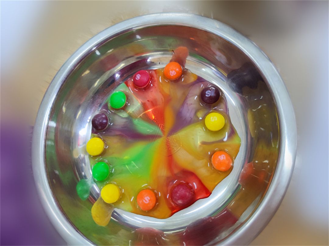彩虹糖接触水后,色素开始向四周扩散。色素就会开始朝盘子中央集合,彩虹糖色素和水属于极性分子,两者相似相容。