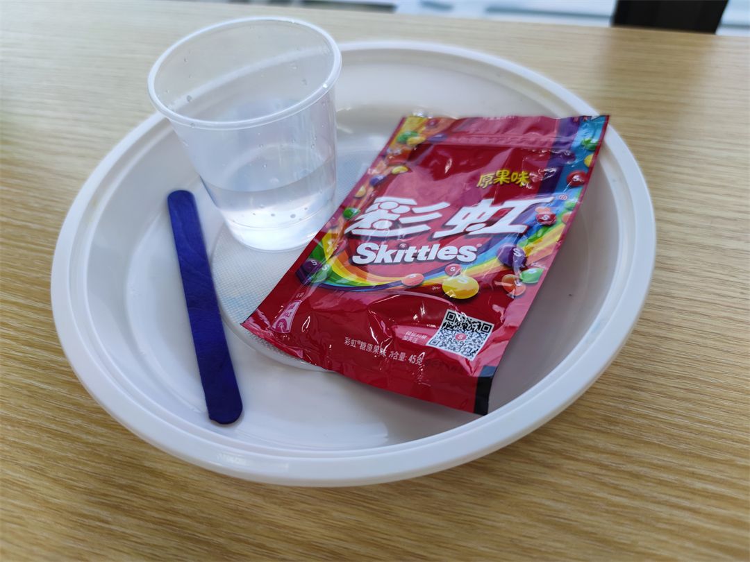 把彩虹糖放进装有温水的杯子里面,拿起木棍,轻轻地搅一搅,仔细观察一下,会发生什么呢?