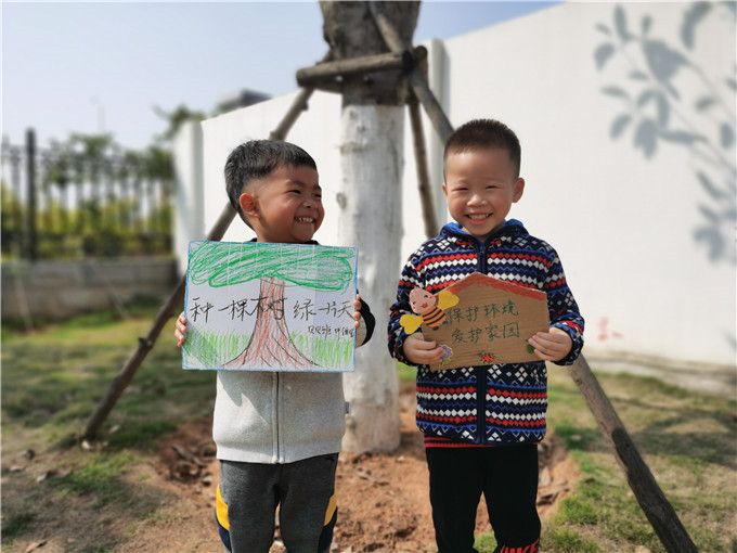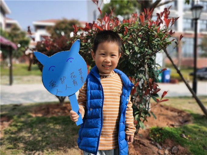 植树节这一天,萌娃们拿着各式各样植树工具和与爸爸妈妈一起制作的“爱心公益牌”,出发啦!