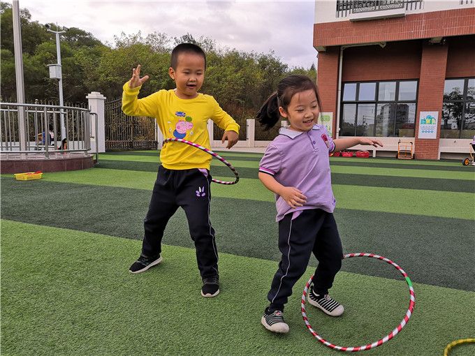 孩子们发现了平时玩的呼啦圈也是运动中的一种,可以用腰去转呼啦圈,一起比一比谁转呼啦圈转的多!