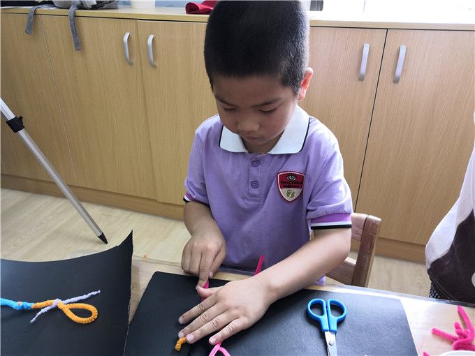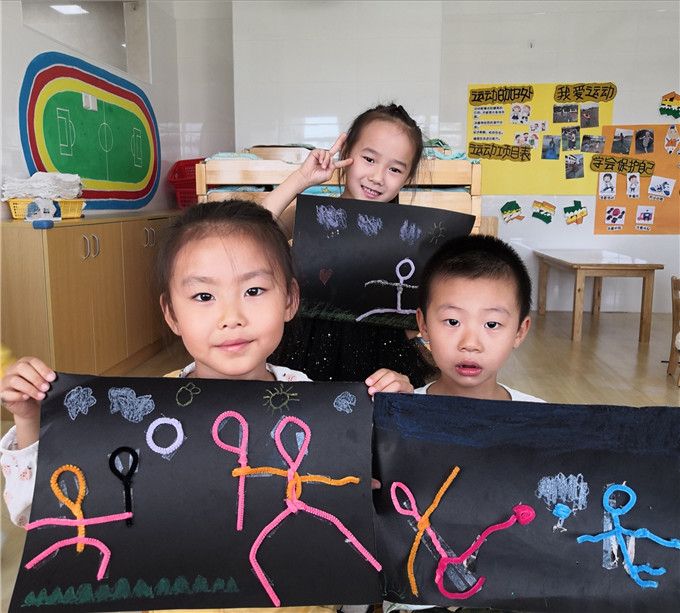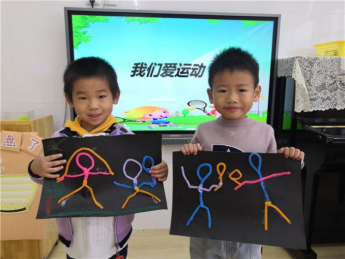 也有用各种颜色的毛根制作出不同的运动标志,孩子们制作出了有跳绳、打羽毛球、踢足球等,都十分生动,就像举办了一场纸上运动会一样。