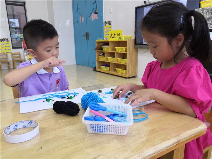毛线、皱纹纸和绒球加上彩色蜡笔,大胆想象创作作品,孩子们创作出一幅幅美丽的作品。