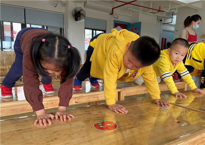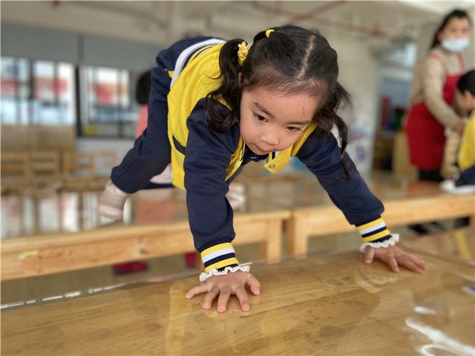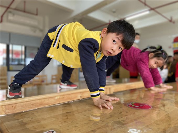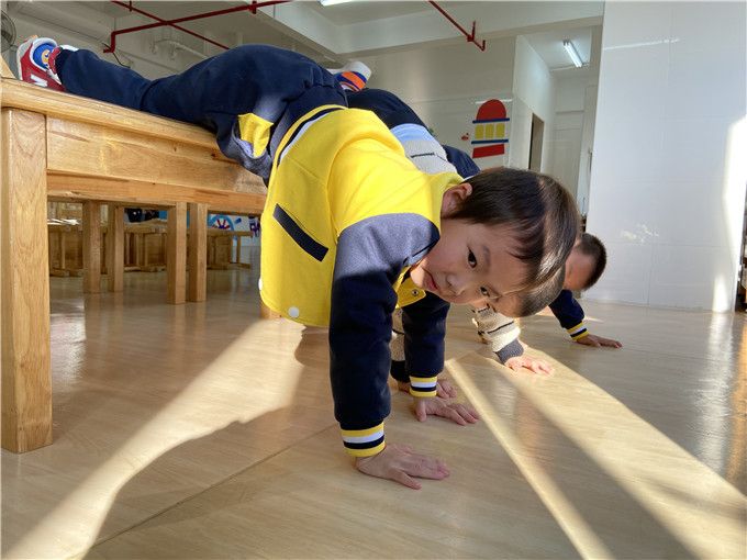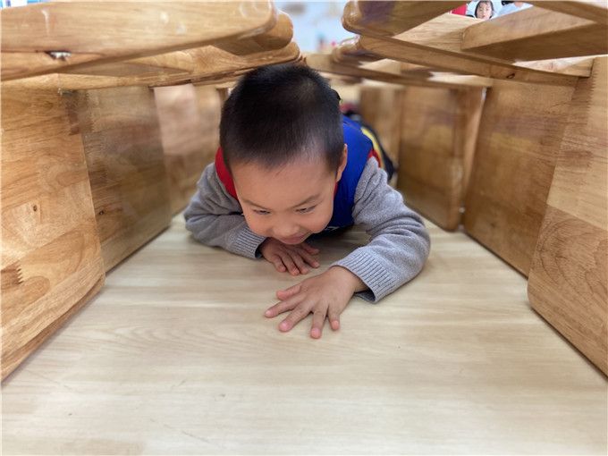 “快快、快跟上!低点再低点,别碰到啦!”孩子们仿佛化身特种兵,一个个匍匐前行,勇敢的穿越封锁线。
