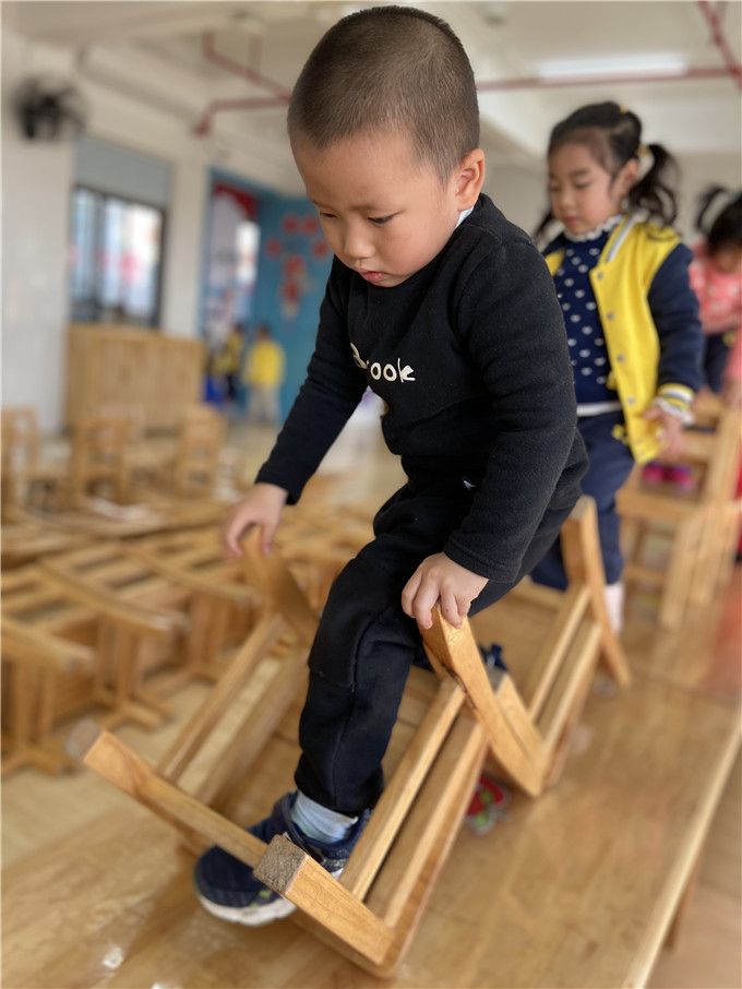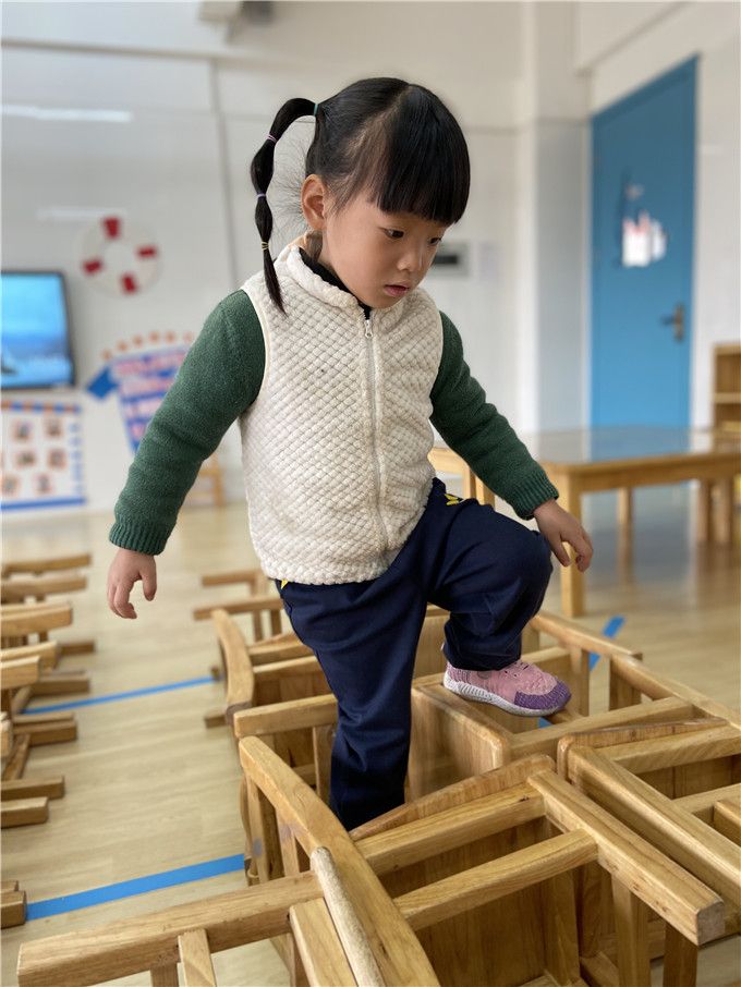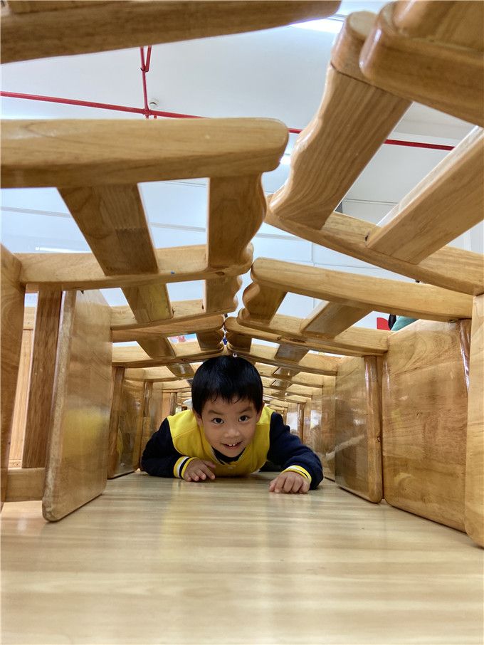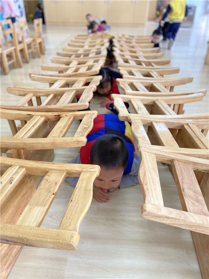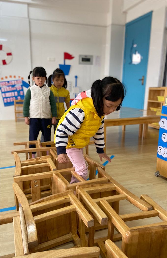看着孩子们自己摆的椅子迷宫,多认真啊。“迷宫迷宫,我来闯,来跟我走!”