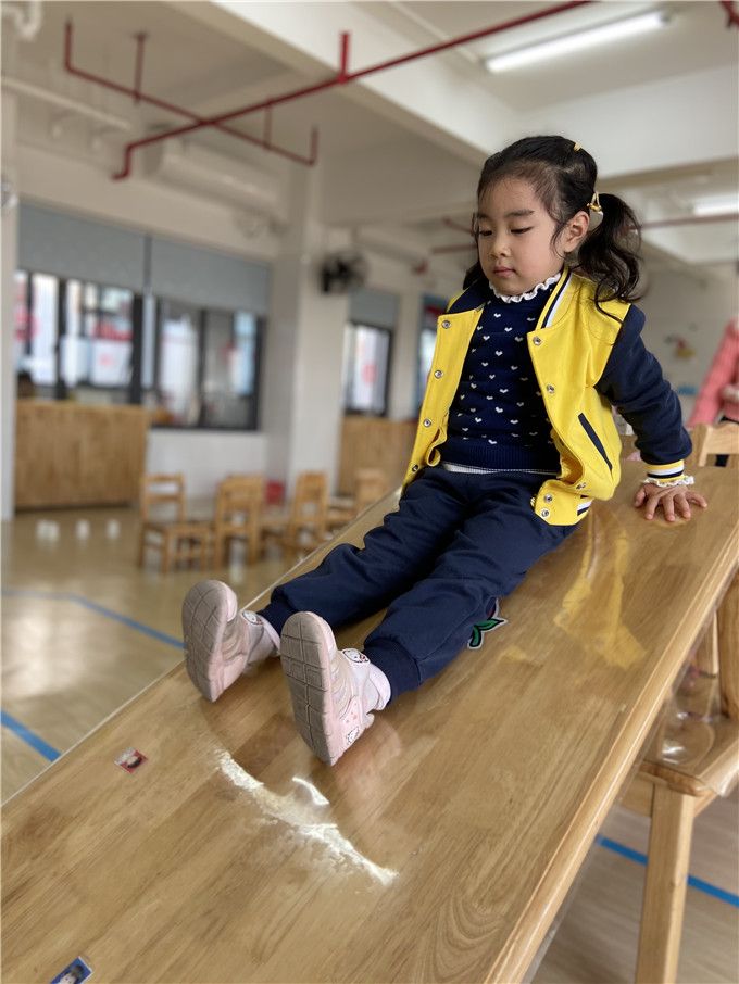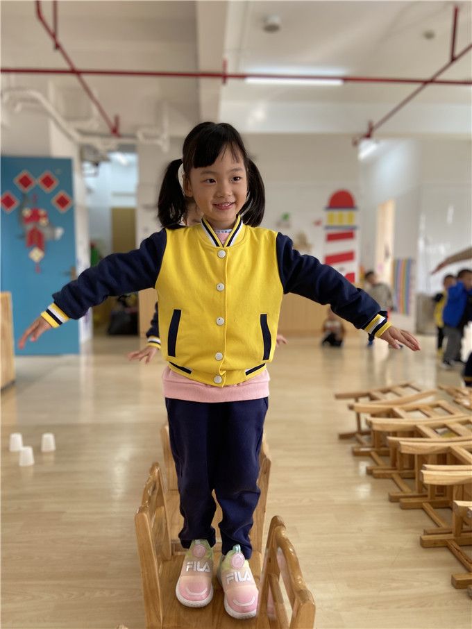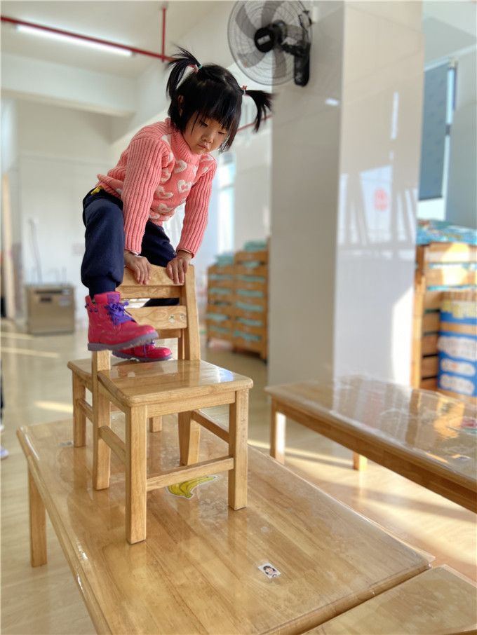 孩子们全神贯注,生怕一不小心掉下来,纷纷比着谁能又稳又快的走过呢!