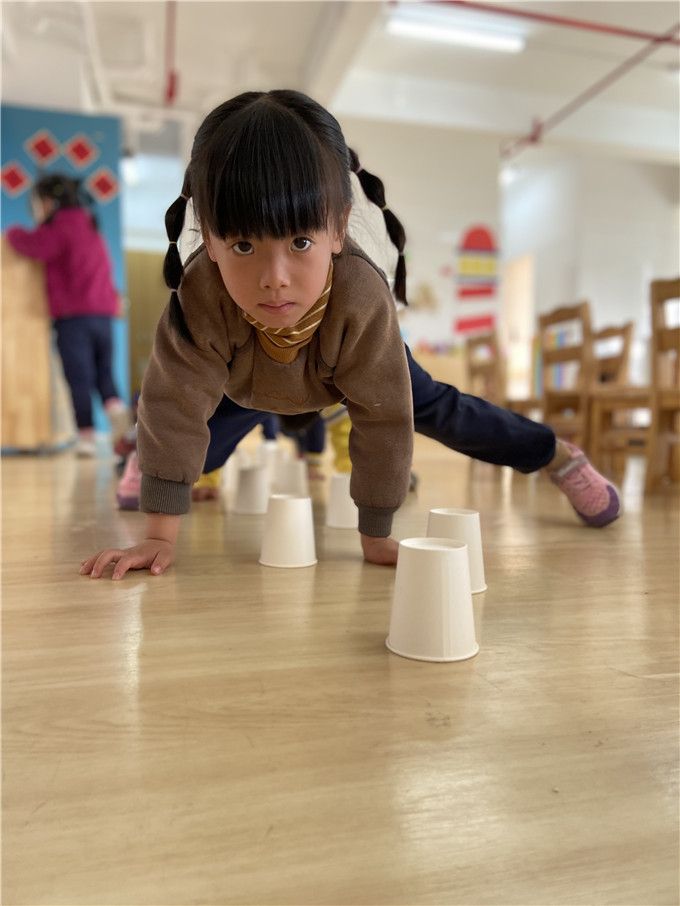 孩子们用自己的四肢高高撑起,就怕碰到了身下的纸杯,一步一个脚印的往前走。