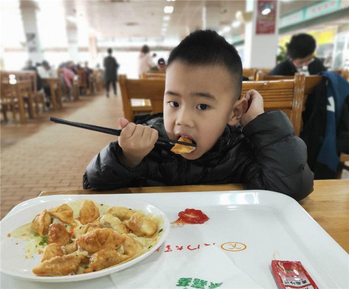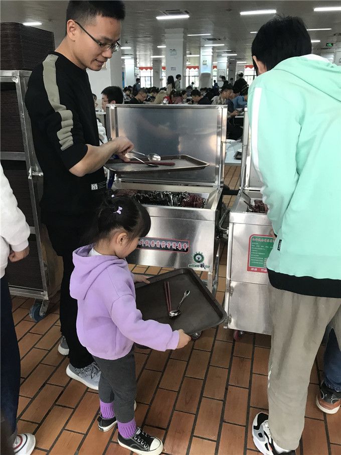 “爸爸告诉我先拿托盘、筷子和勺子,然后再去排队。”