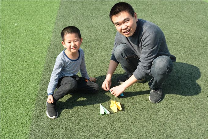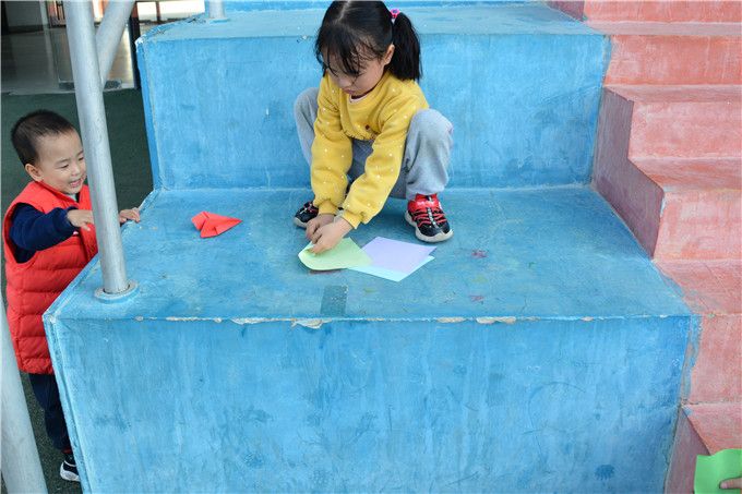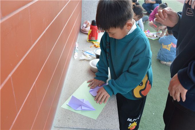 风筝余韵过后,机灵的小脑袋,灵活的小手动起来,孩子们折起纸飞机:“希望有一天我设计的纸飞机可以像风筝一样,像真正的飞机一样飞上蓝蓝的天空!”。