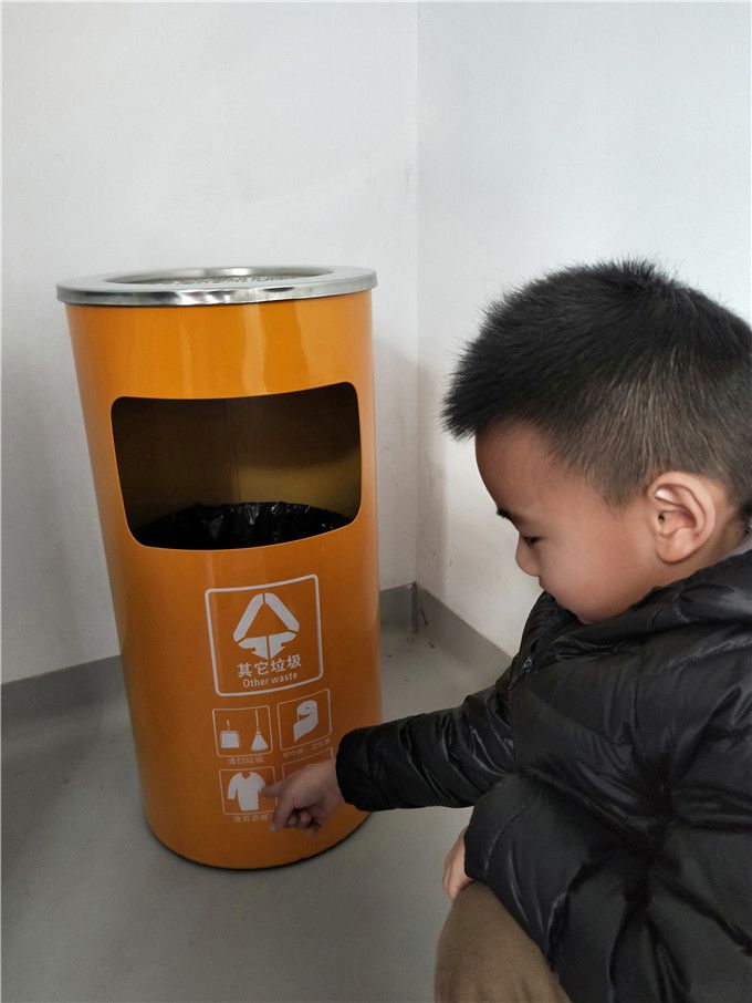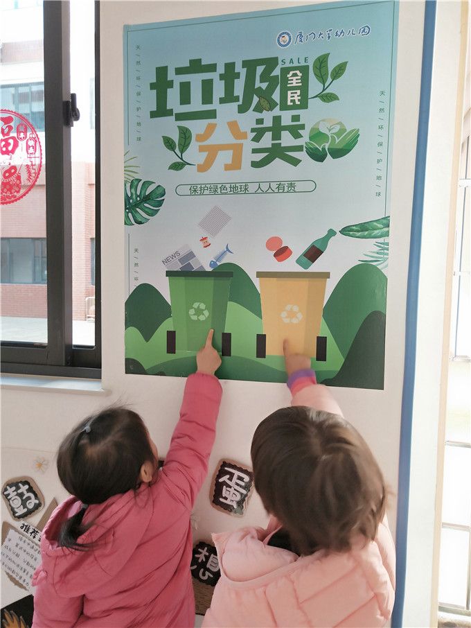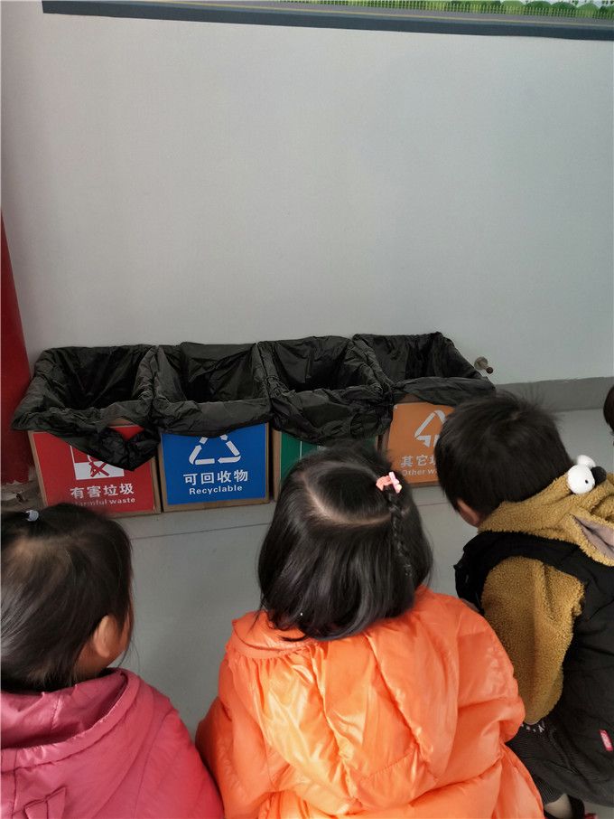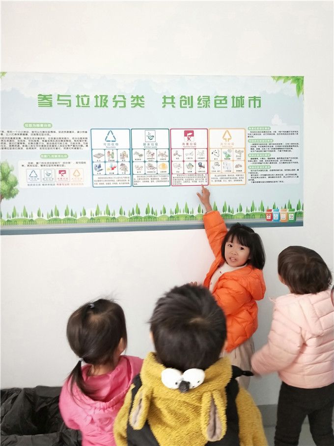 随后,萌娃们一起认识了幼儿园里贴着的垃圾分类宣传图和垃圾分类的场所,认识了可回收、不可回收的标记。