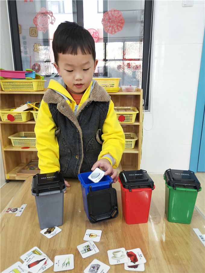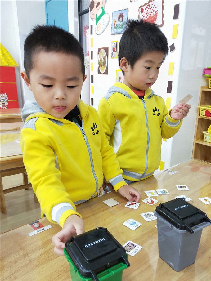 萌娃们不仅通过上课的方式了解垃圾分类的重要性,老师在每日的区域游戏中提供了垃圾分类小游戏,让萌娃们通过动手做一做,分一分的游戏方式体验活动,加深对各类垃圾的认识。