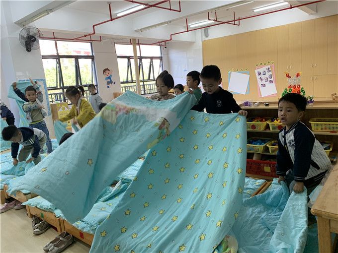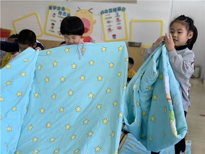 小选手们身手不凡,灵活迅速,将被子角对角,边对边,对折再对折,很快就有小选手举手了。