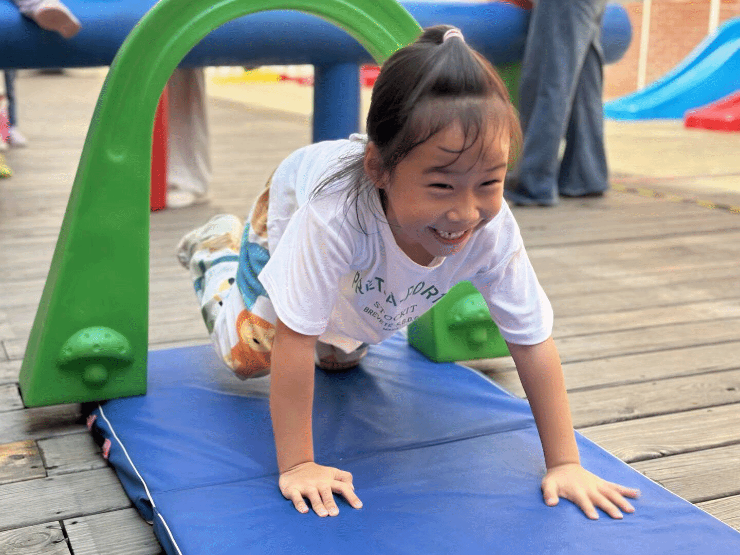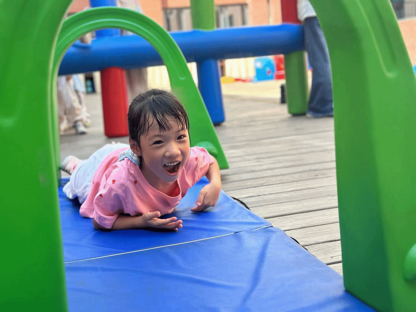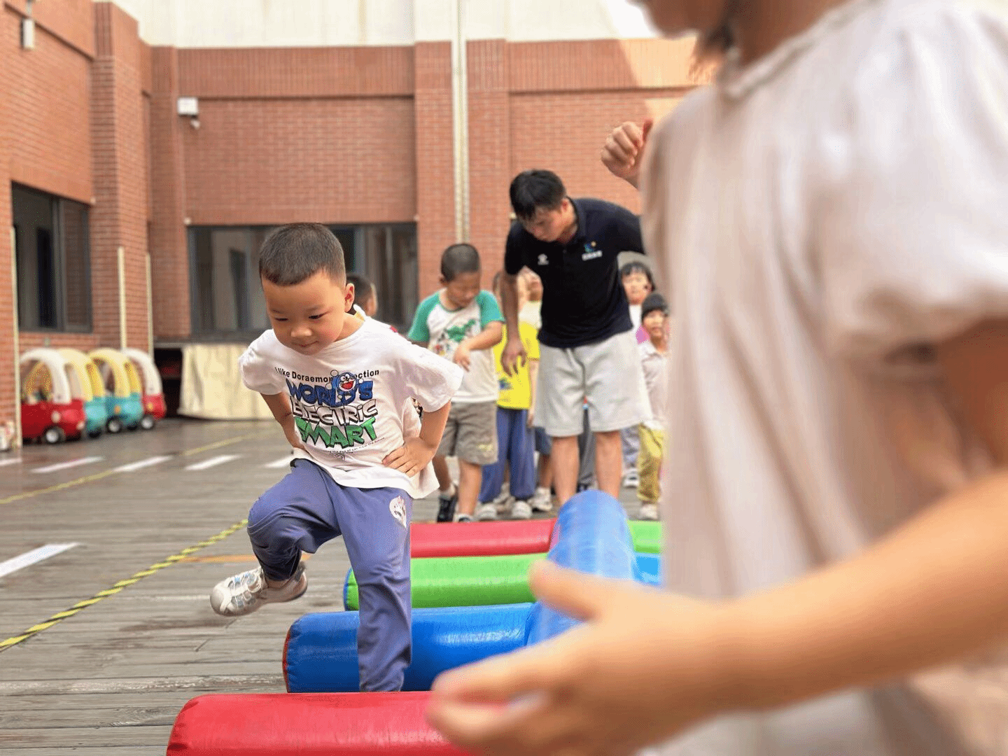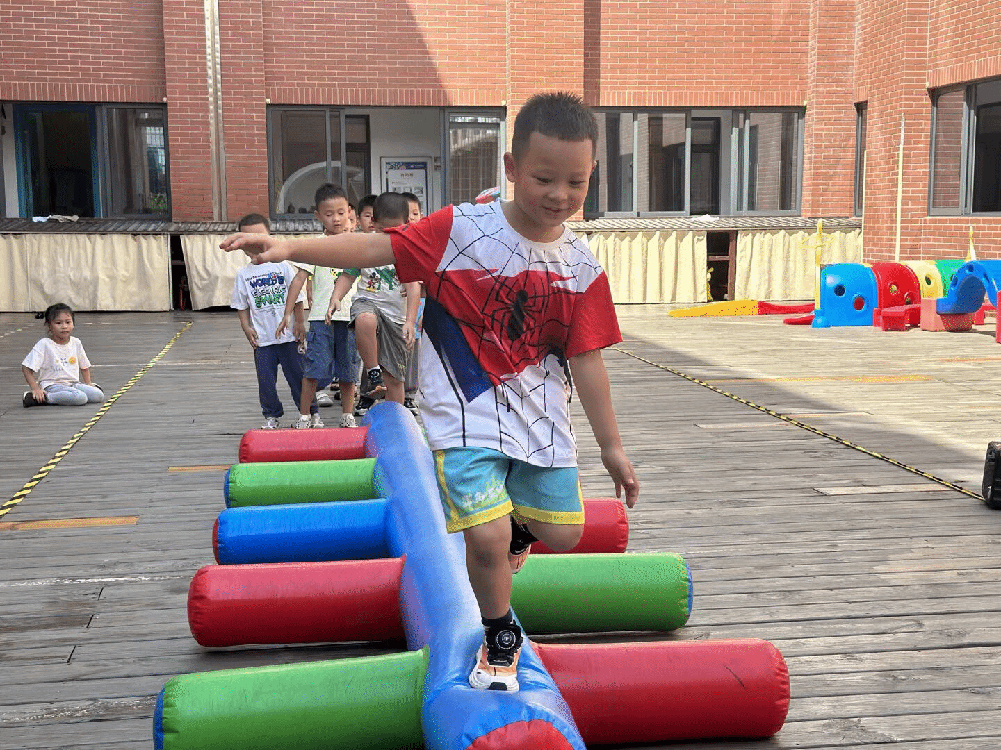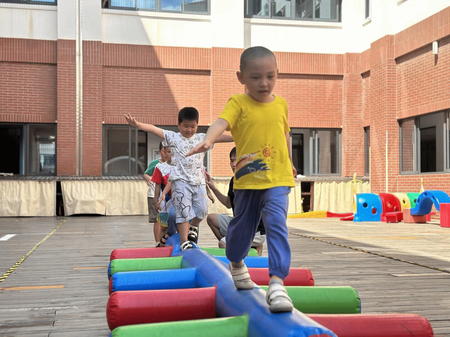 户外体能活动时,萌娃变身“运动小健将”。彩色充气平衡木上,萌娃们化身“平衡达人”,在奔跑、跳跃中挑战自我;钻爬隧道里,一个个小身影灵活穿梭……这些体能游戏不仅让他们在运动中增强体质,更在一次次挑战里收获了勇气和自信,为新学期的成长蓄力满满!