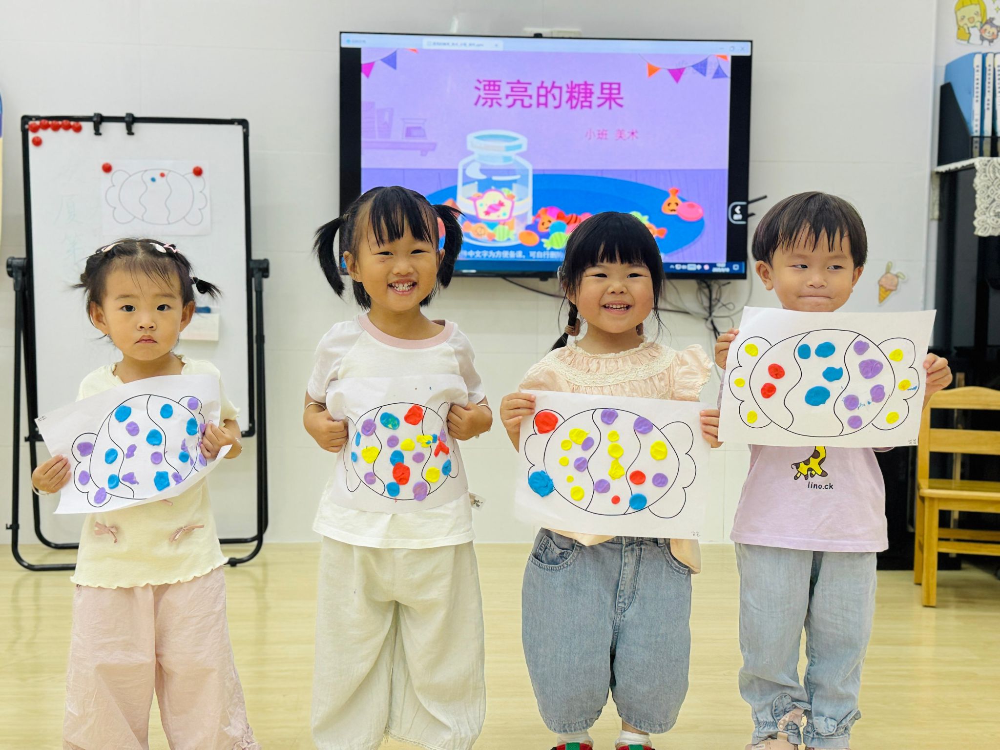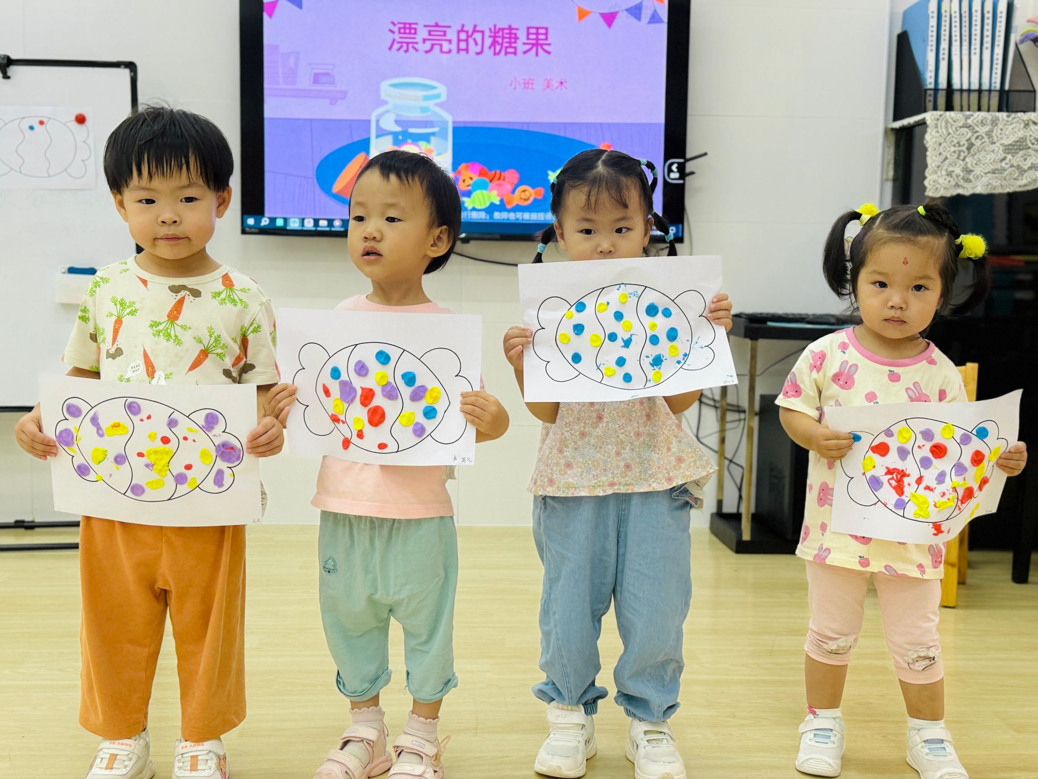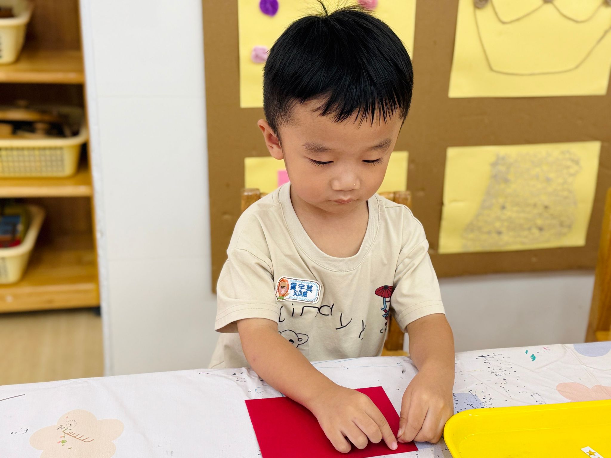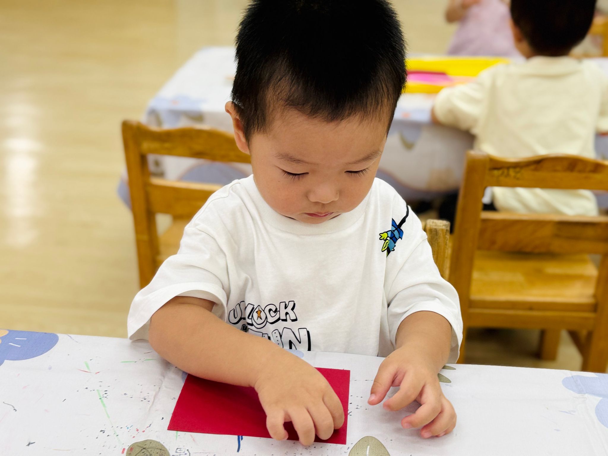 手工课成了宝贝们的最爱。他们用胖乎乎的小手剪出歪歪扭扭的图形,粘成“漂亮的糖果”“鲜艳的五星红旗”,每一件作品都藏着满满的心意。
