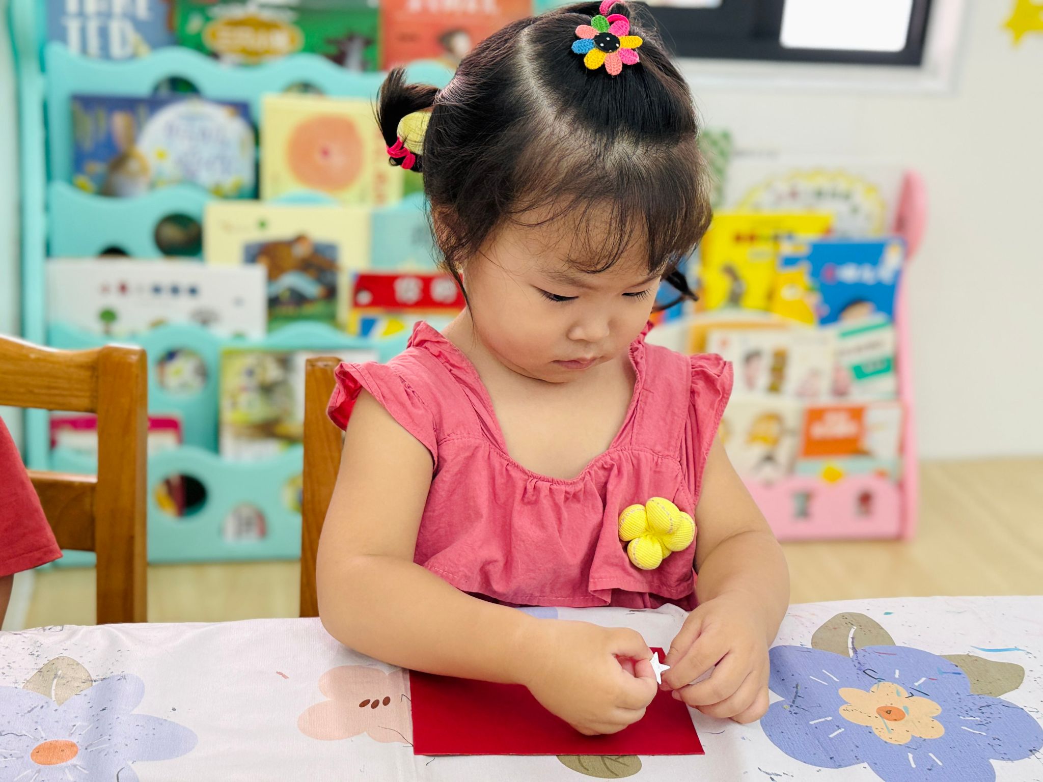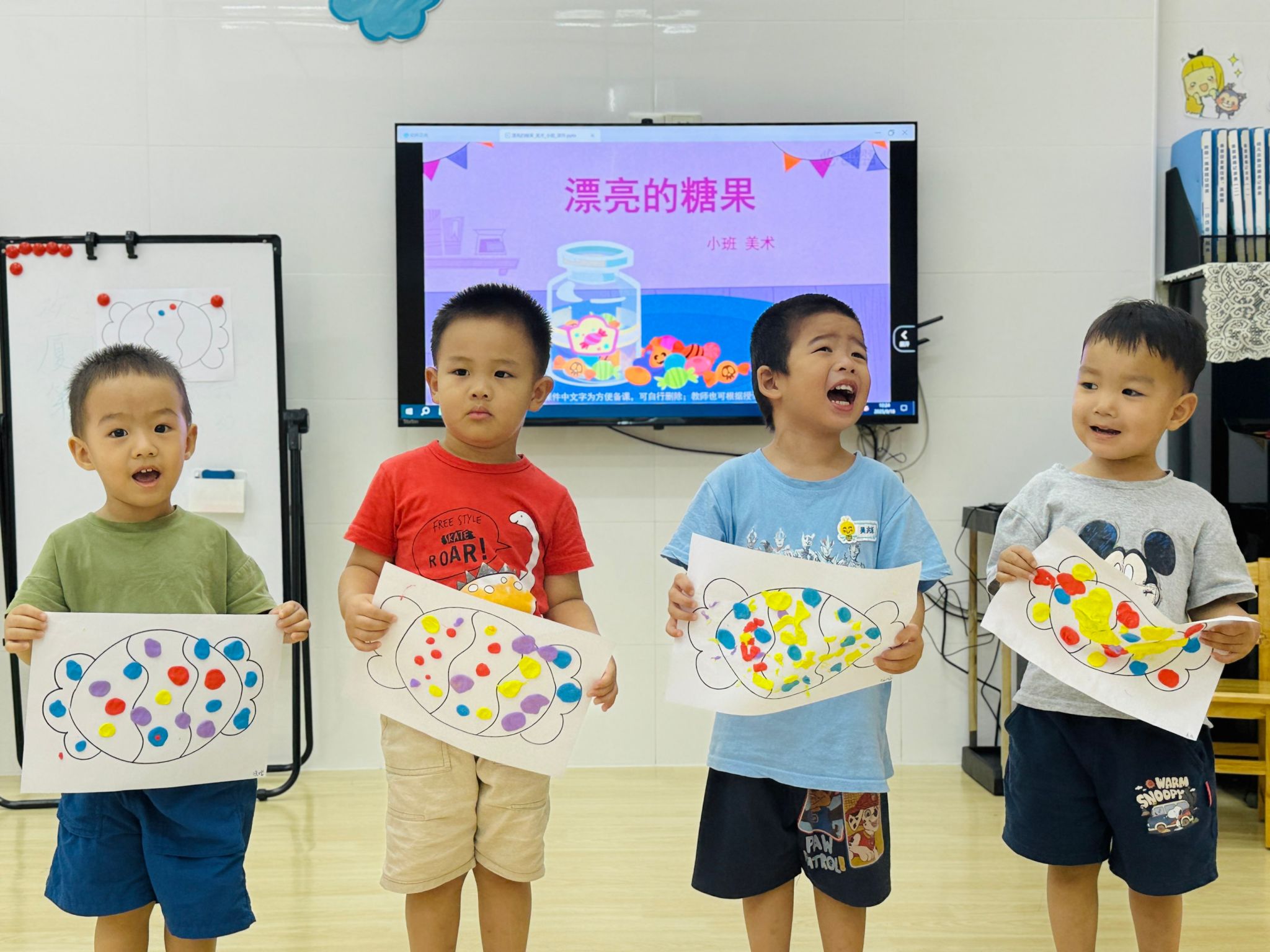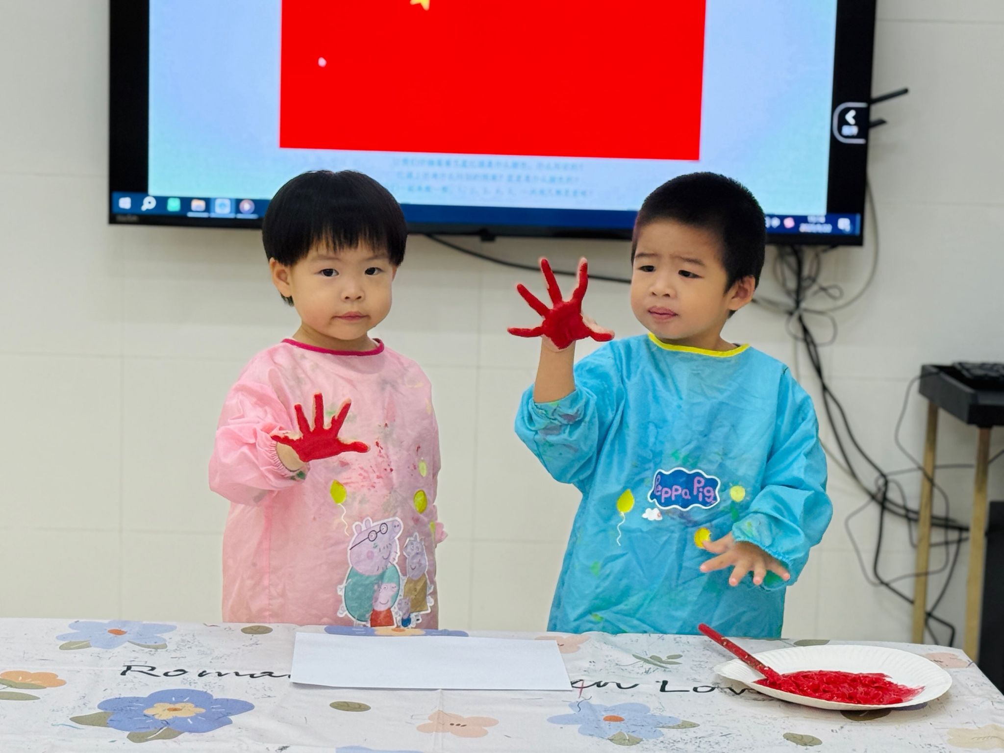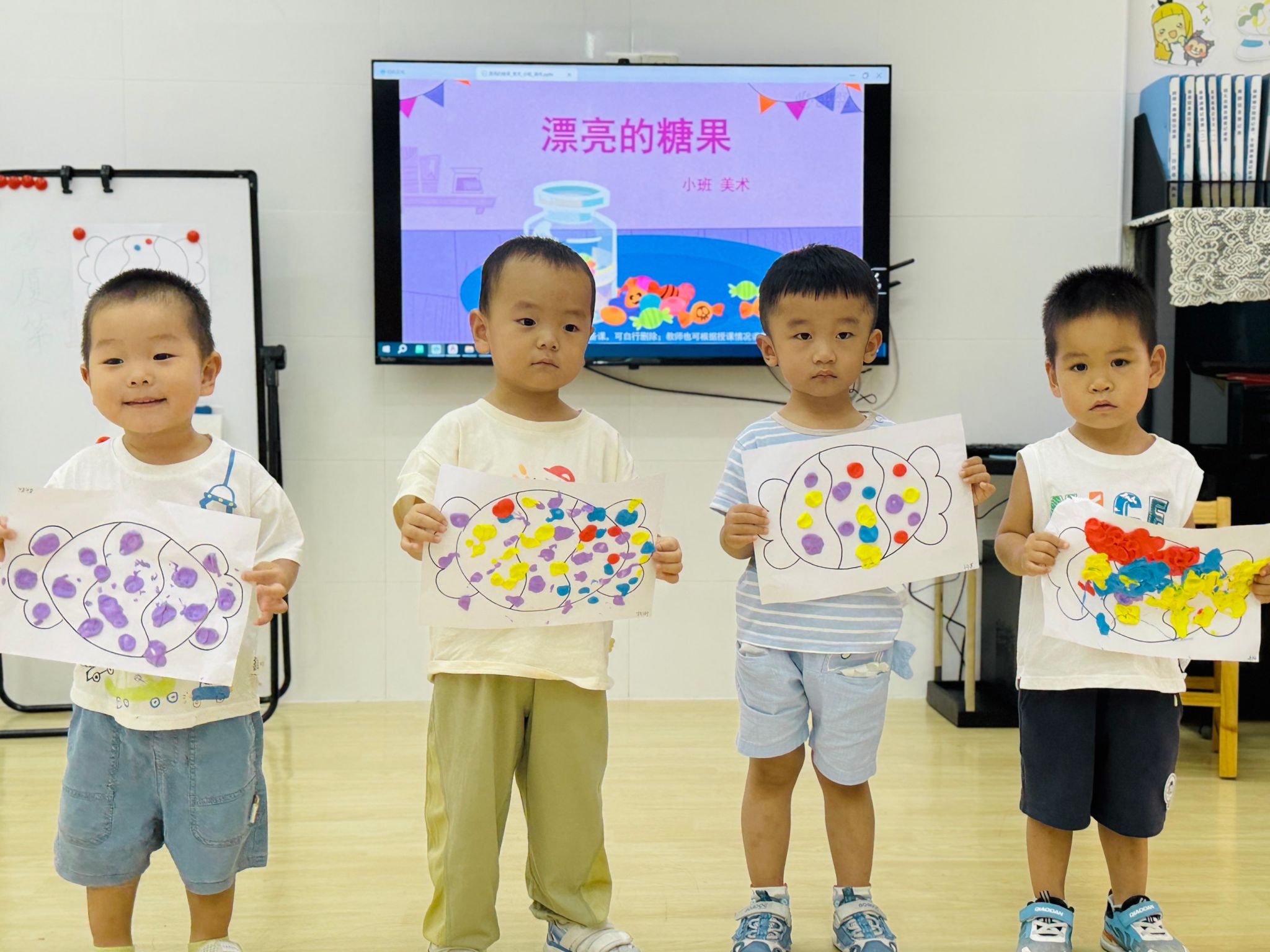 手工课成了宝贝们的最爱。他们用胖乎乎的小手剪出歪歪扭扭的图形,粘成“漂亮的糖果”“鲜艳的五星红旗”,每一件作品都藏着满满的心意。