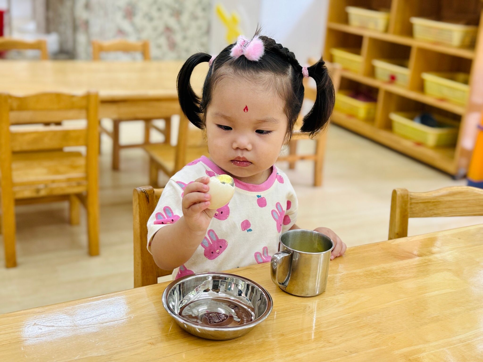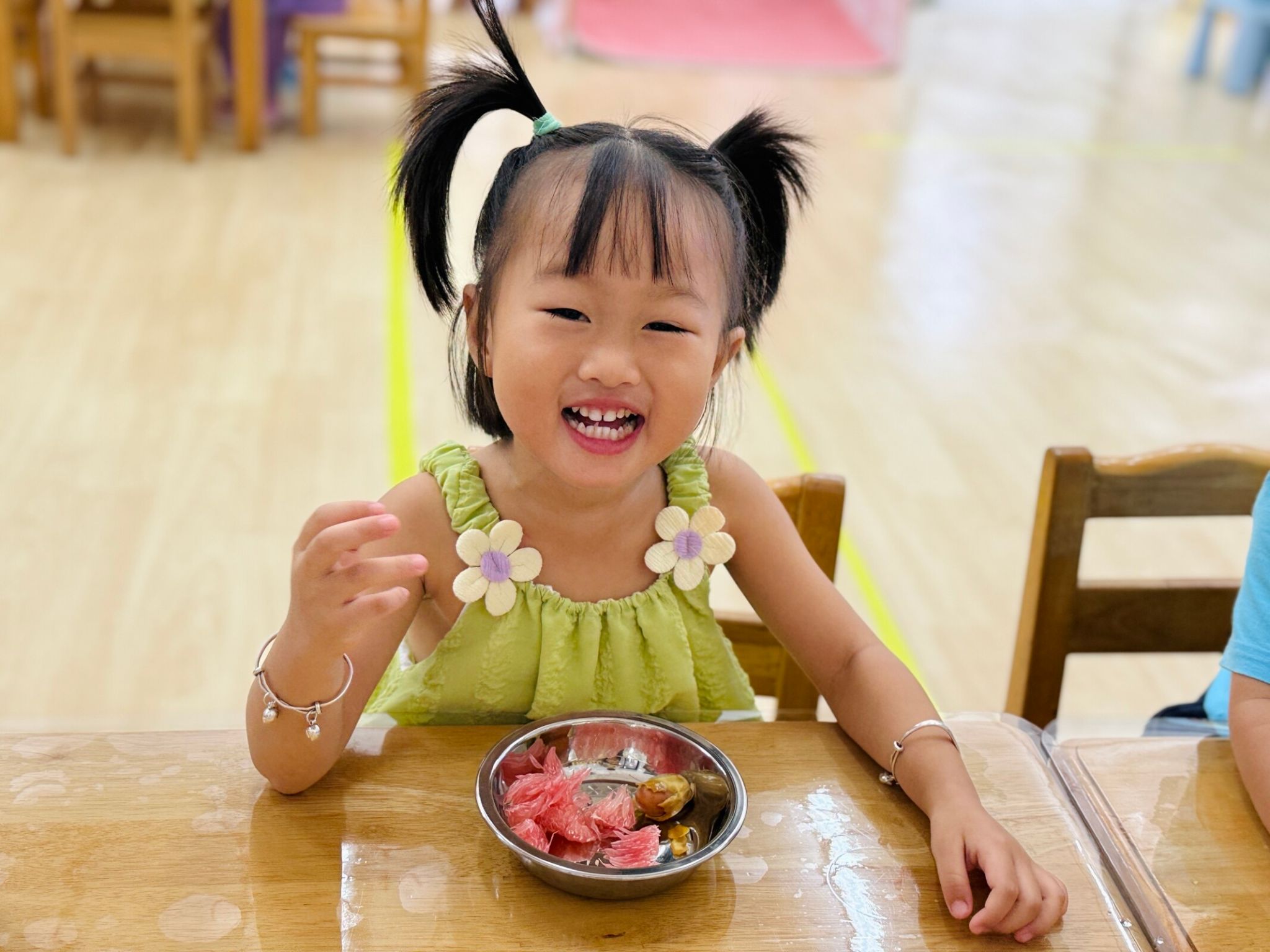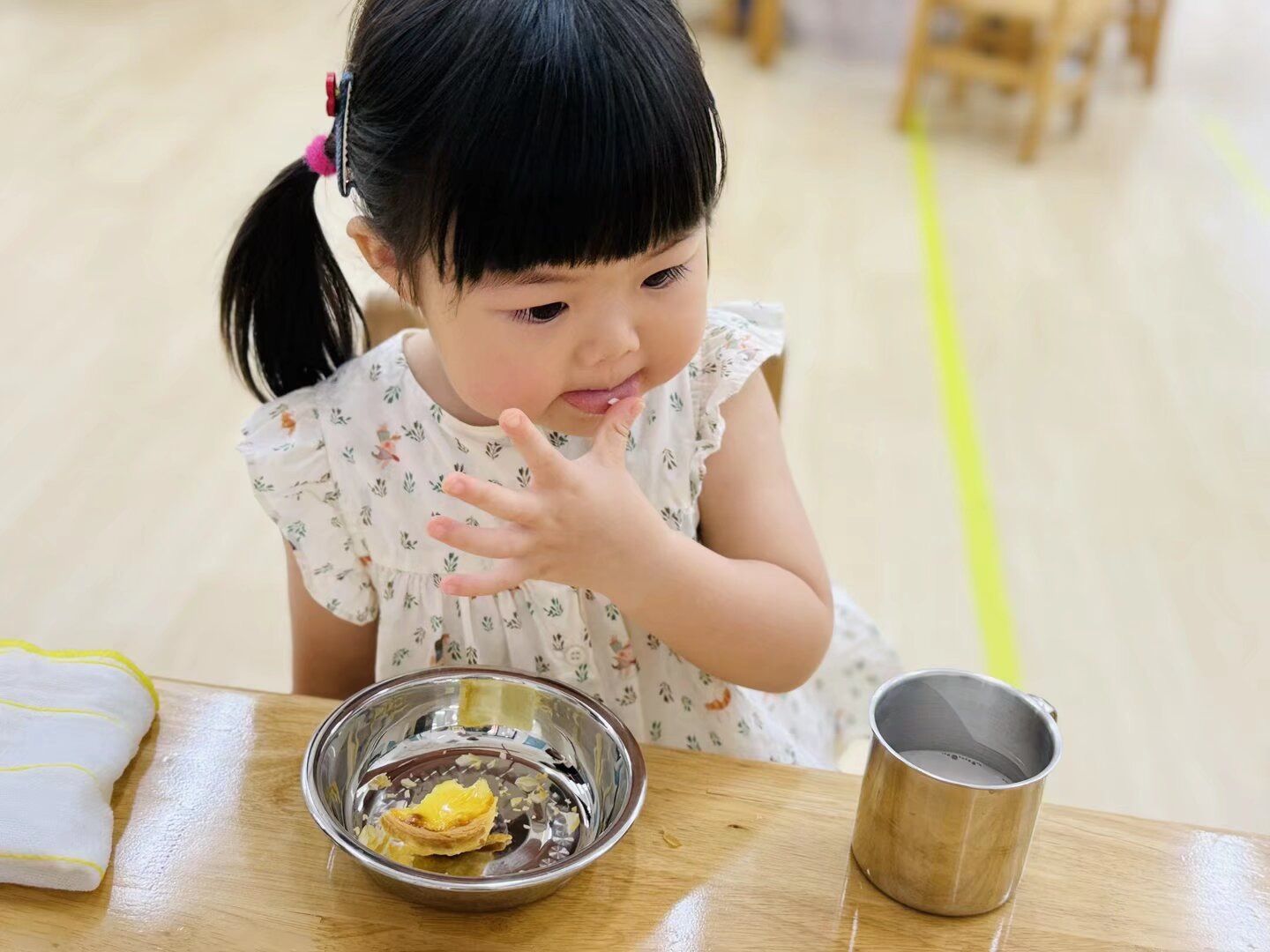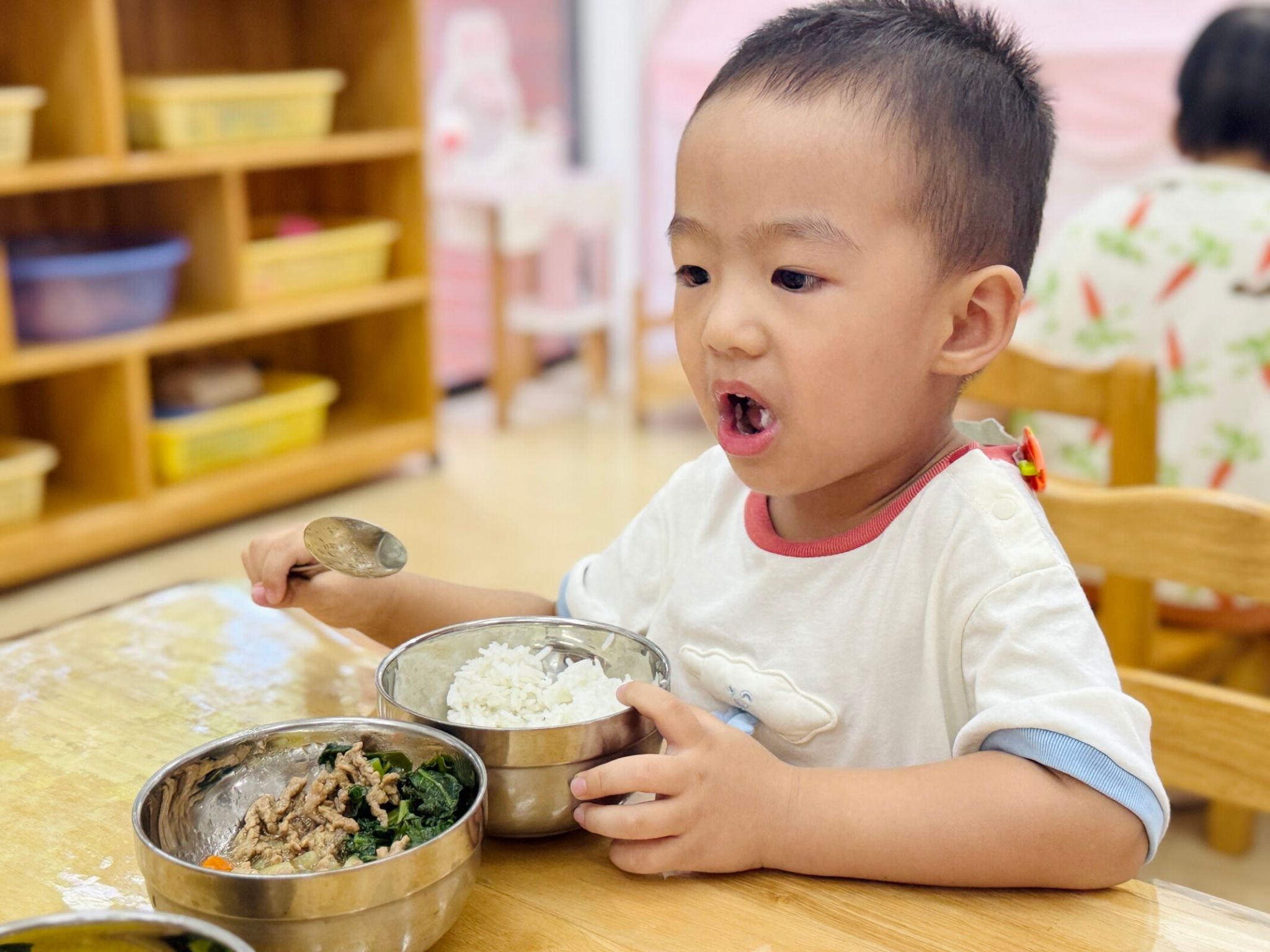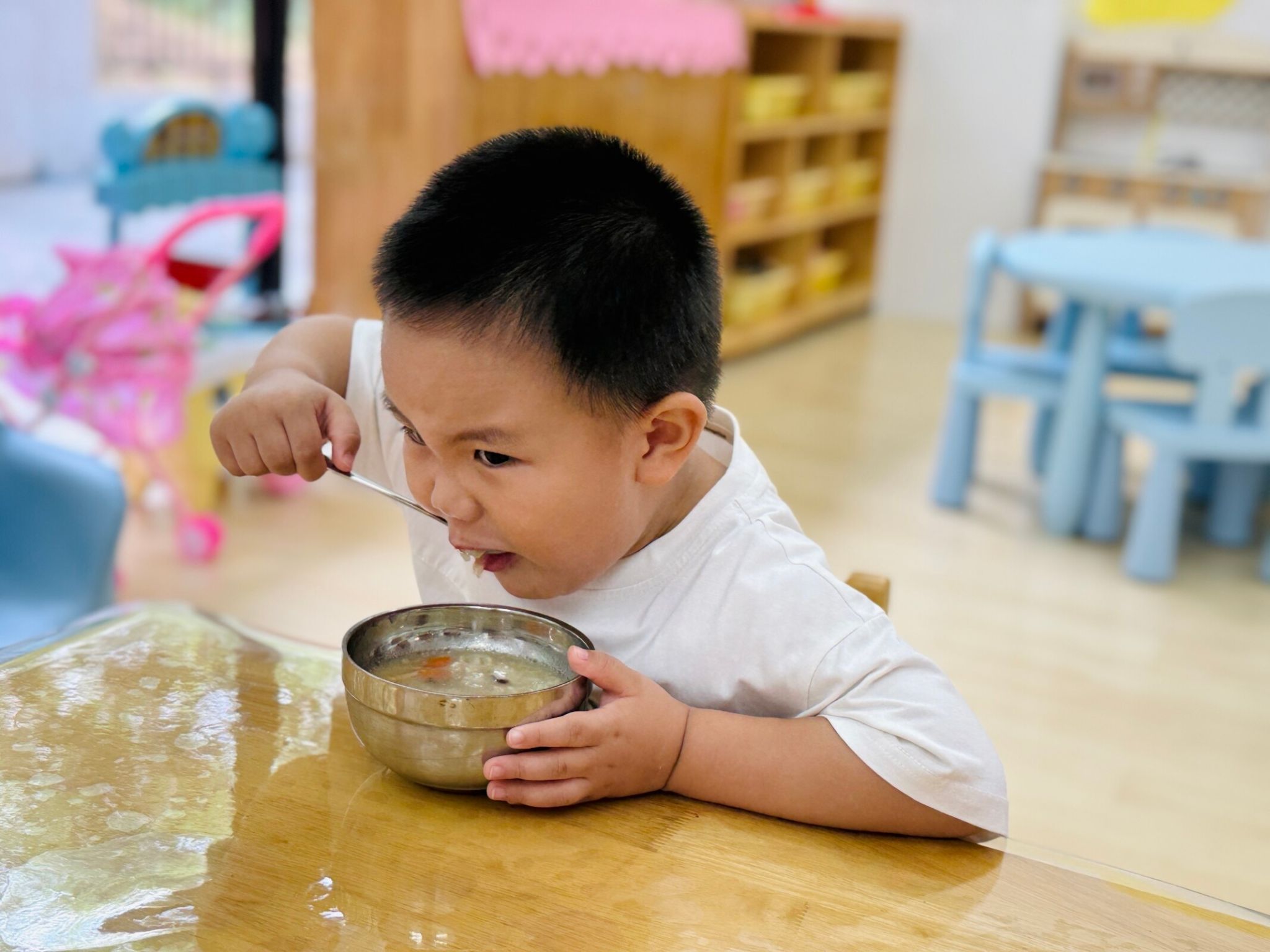 晨间入园时,曾经躲在家长身后的宝贝们,如今会主动挥着小手说“老师早”;曾经需要老师喂饭的小不点,正握着勺子笨拙又认真地扒拉着米饭,脸上沾着饭粒也毫不在意,还会举着空碗骄傲地喊:“我吃完啦!”