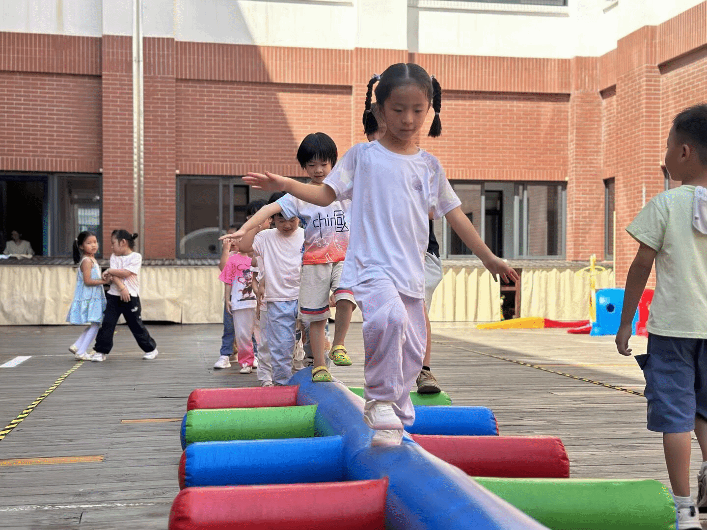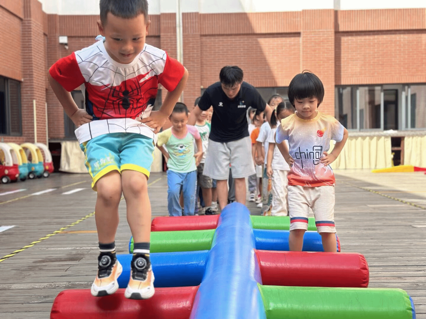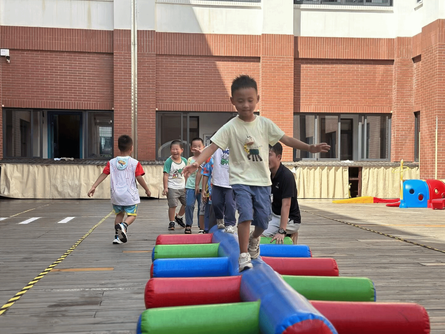 这一次孩子们化身“小探险家”,在彩色平衡木上稳步前行。他们张开手臂保持平衡,身后的同伴们跃跃欲试。这看似简单的游戏,实则锻炼了孩子们的平衡感与专注力,在欢乐中悄悄提升着各项能力。