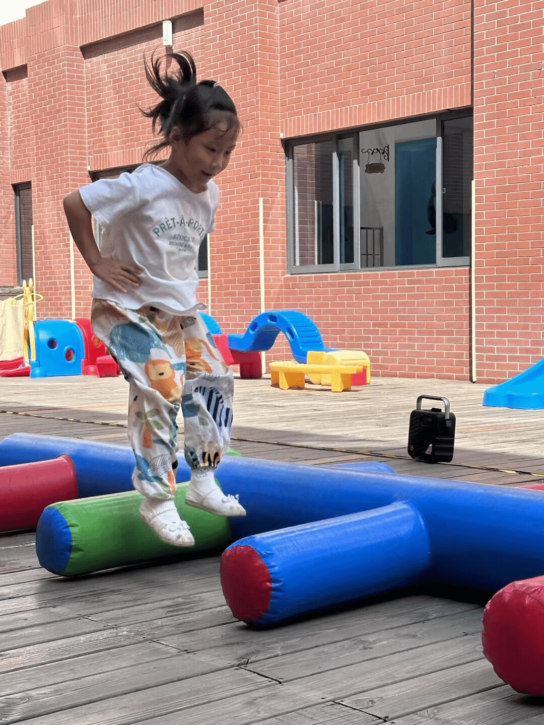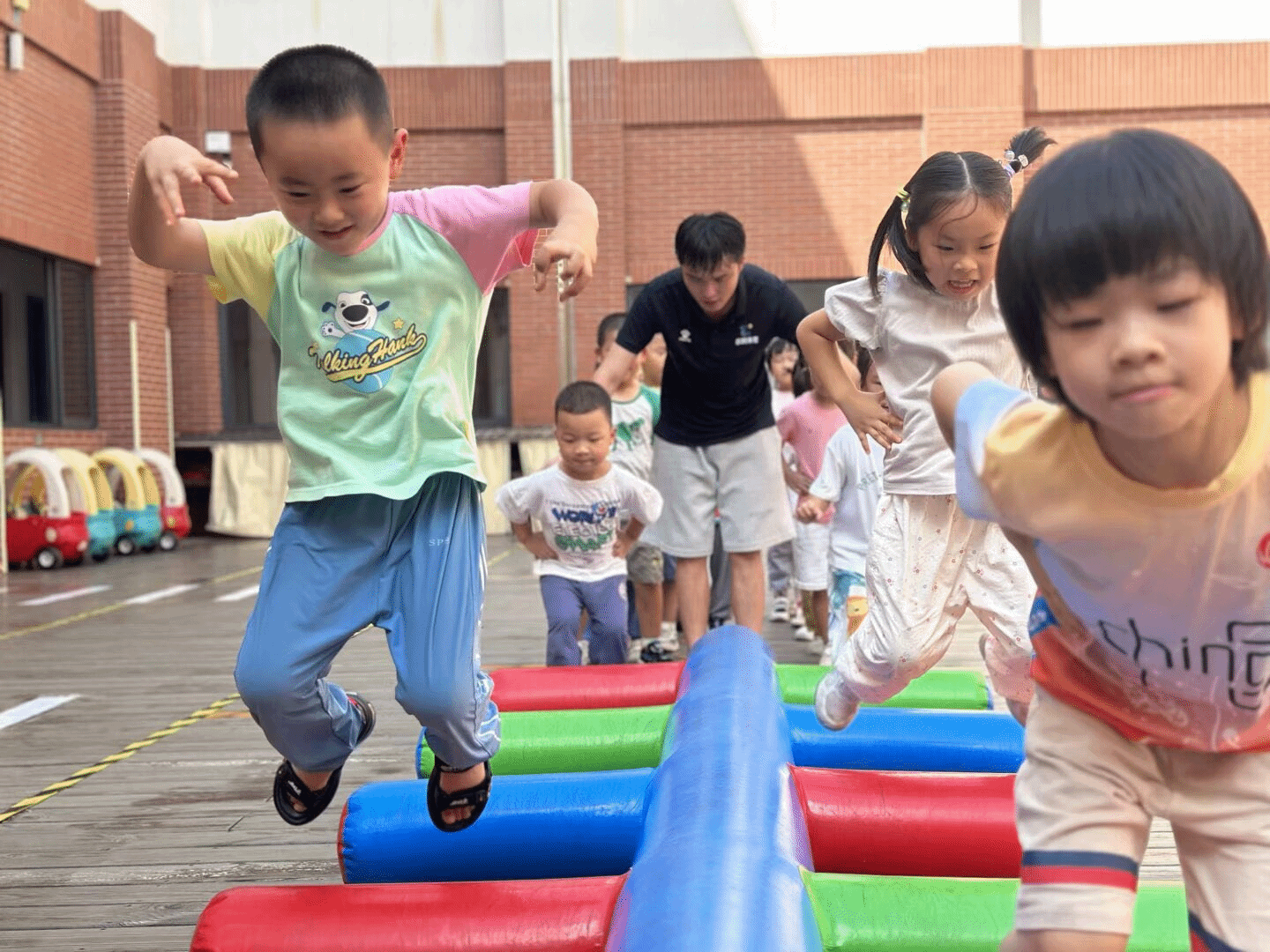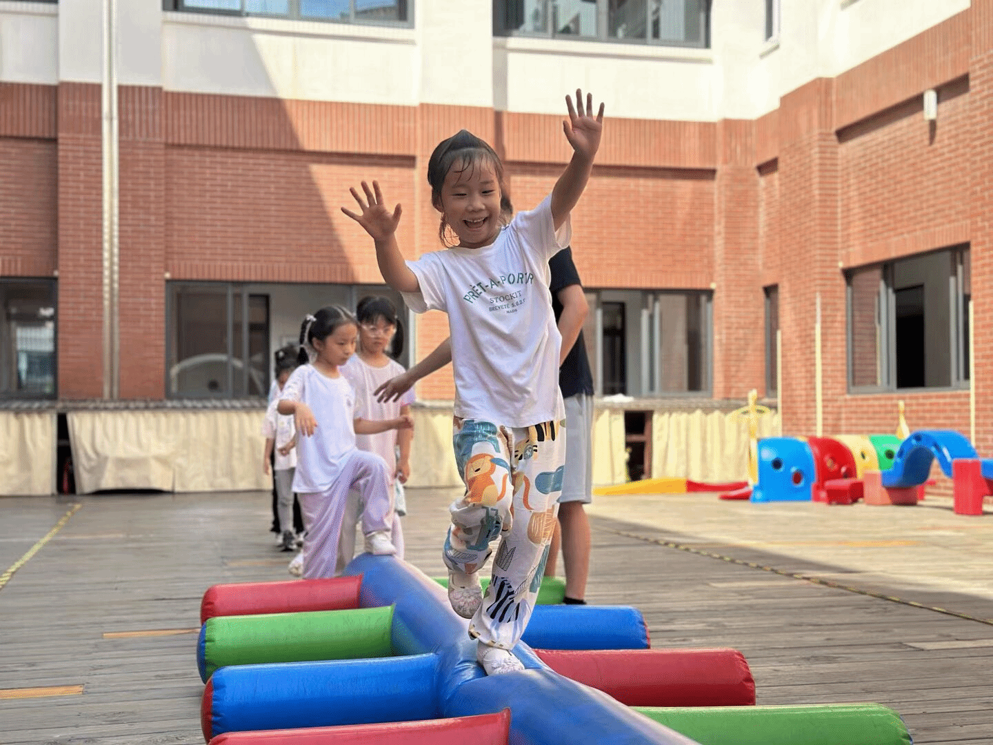 这一次孩子们化身“小探险家”,在彩色平衡木上稳步前行。他们张开手臂保持平衡,身后的同伴们跃跃欲试。这看似简单的游戏,实则锻炼了孩子们的平衡感与专注力,在欢乐中悄悄提升着各项能力。