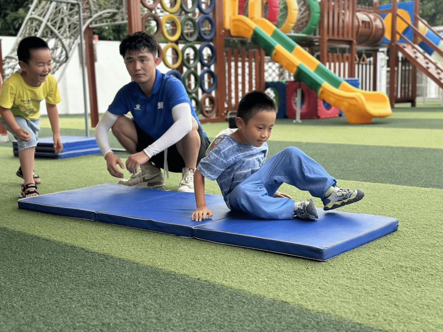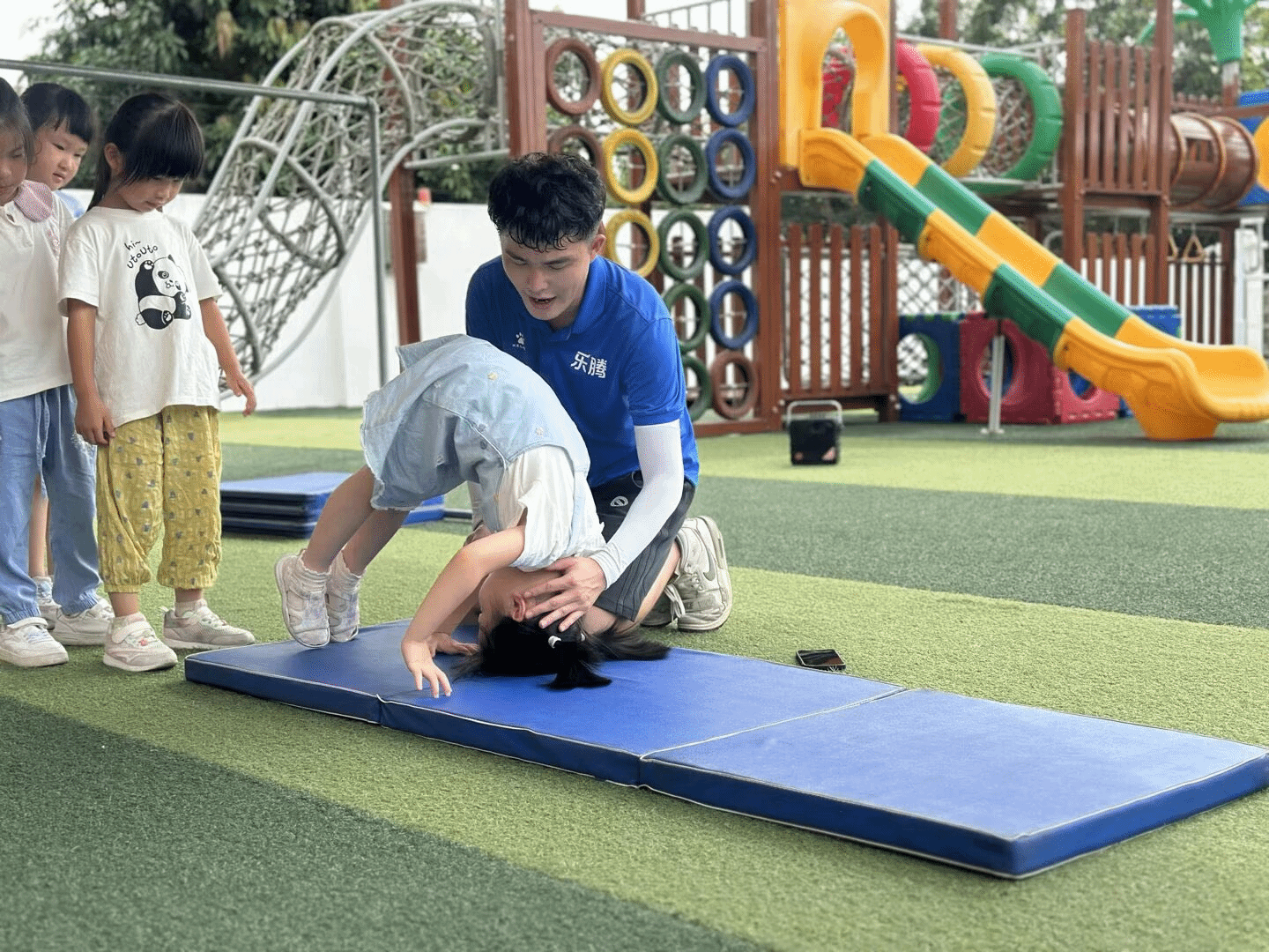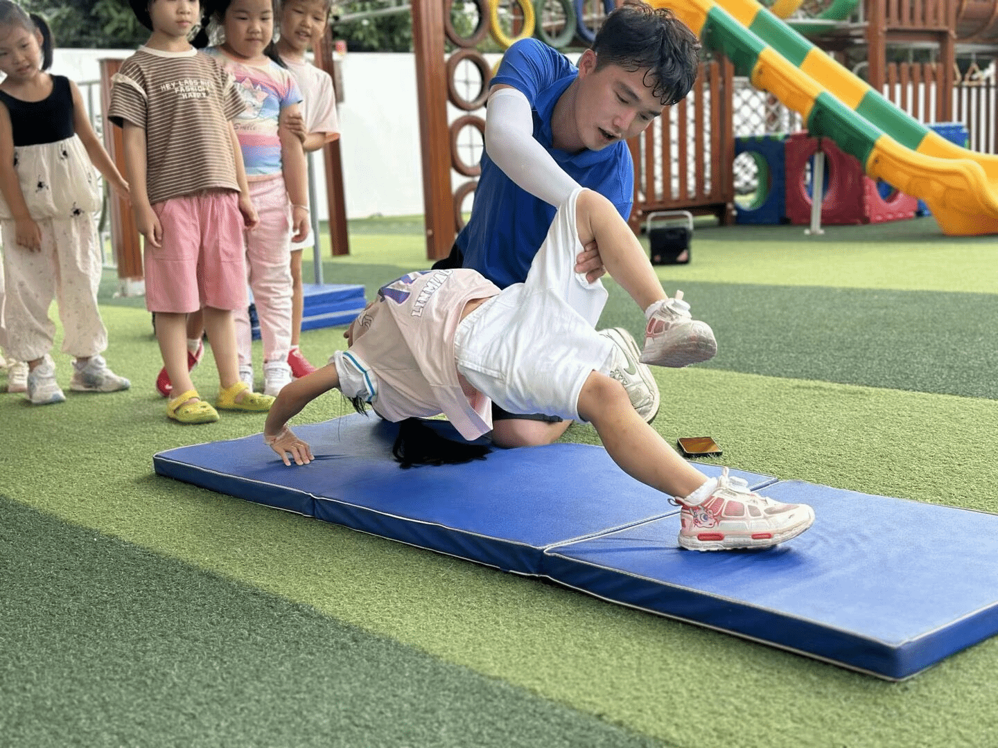 看!幼儿园的体能课堂上,闪电哥哥正耐心指导孩子完成前滚翻训练。在蓝色软垫的保护下,孩子积极参与,在他们心中种下了勇敢尝试的种子。