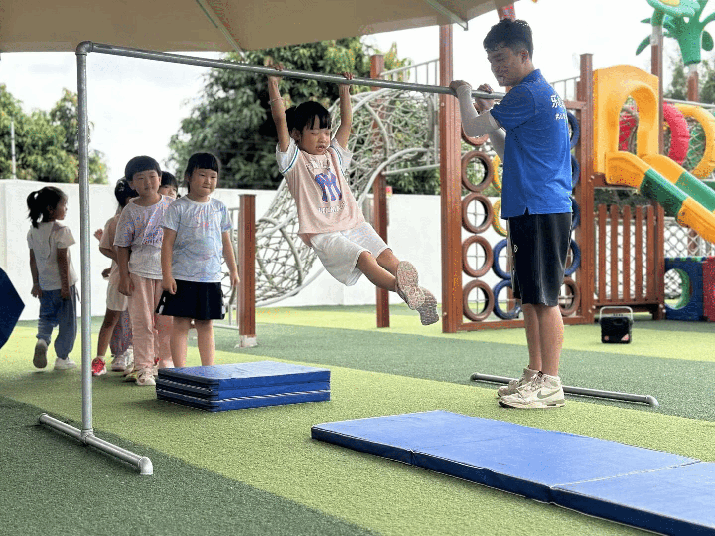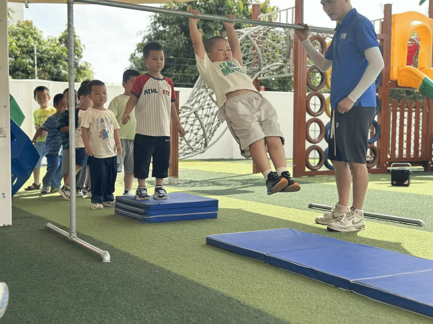 幼儿园的体能训练现场超燃!小朋友在闪电哥哥的守护下挑战单杠,小小身躯爆发出大大能量,排队等候的小伙伴们满眼期待。这不仅是一次体能的锻炼,更是对勇气与毅力的考验,每一次坚持都在见证孩子的成长。