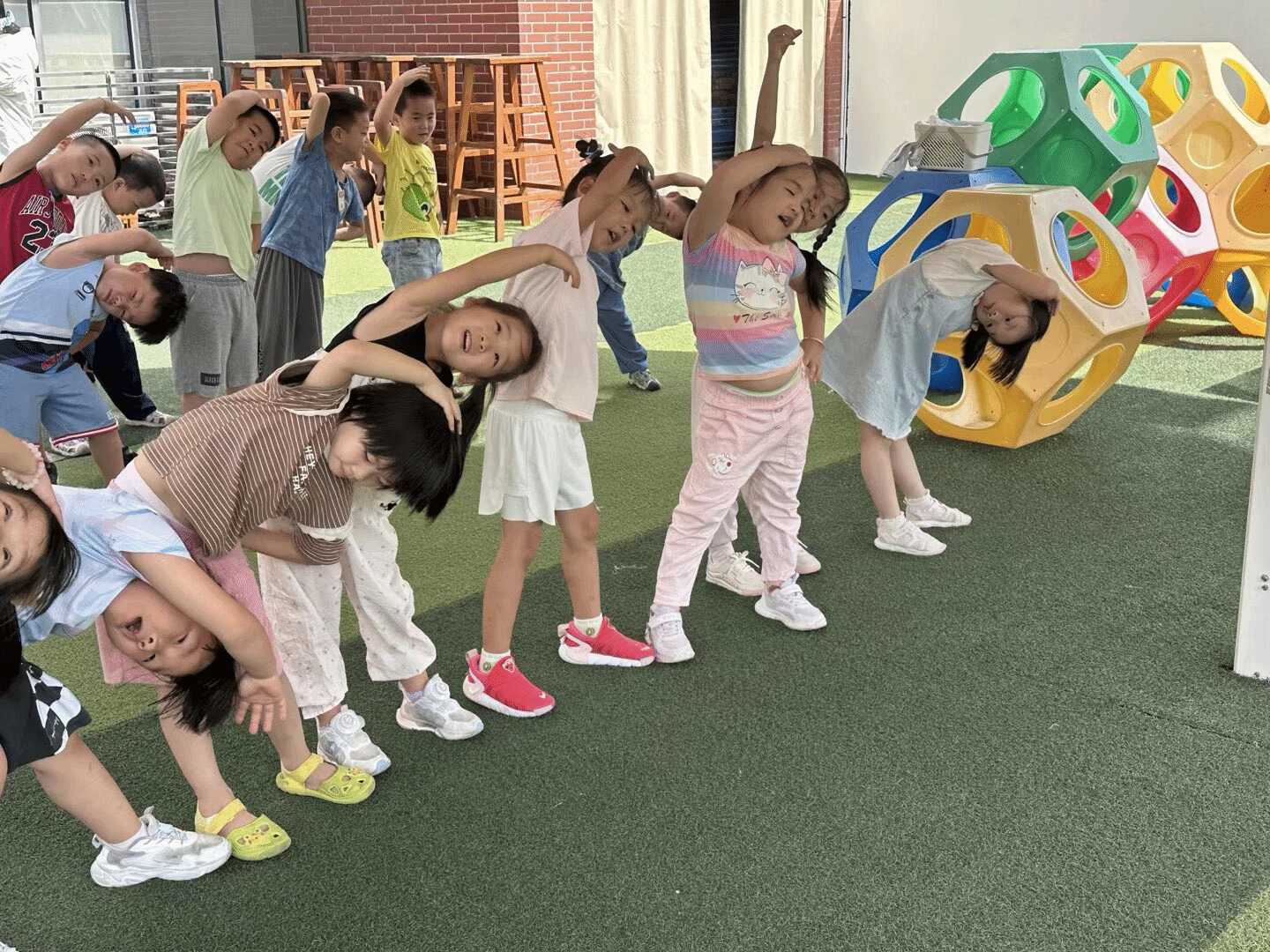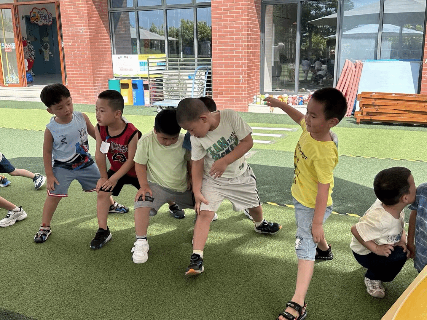 在幼儿园里,一群小小运动健将正尽情释放活力!他们或专注地摆出运动姿势,或兴奋地参与互动,在阳光下肆意挥洒童真。红砖建筑与缤纷设施相映成趣,为孩子们的游戏时光增添了一抹亮色,每一个动作都彰显着他们对运动的热爱与探索欲。