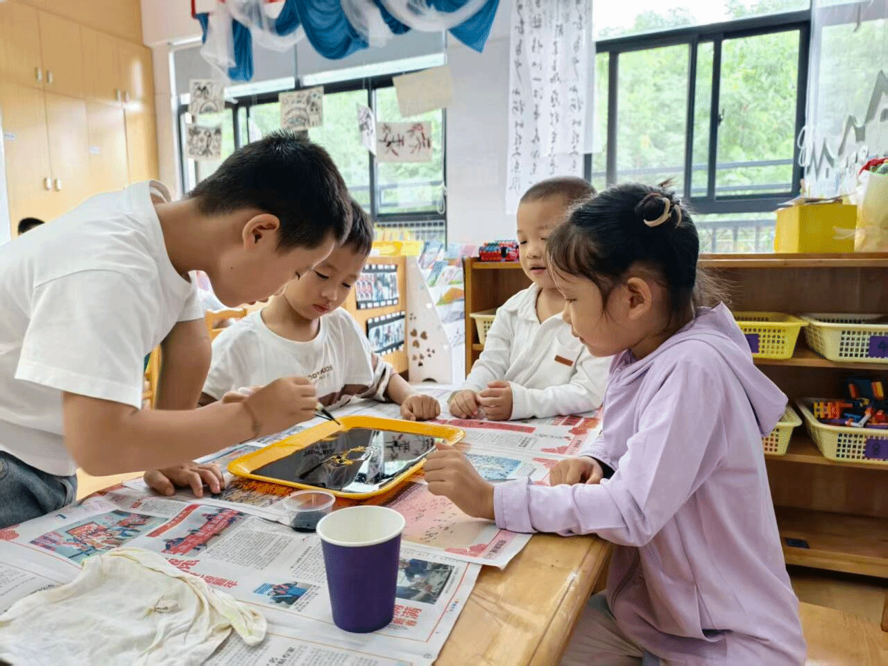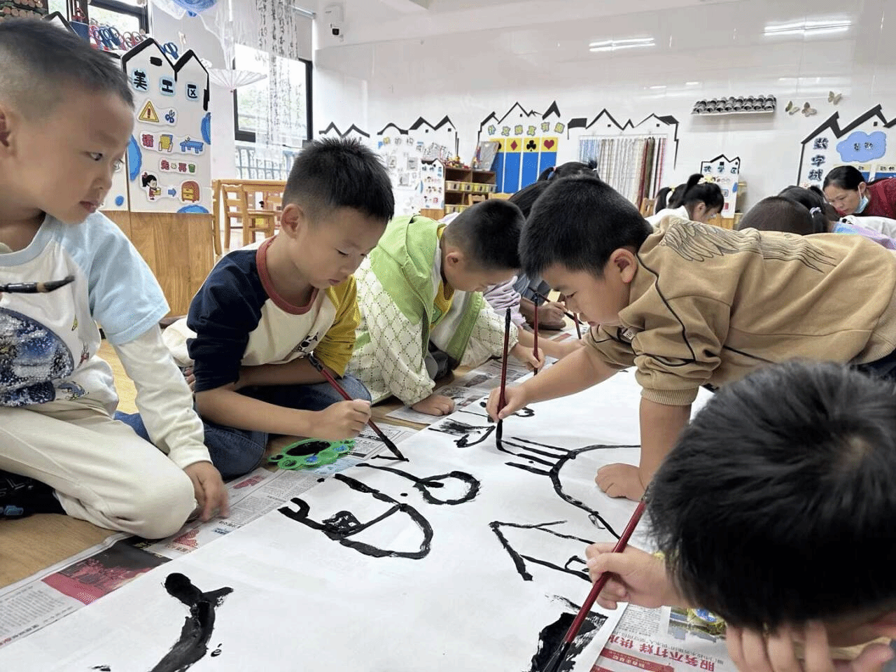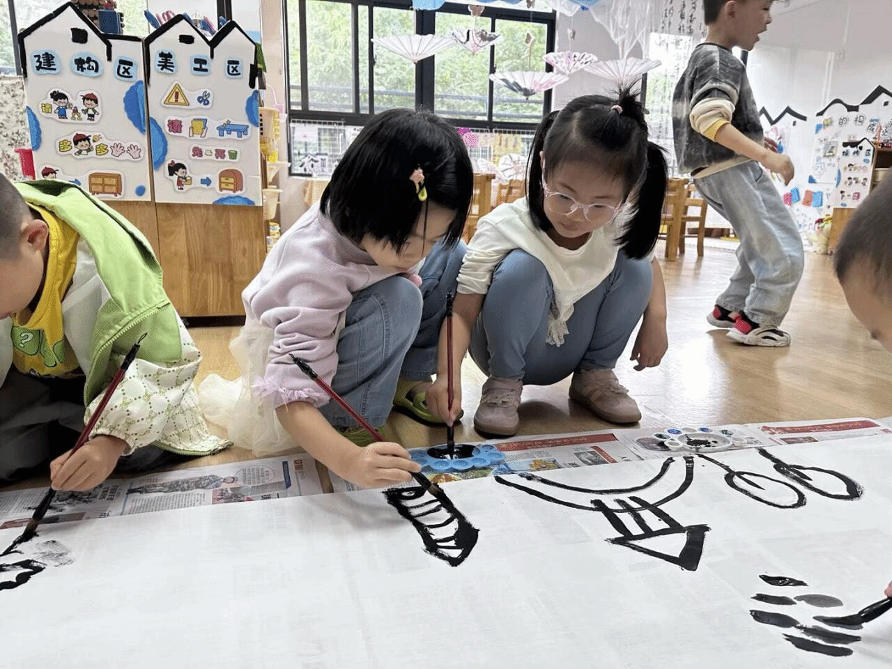 除了玩转户外游戏,室内也有百变玩法,走进大十班教室里飘起了淡淡的墨香:小朋友们举着毛笔,和旁边的小伙伴凑在一起研究笔锋,大家一起认识这支“神奇的笔”能画出什么——传统文化的启蒙,就是从这双好奇的眼睛开始的。