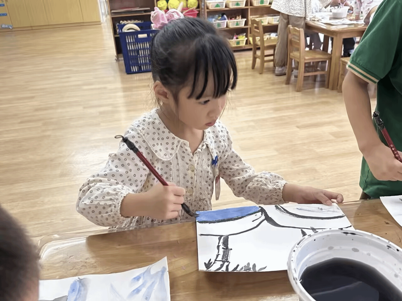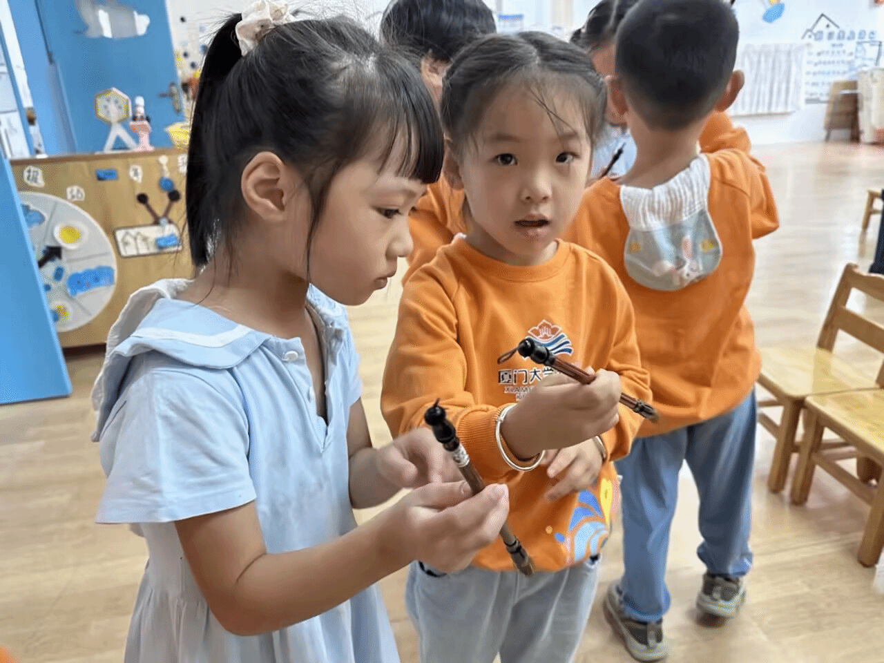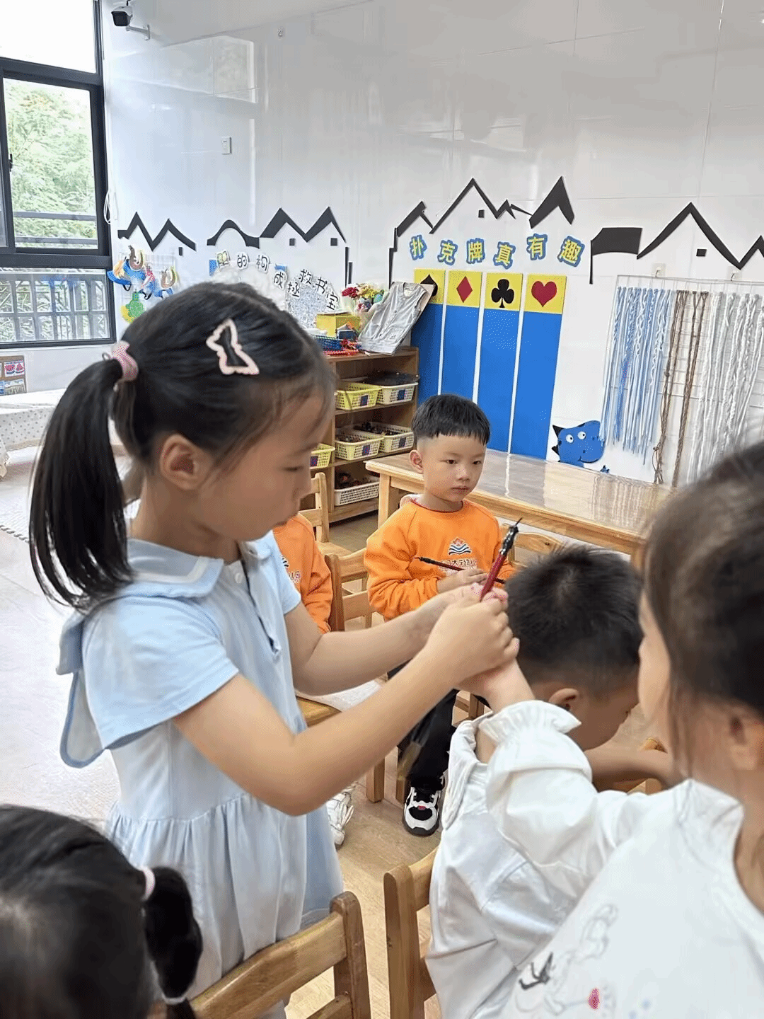 除了玩转户外游戏,室内也有百变玩法,走进大十班教室里飘起了淡淡的墨香:小朋友们举着毛笔,和旁边的小伙伴凑在一起研究笔锋,大家一起认识这支“神奇的笔”能画出什么——传统文化的启蒙,就是从这双好奇的眼睛开始的。