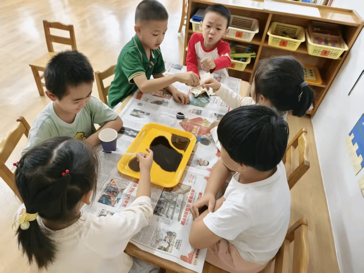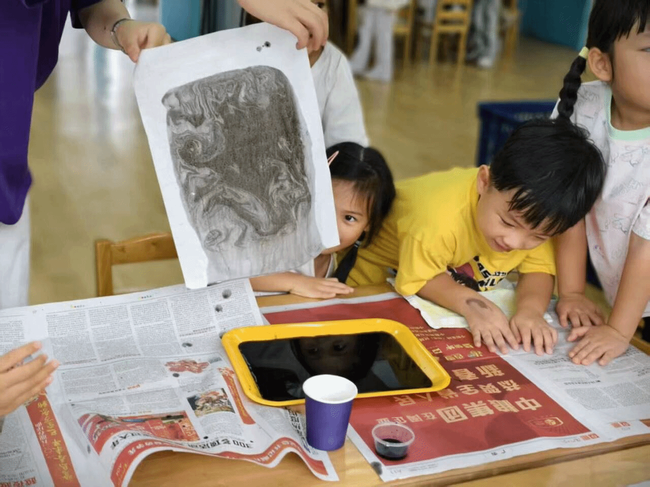 “哇——”的惊叹声从桌子边传出来:老师举着刚完成的水墨作品,小朋友们的小脑袋挤在一起,眼睛盯着纸上晕开的纹理,连趴在桌边的小璟都忘了擦手上的墨印。黄色托盘里的墨汁还在轻轻晃,这场“水墨变魔术”,成了今天最惊喜的小课堂。