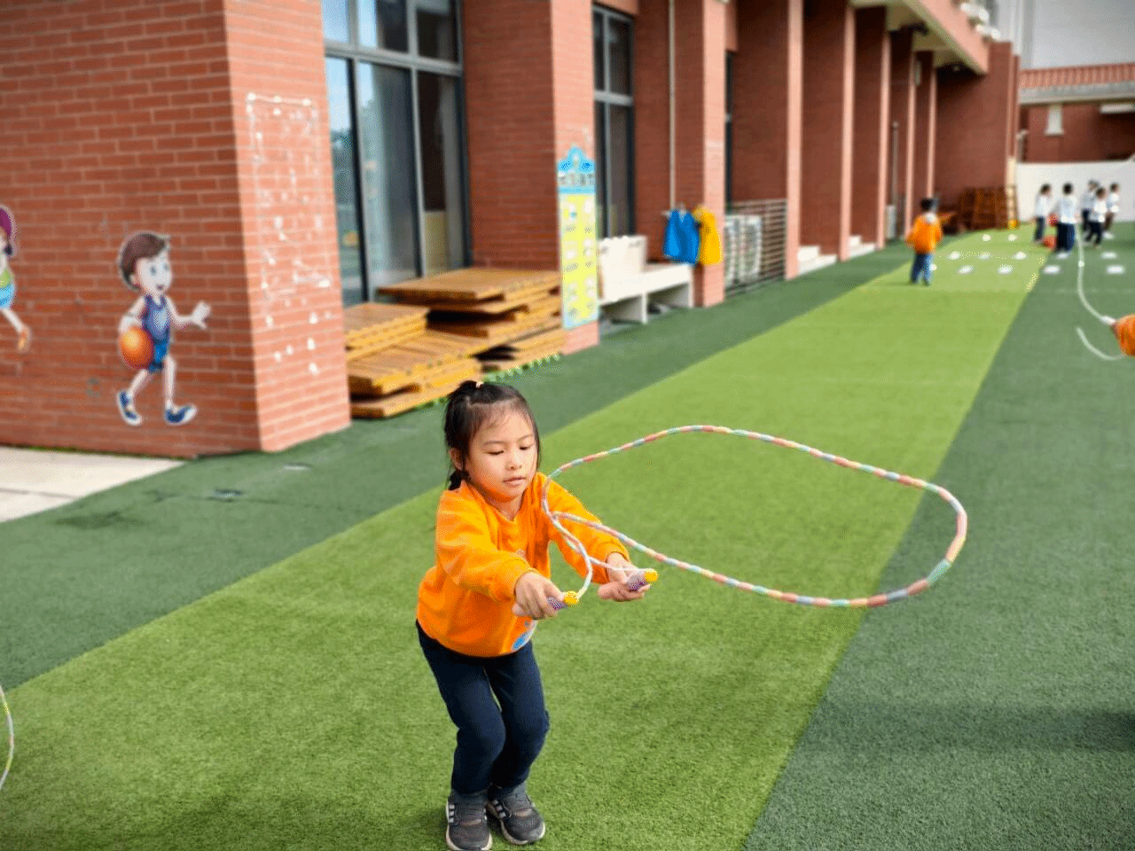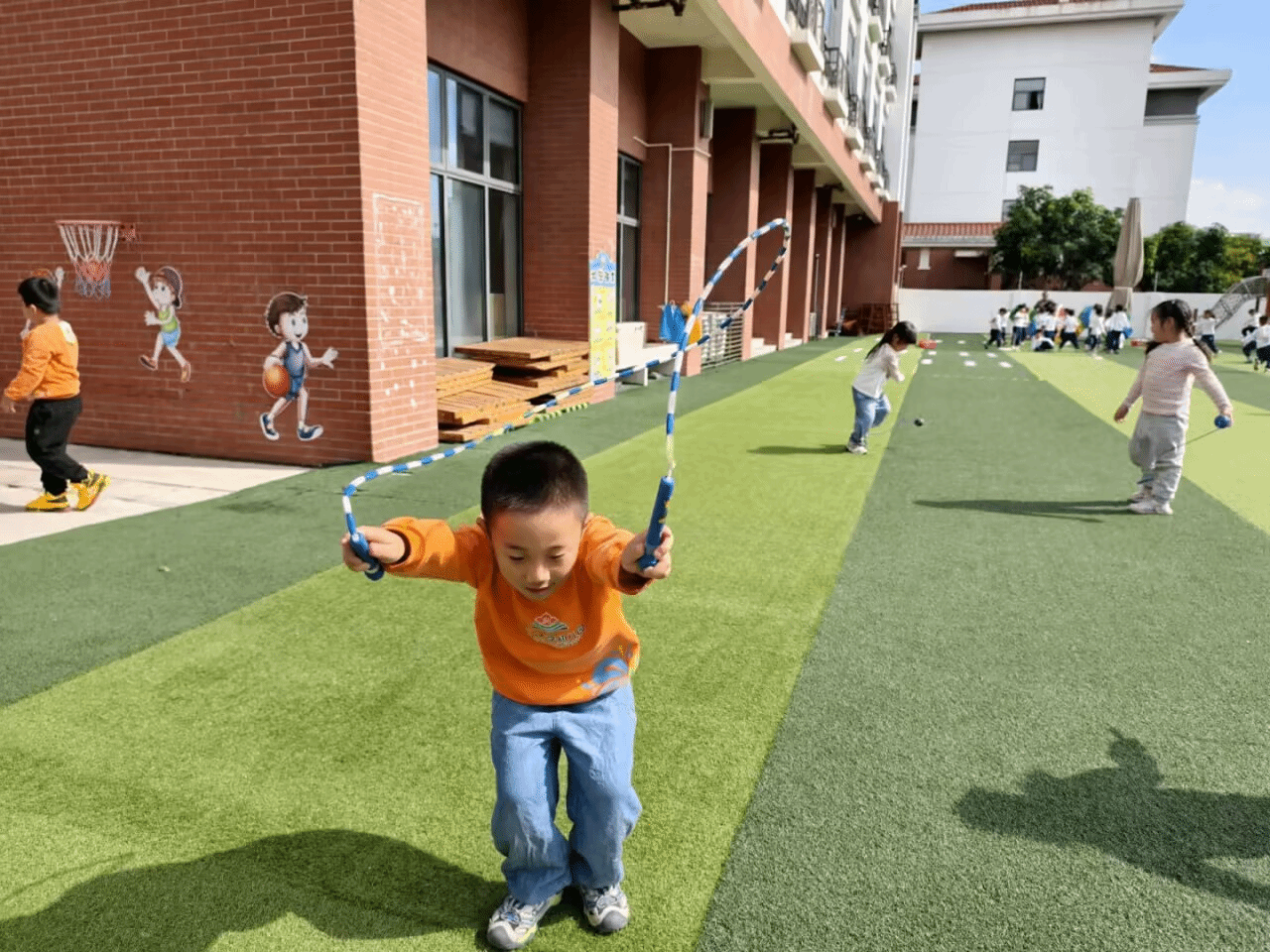 下一刻我们化身草坪上欢快跳跃的小兔!扎着马尾的诺诺、旗旗微微蹲身,双手攥紧绳柄,眼睛盯着跳动的绳子,认真的小表情像是在完成什么“大任务”。
