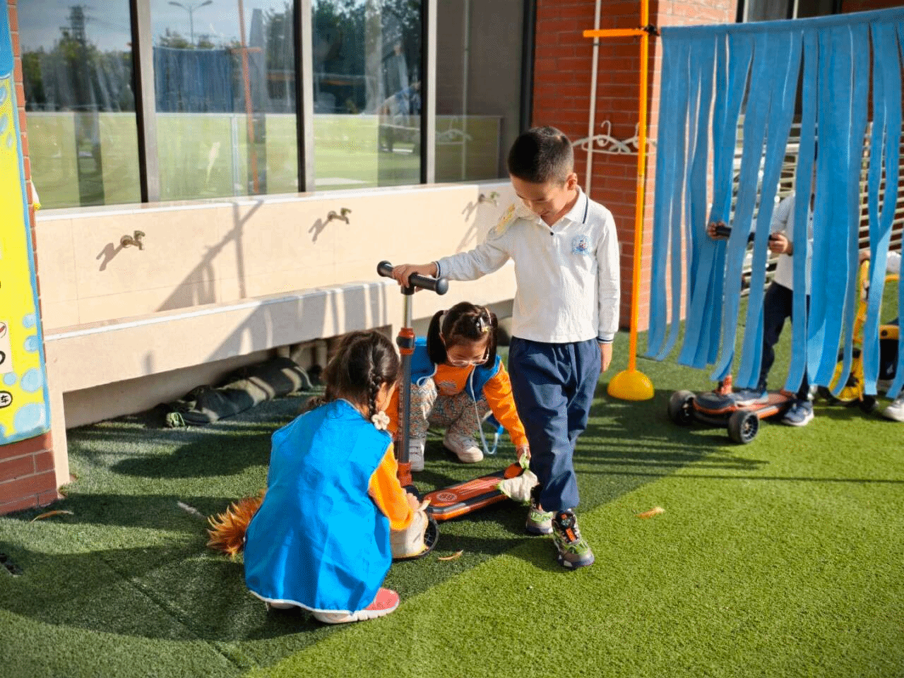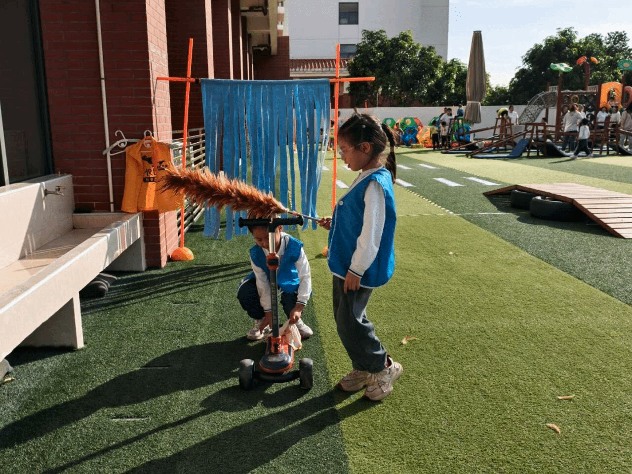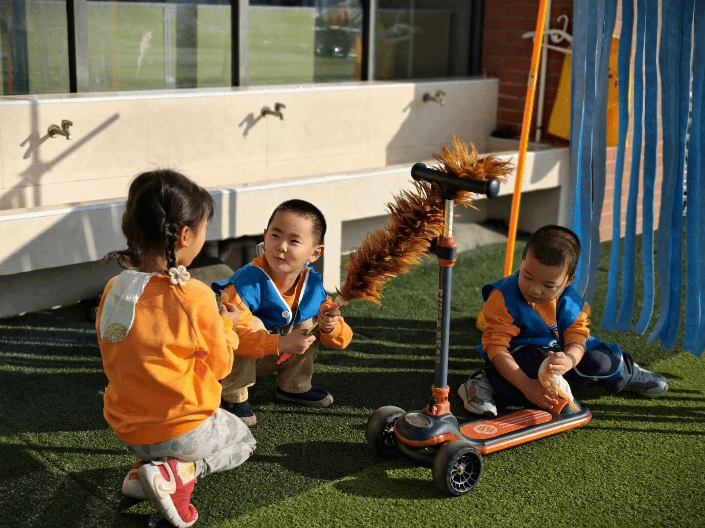 今天的户外区域,是小朋友们的“快乐实验场”:孩子们拿着毛茸茸的鸡毛掸子化身小小洗车工,旁边的滑板车还带着刚被洗刷过的“余温”。阳光把他们的影子拉得长长的,连墙根的水龙头都像是在偷偷围观他们童年的快乐。