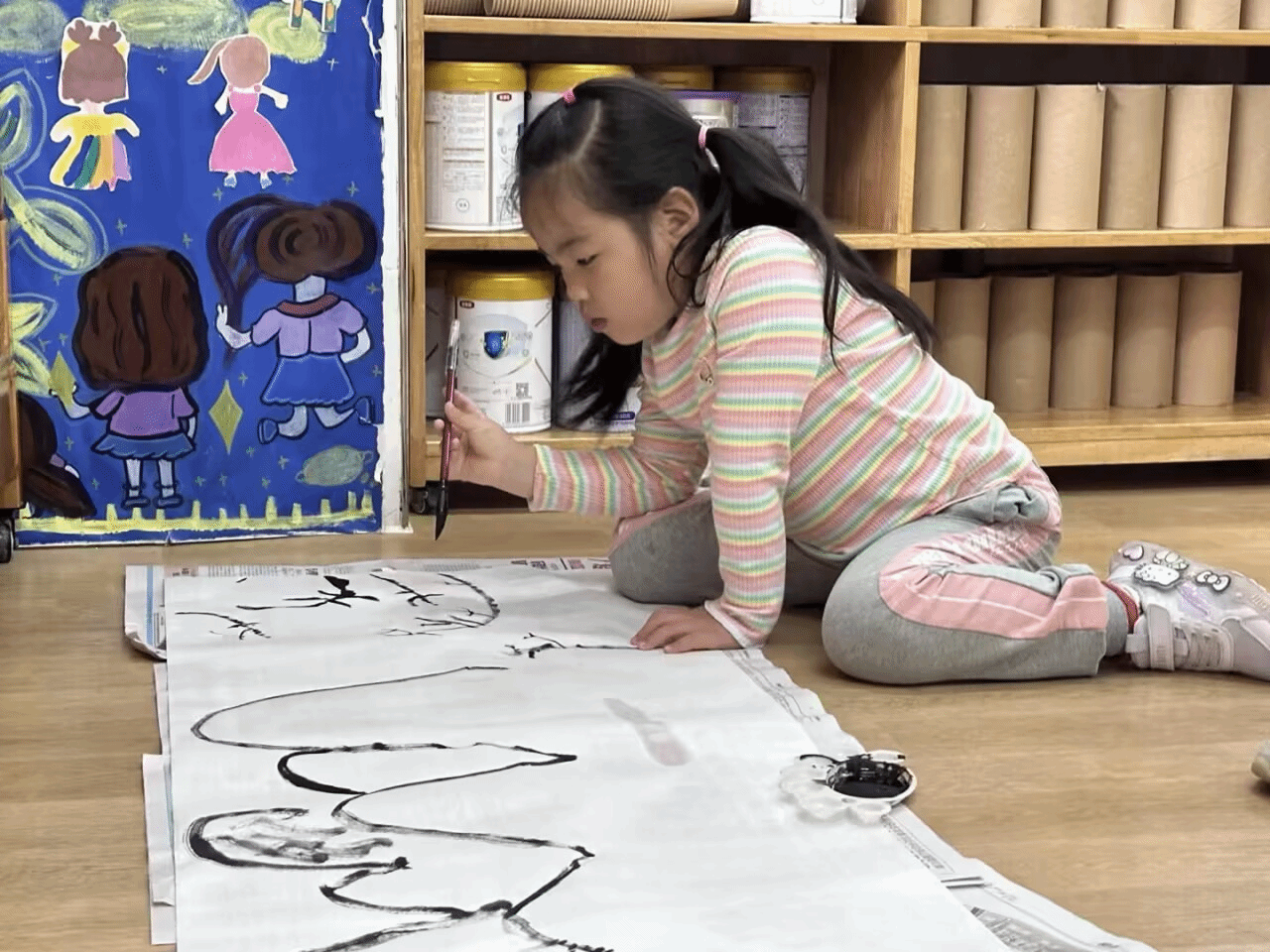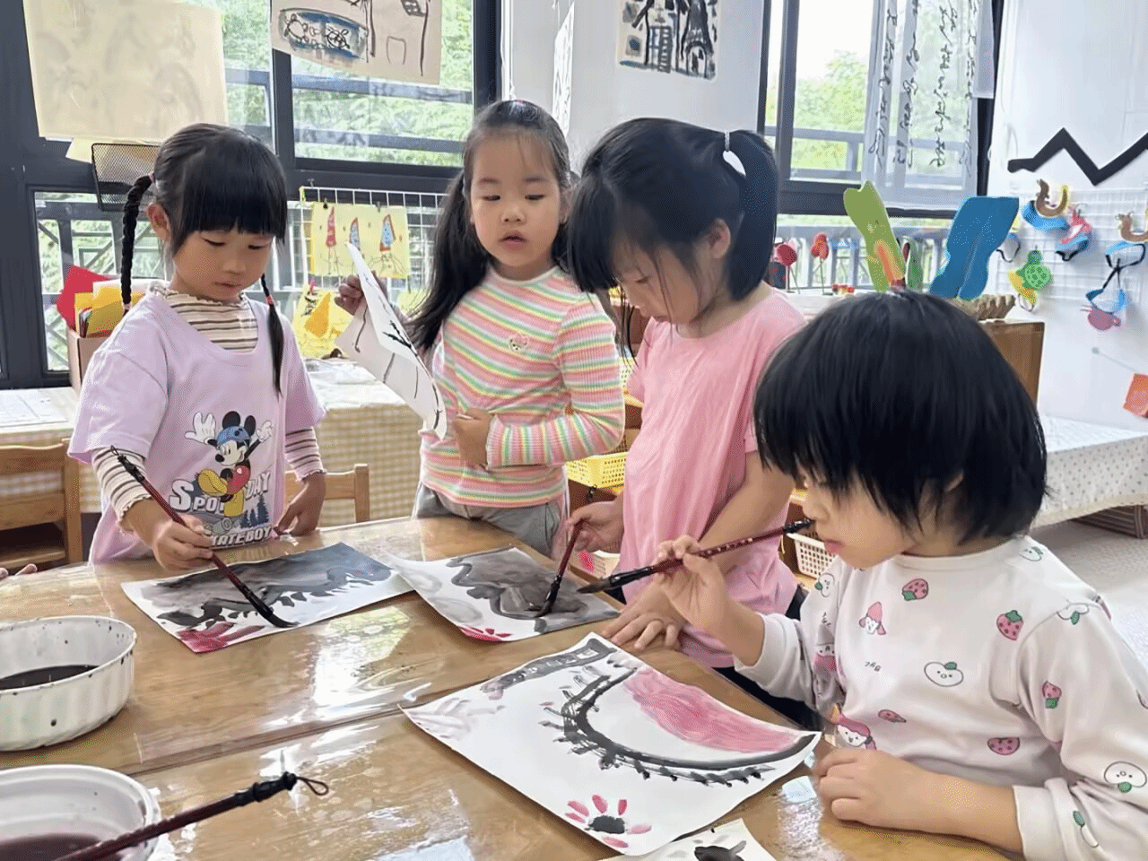 小桌子上的宣纸,是宝贝们的“甜系创作台”:彤彤拿着毛笔涂墨色,旁边的画画举着自己的作品分享,伊伊小朋友正认真给画添上粉色的小花。墨香混着小朋友的小声讨论,连窗外的树叶都像是在跟着轻轻晃——原来童年的画,连墨色都带着甜甜的温度。