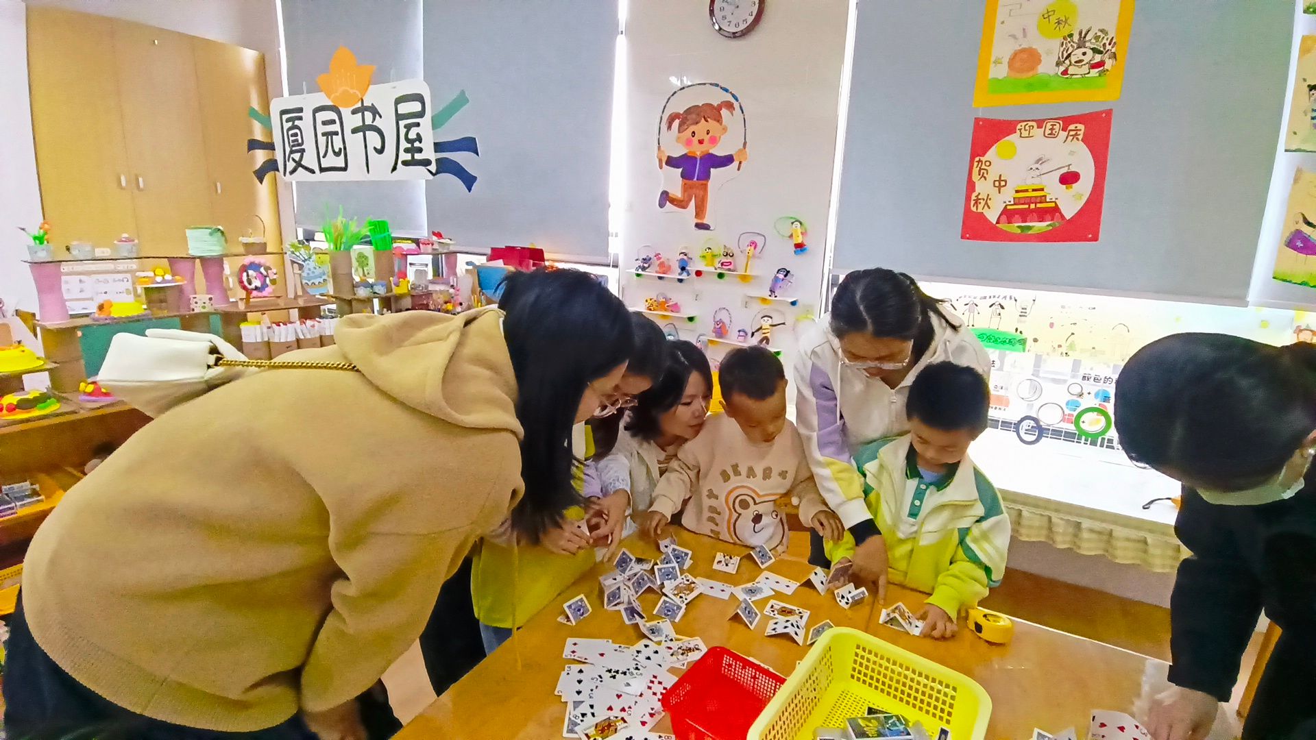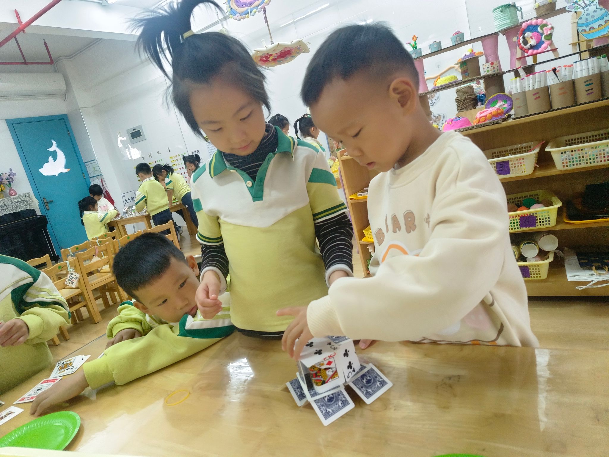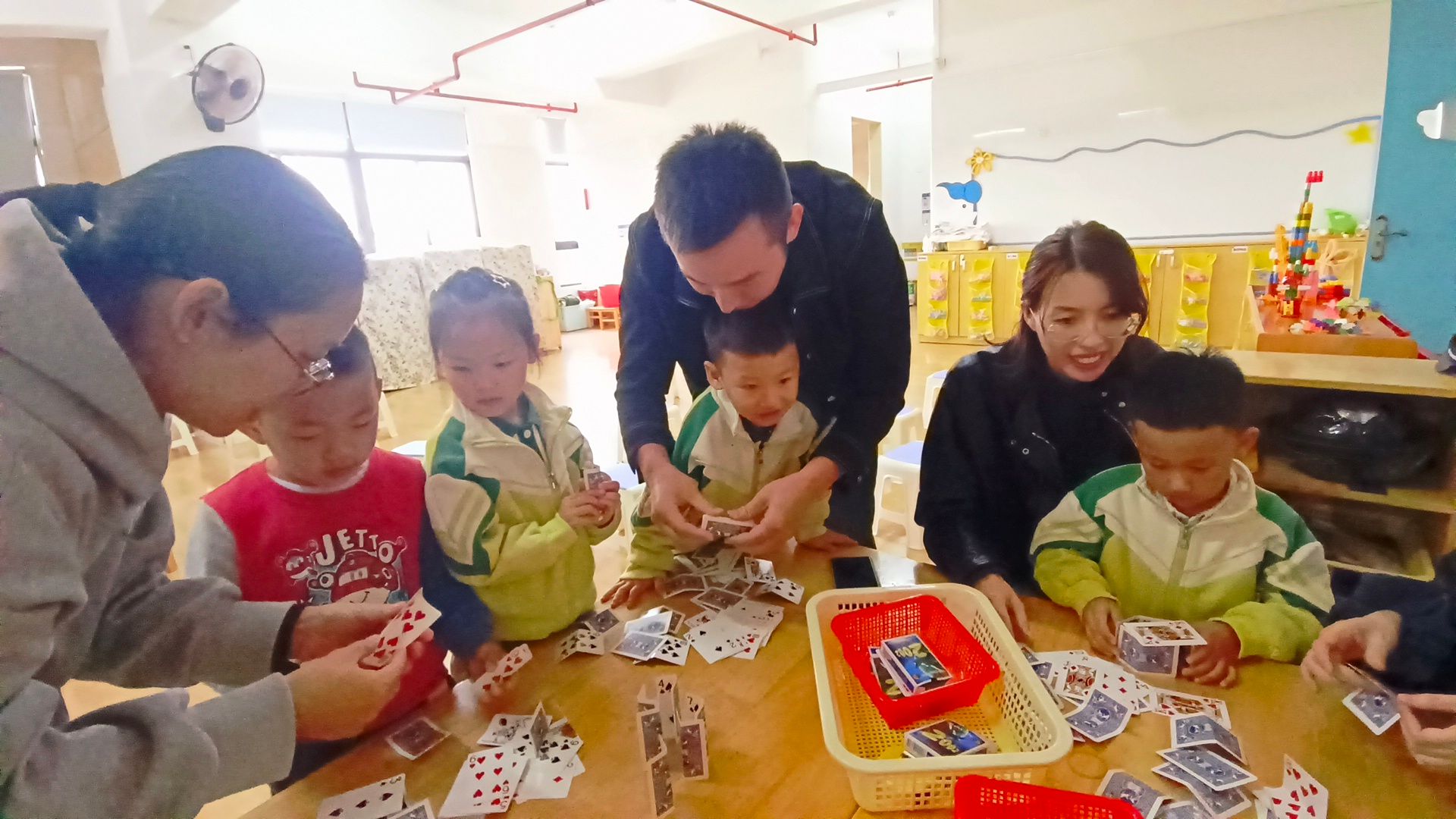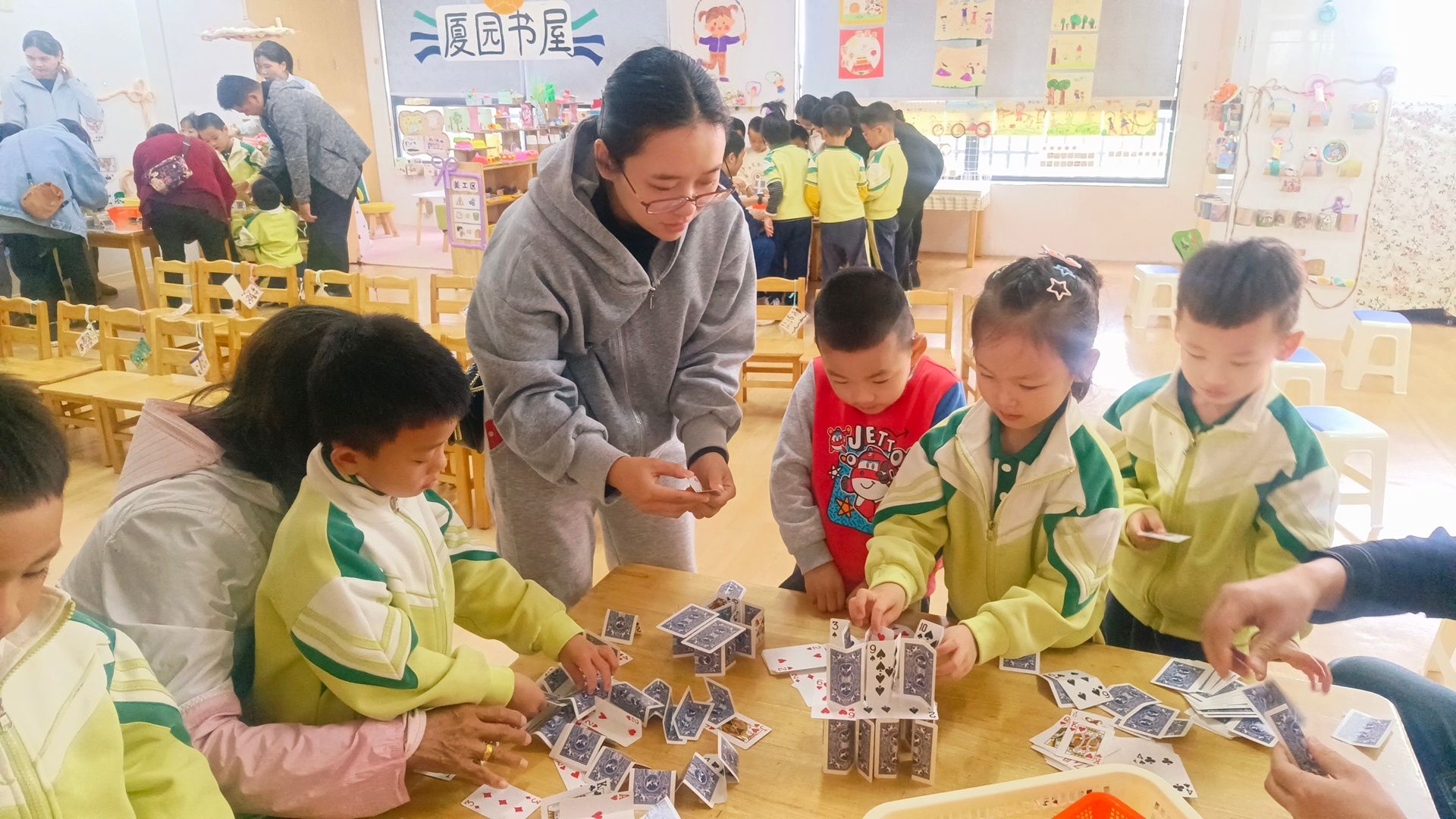 家长开放日当天,教室里热闹非凡。“爸爸妈妈快来看,我们搭的高塔!” 孩子们与家长携手,探索扑克牌搭建的秘密。大家小心翼翼地折叠、拼接,从简单的三角形到多层的 “城堡”,不断尝试着平衡与稳定的技巧。过程中,有失败的沮丧,更有成功的欢呼,亲子间的默契配合、相互鼓励,让小小的扑克牌变成了连接爱与智慧的桥梁,也让家长们近距离感受到了孩子们的动手能力与创造力。